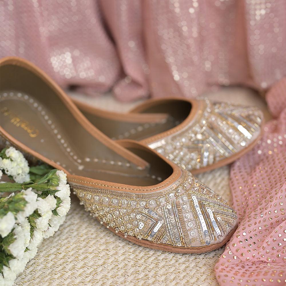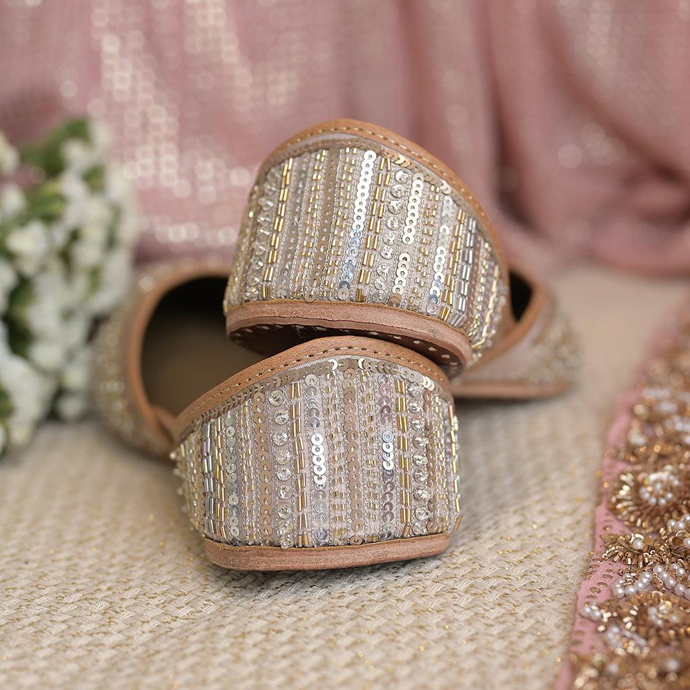 Hand embroidered sequins and beadwork done in shades of gold and silver in a geometric pattern, set on a nude colored base with a striped embroidered back