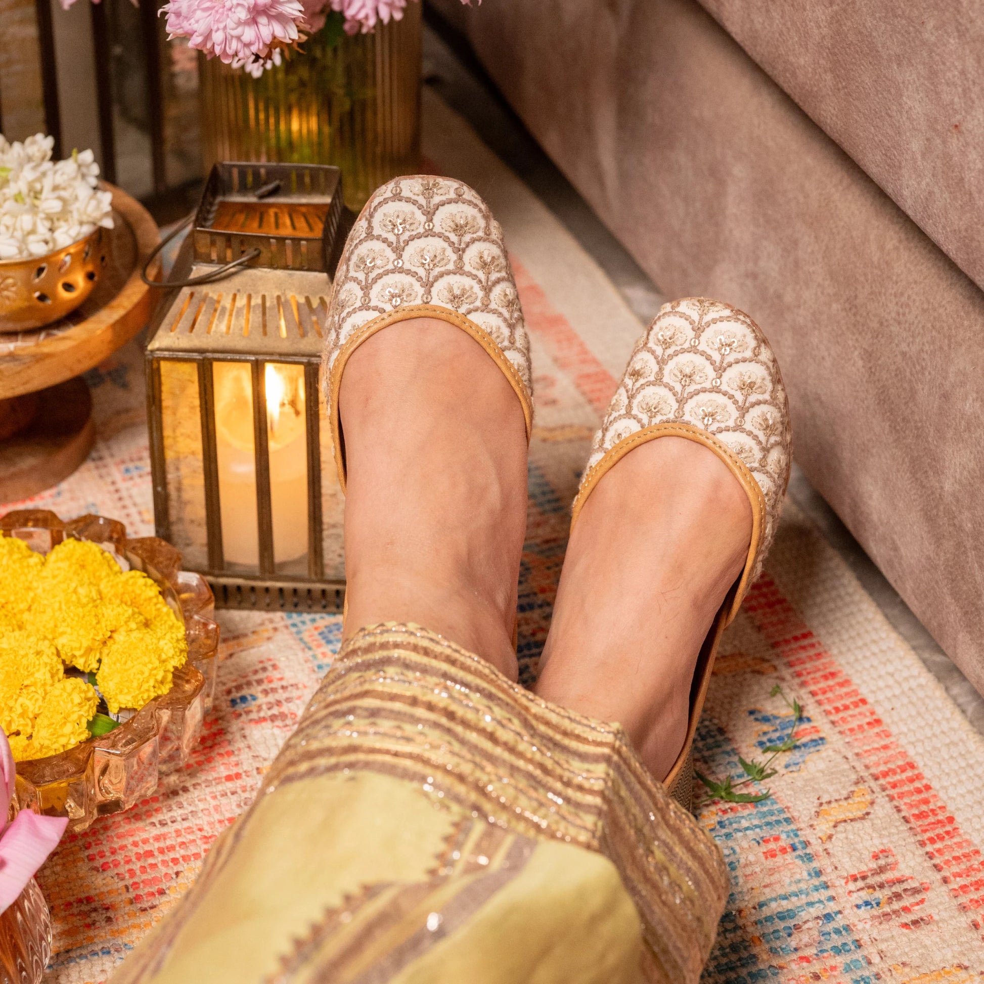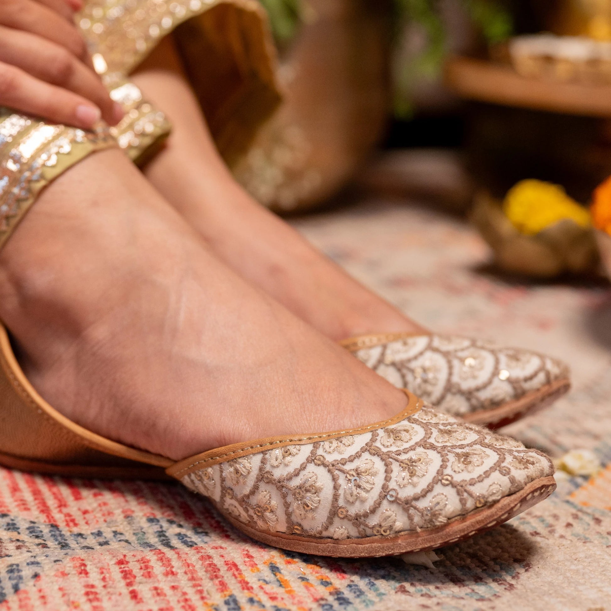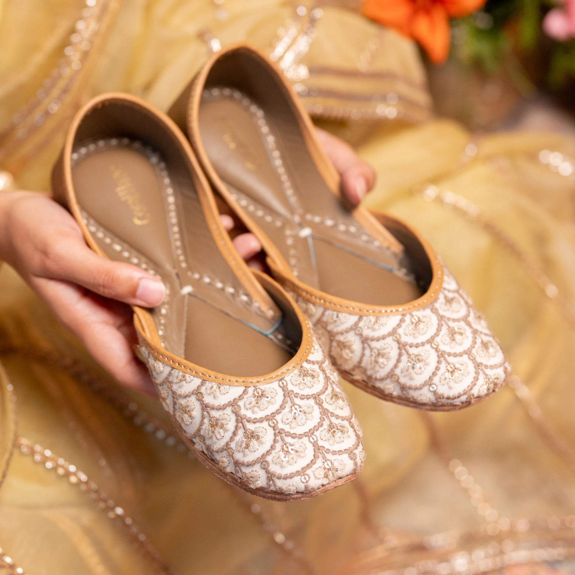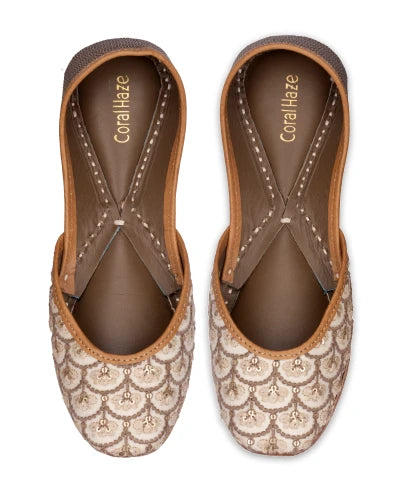 Ivory and beige thread work juttis with sequins highlights and a shimmery gold back