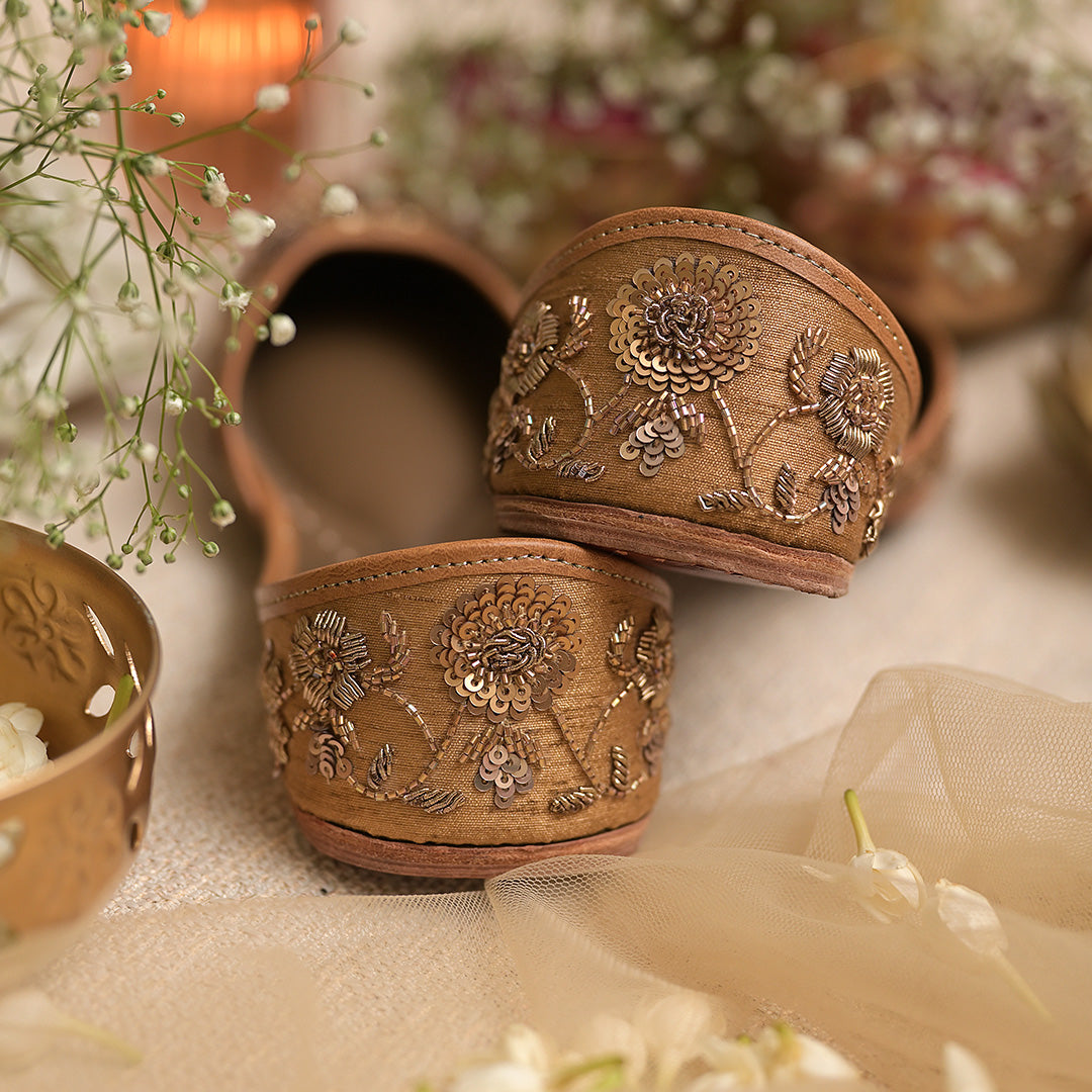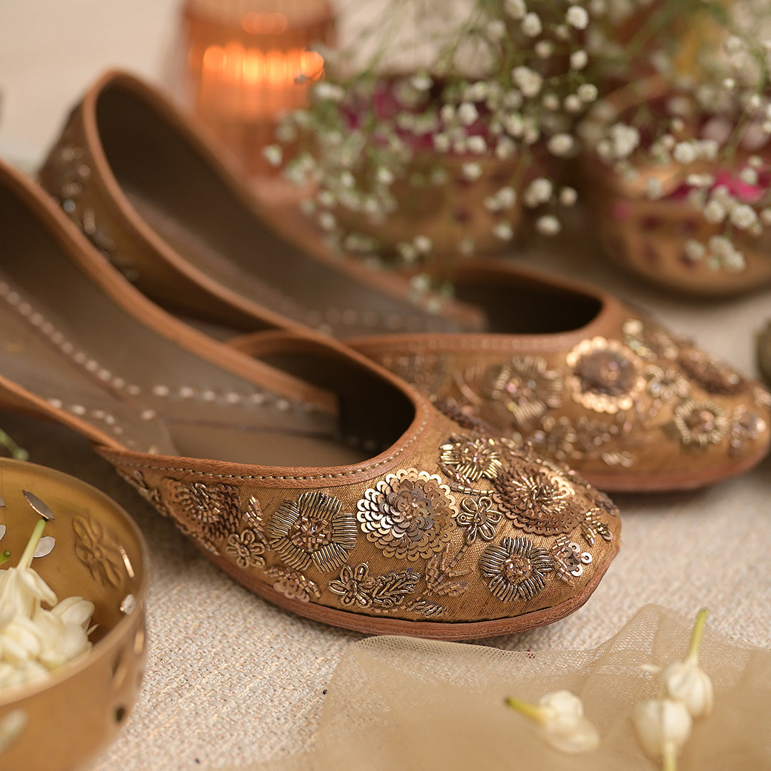 Antique gold juttis, hand embroidered with zardozi and sequins work on the front and back