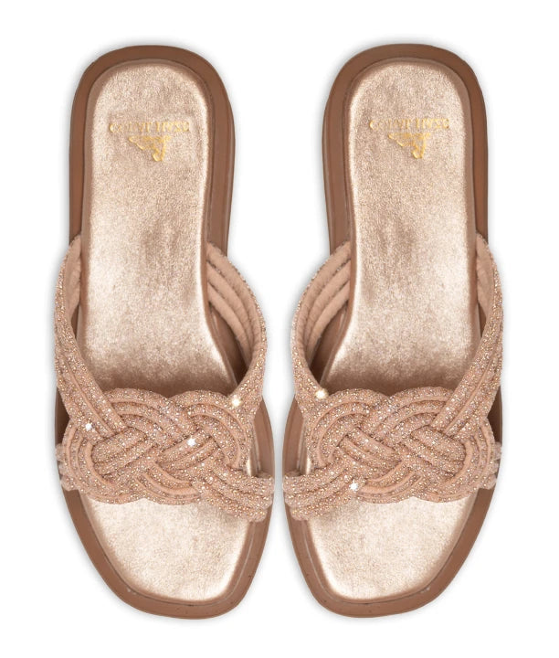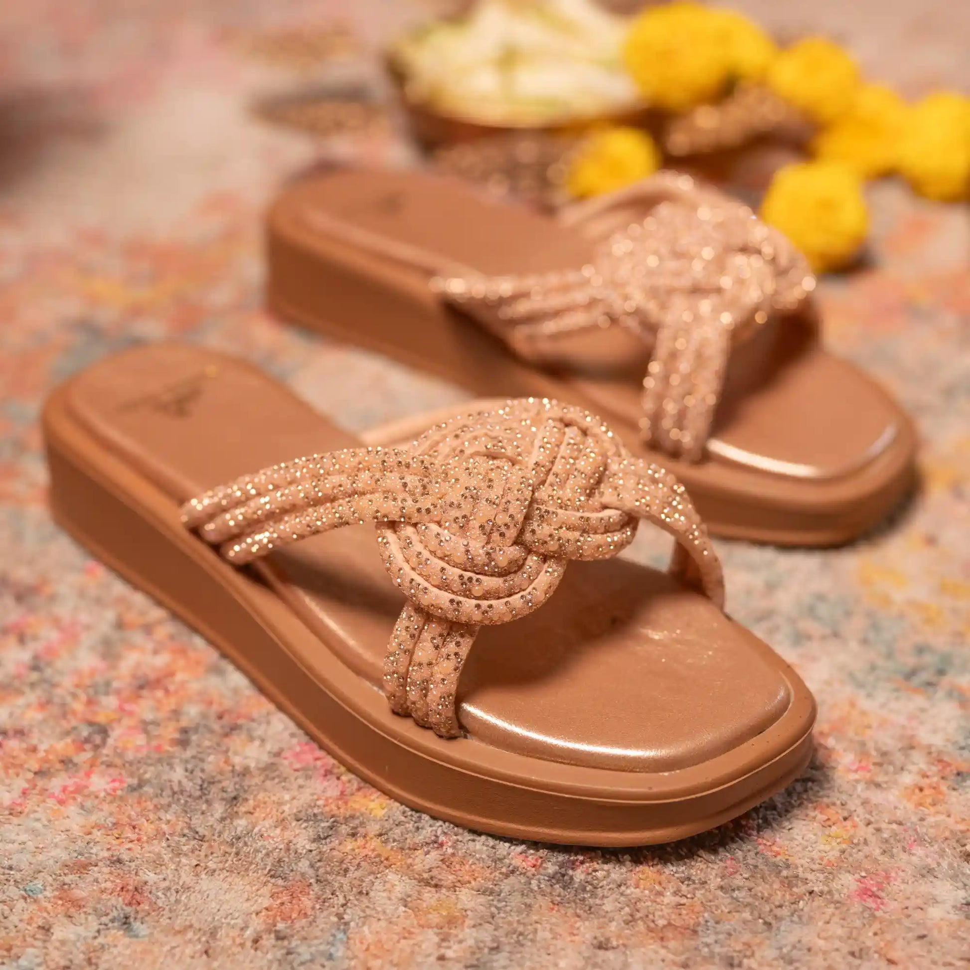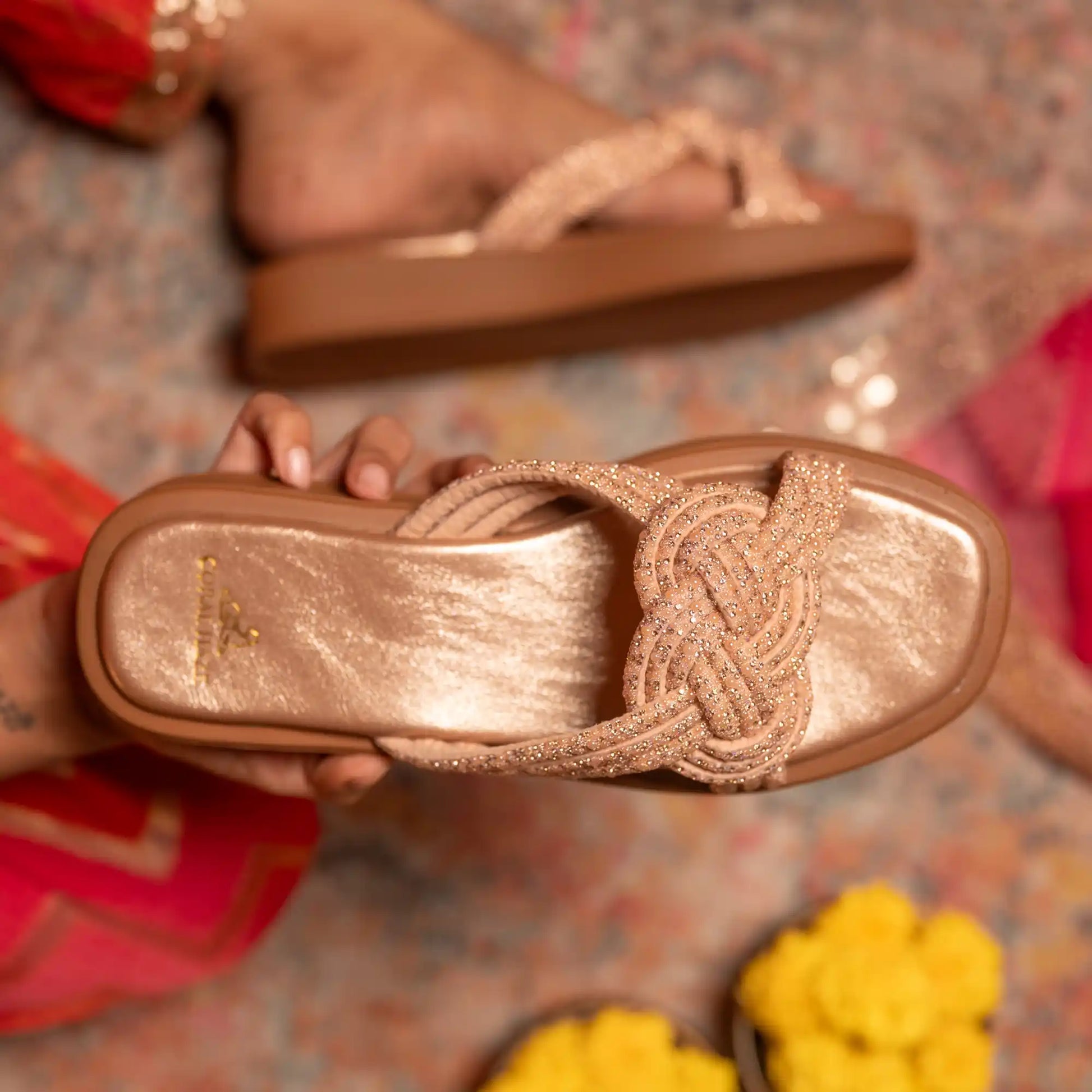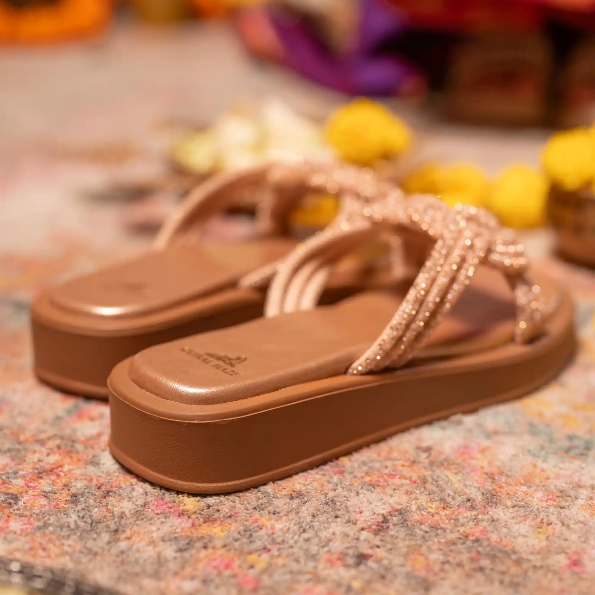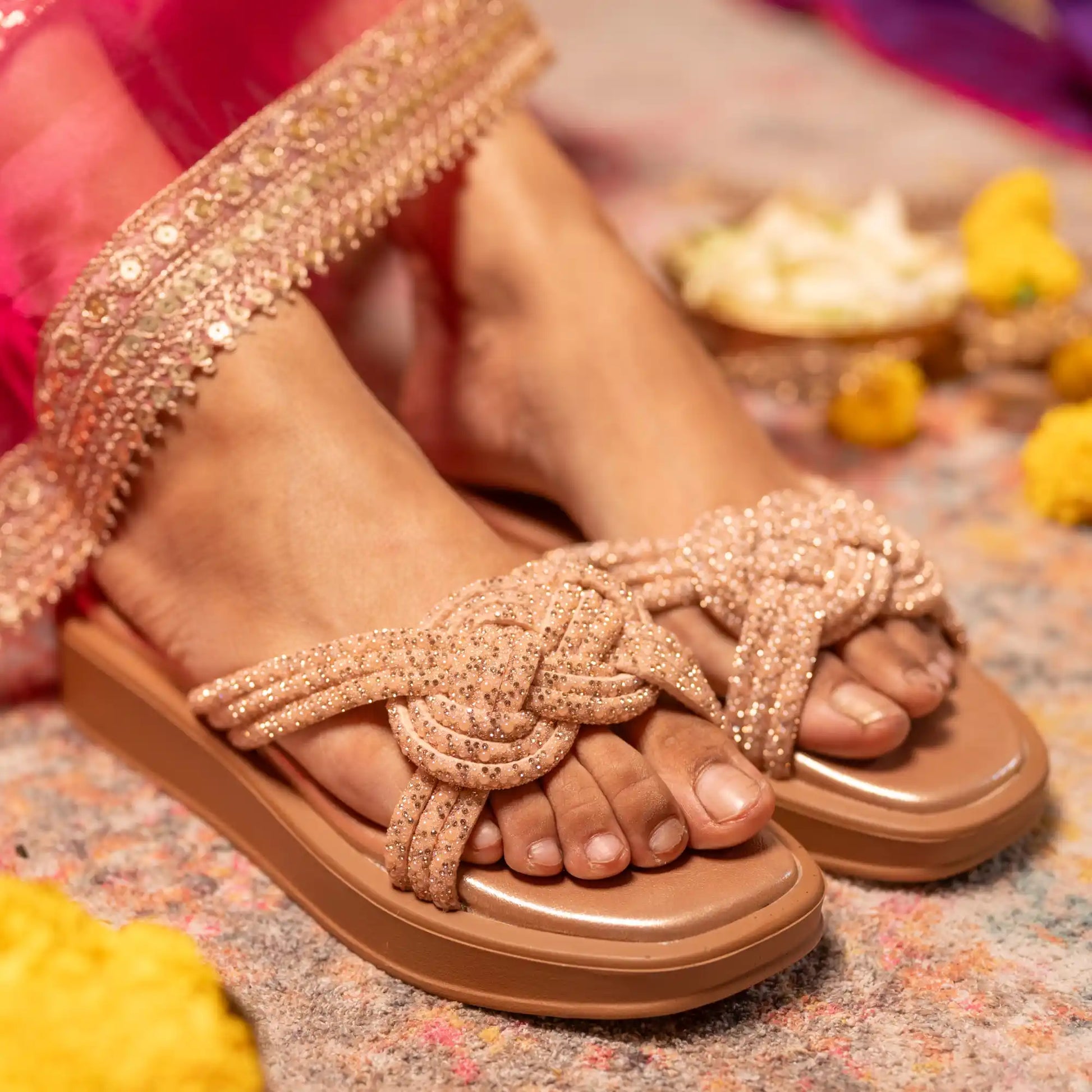 Rose-gold platform sliders with multiple rhinestone straps woven in a knot