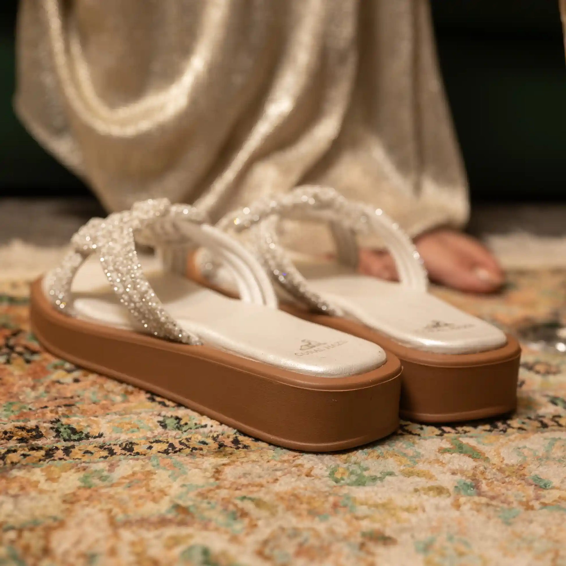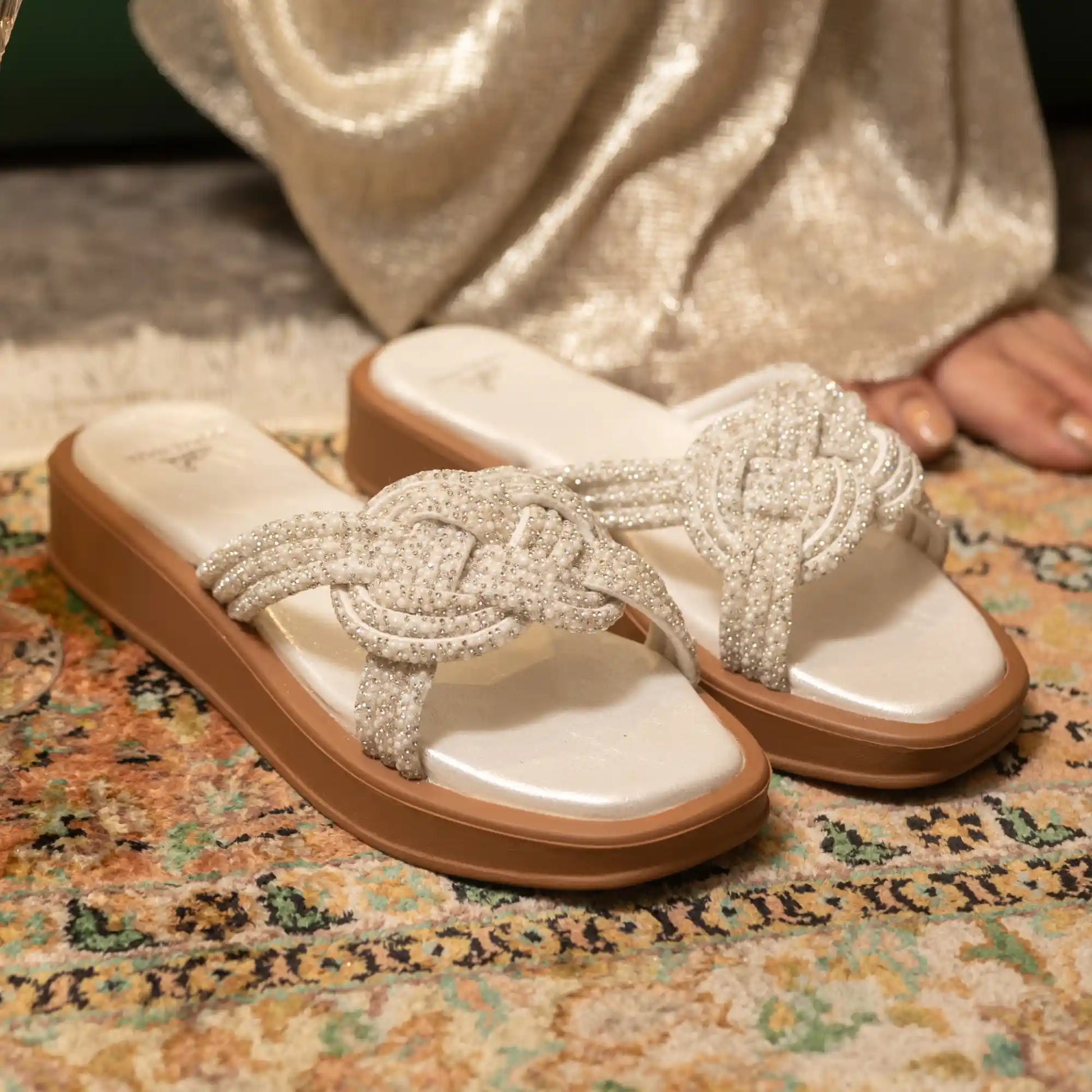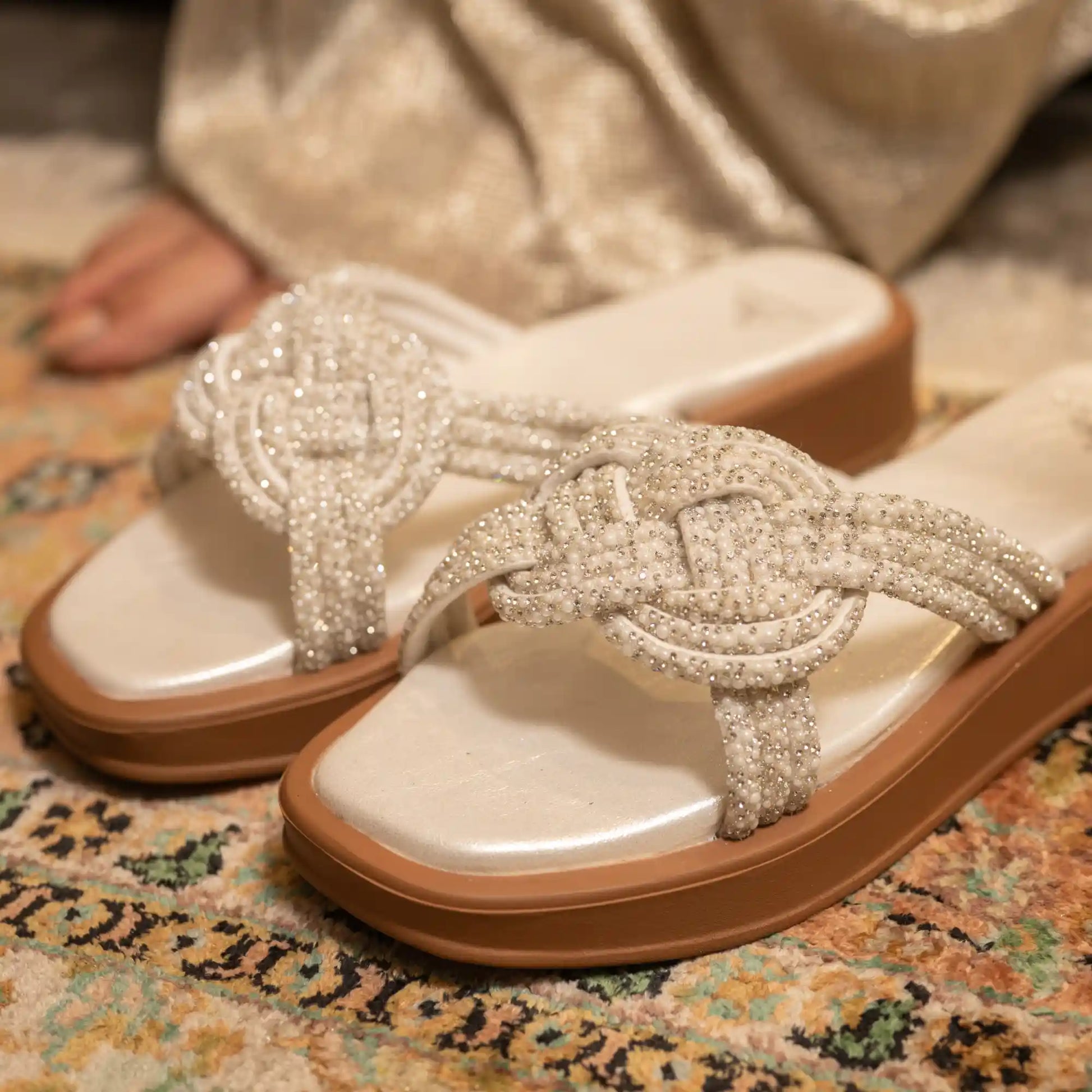 Pearl white platform sliders with multiple rhinestone straps woven in a knot
