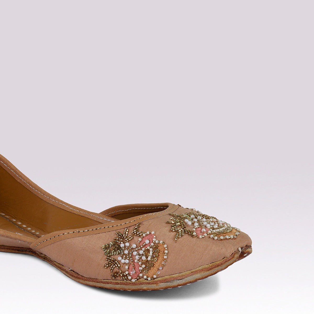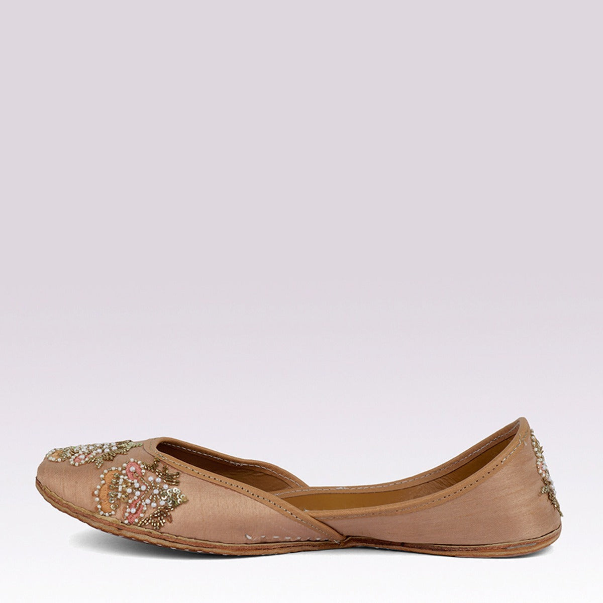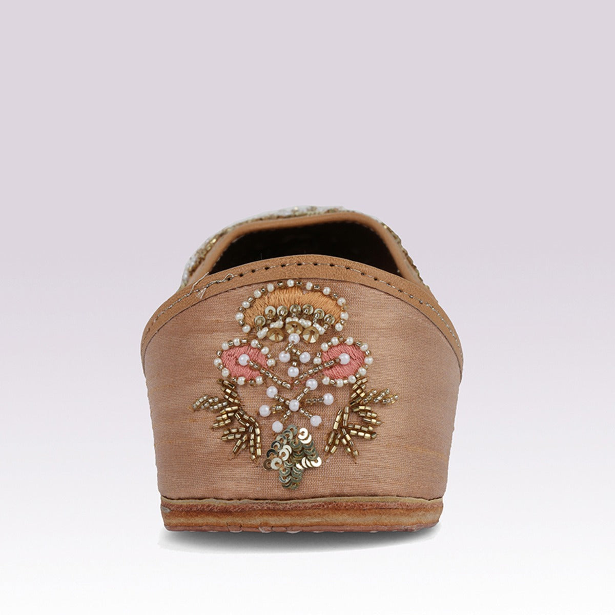 Beige Gold colored base with floral motifs embroidered in pearls, sequence and colored thread.