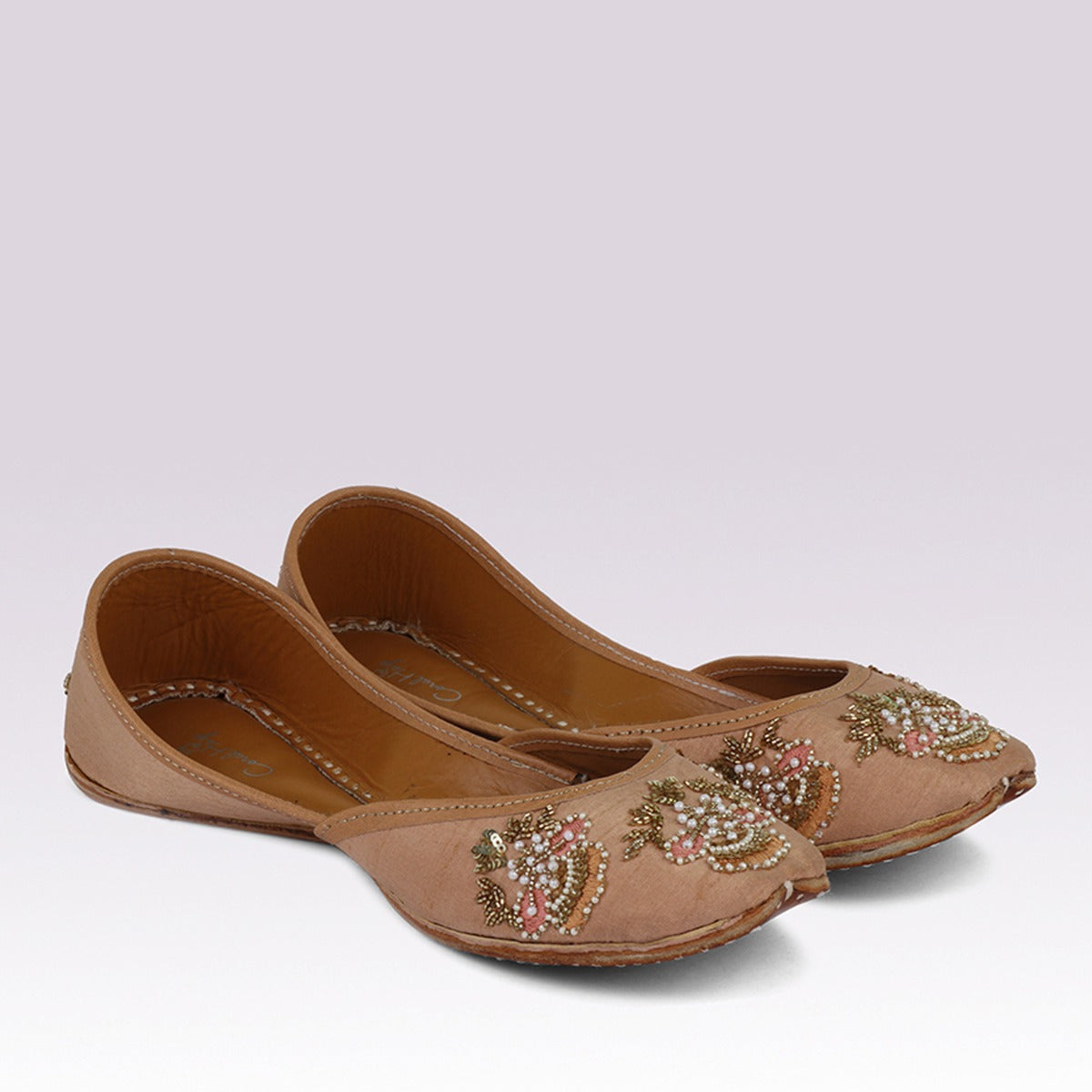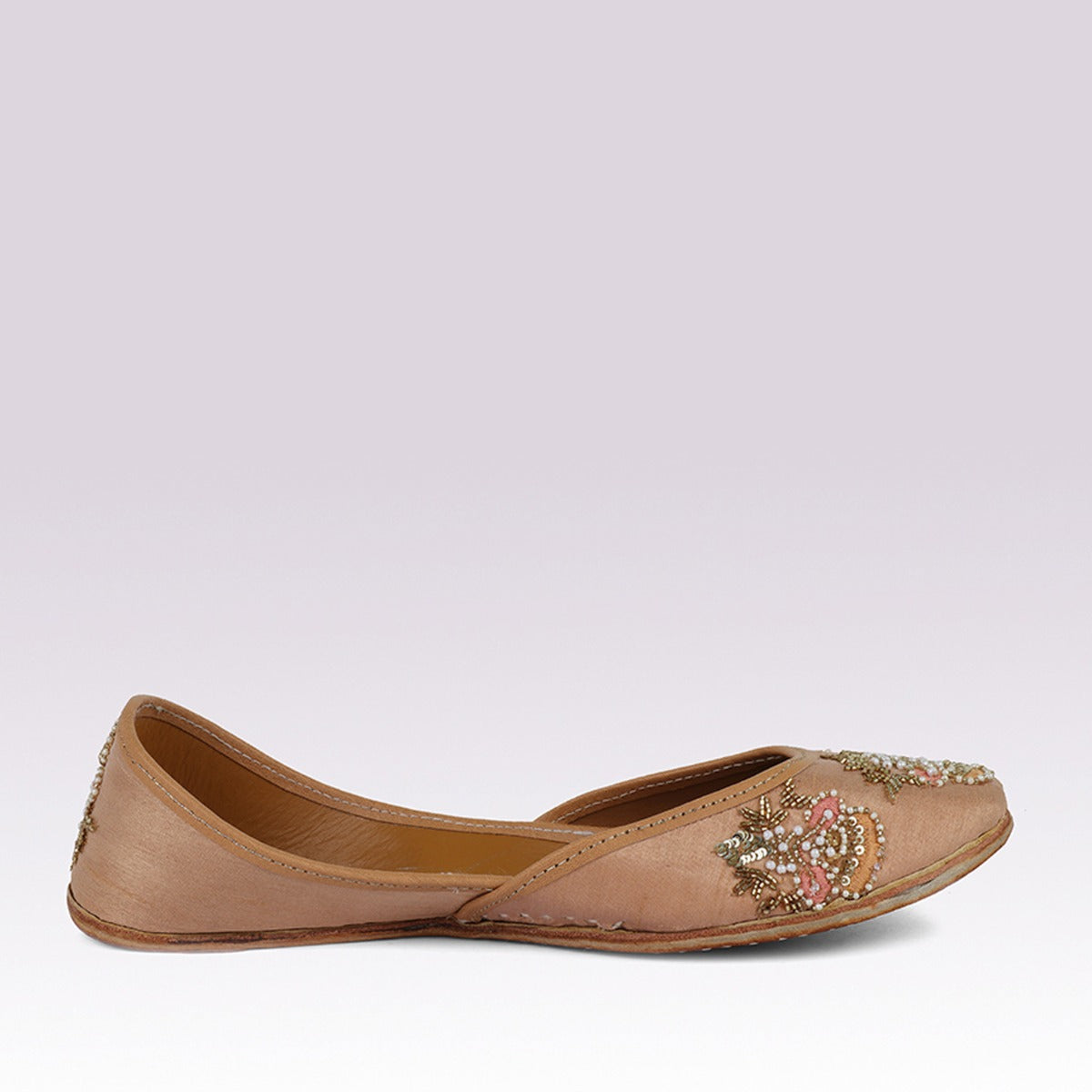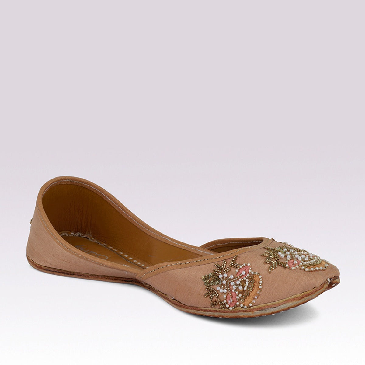 Beige Gold colored base with floral motifs embroidered in pearls, sequence and colored thread.