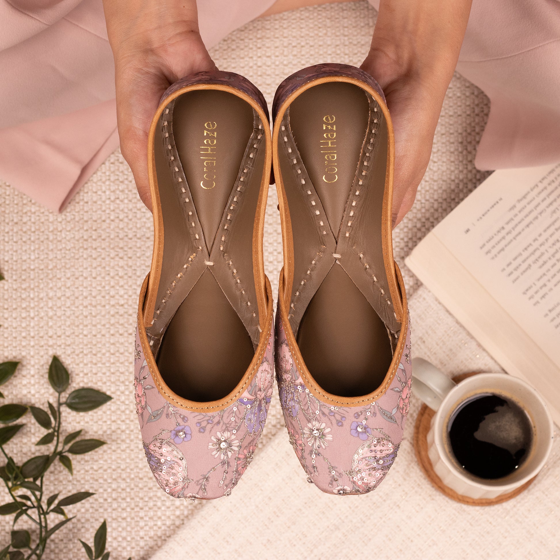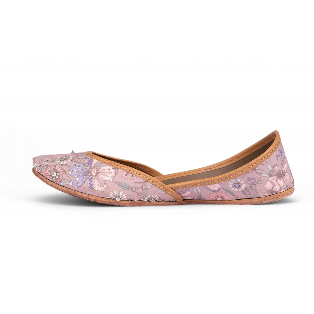 Light lilac bird print juttis with hand embroidered sequins and zari work