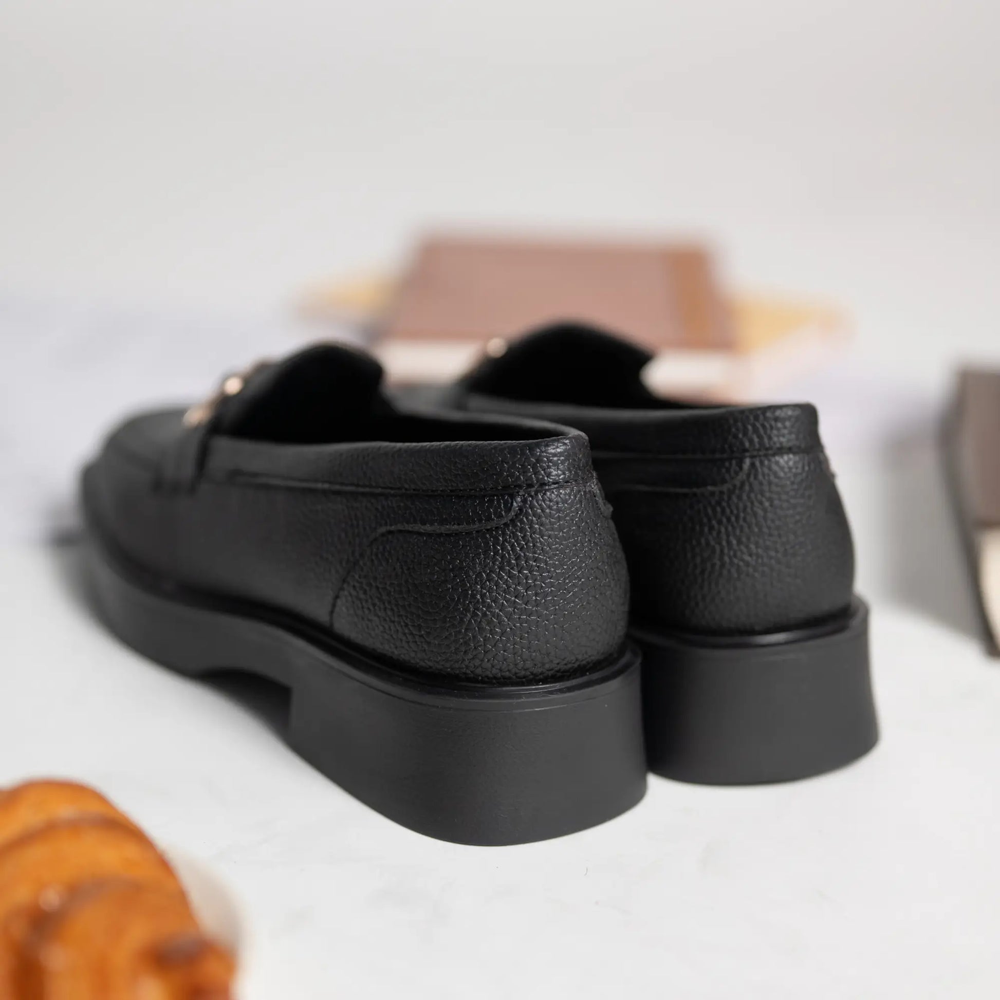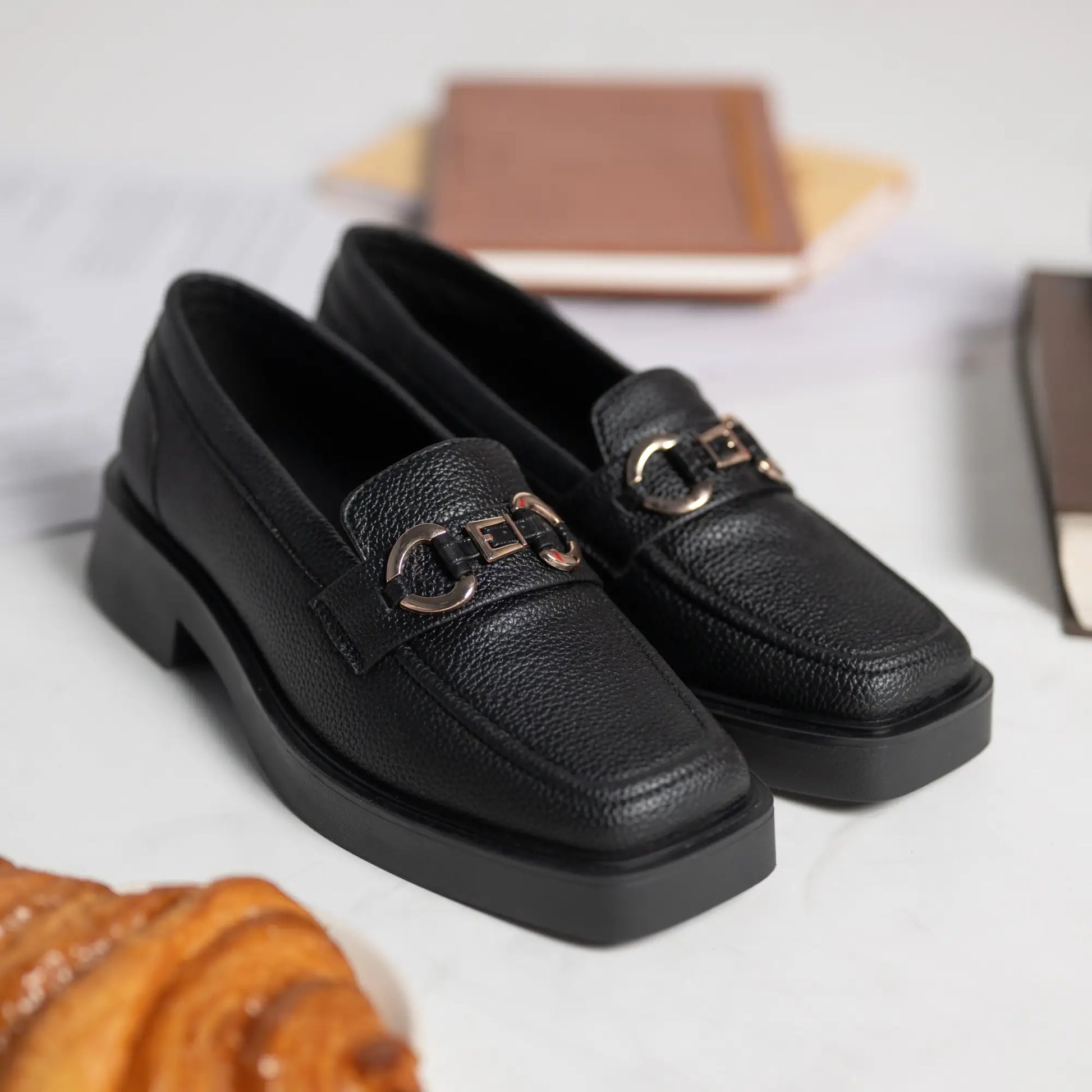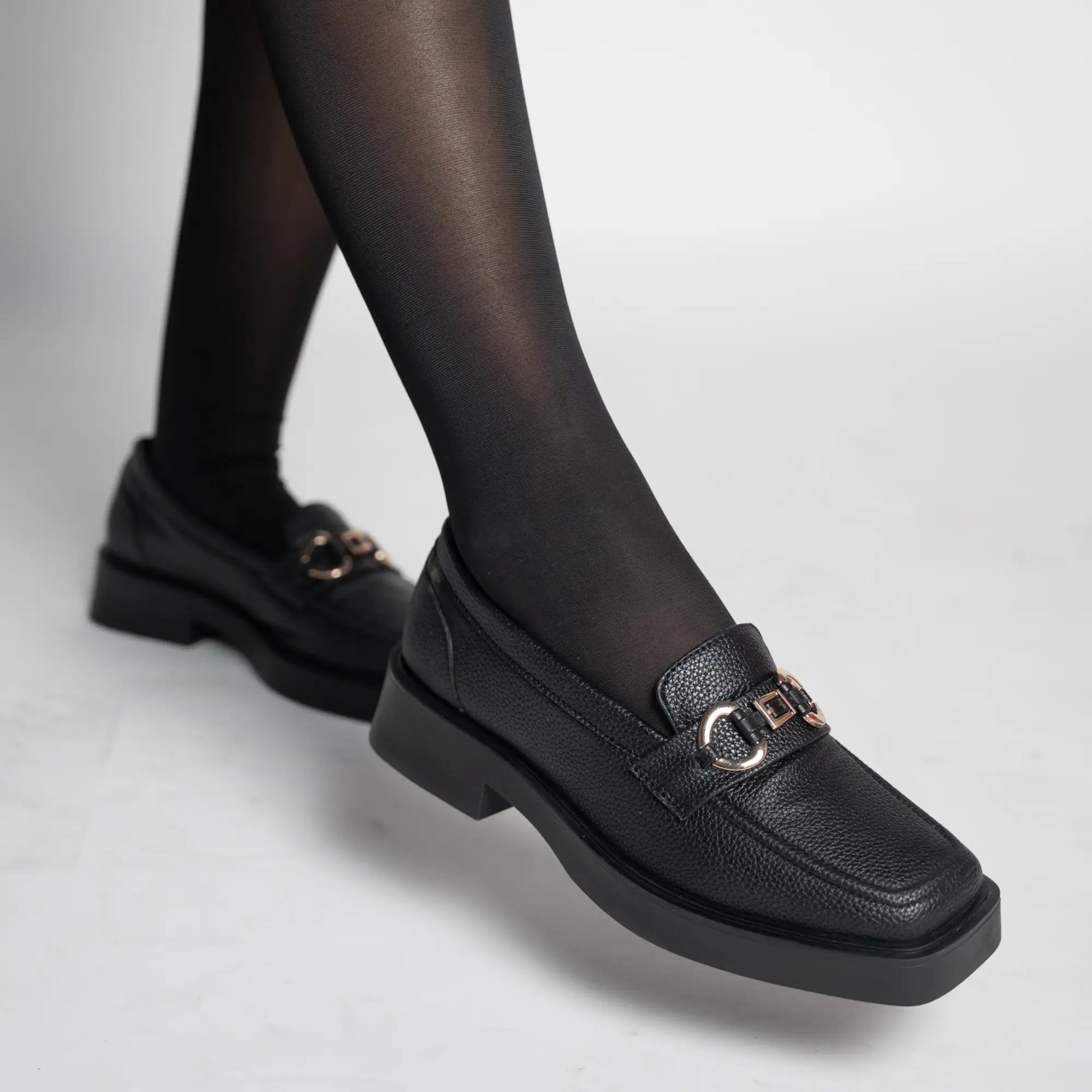 Black square toe slip on loafers in vegan leather with gold buckle detailing