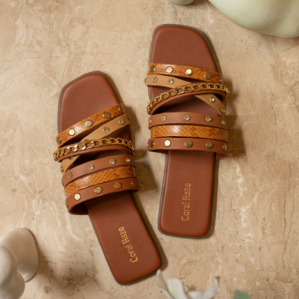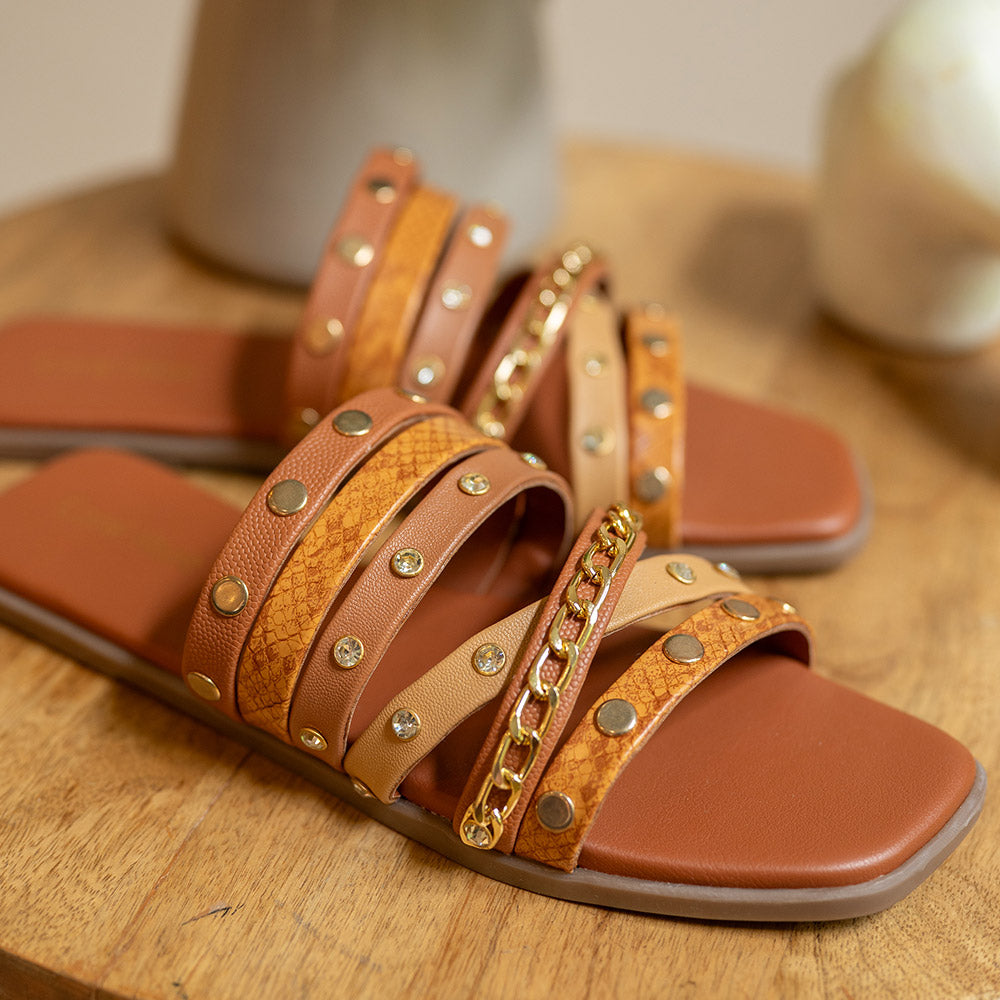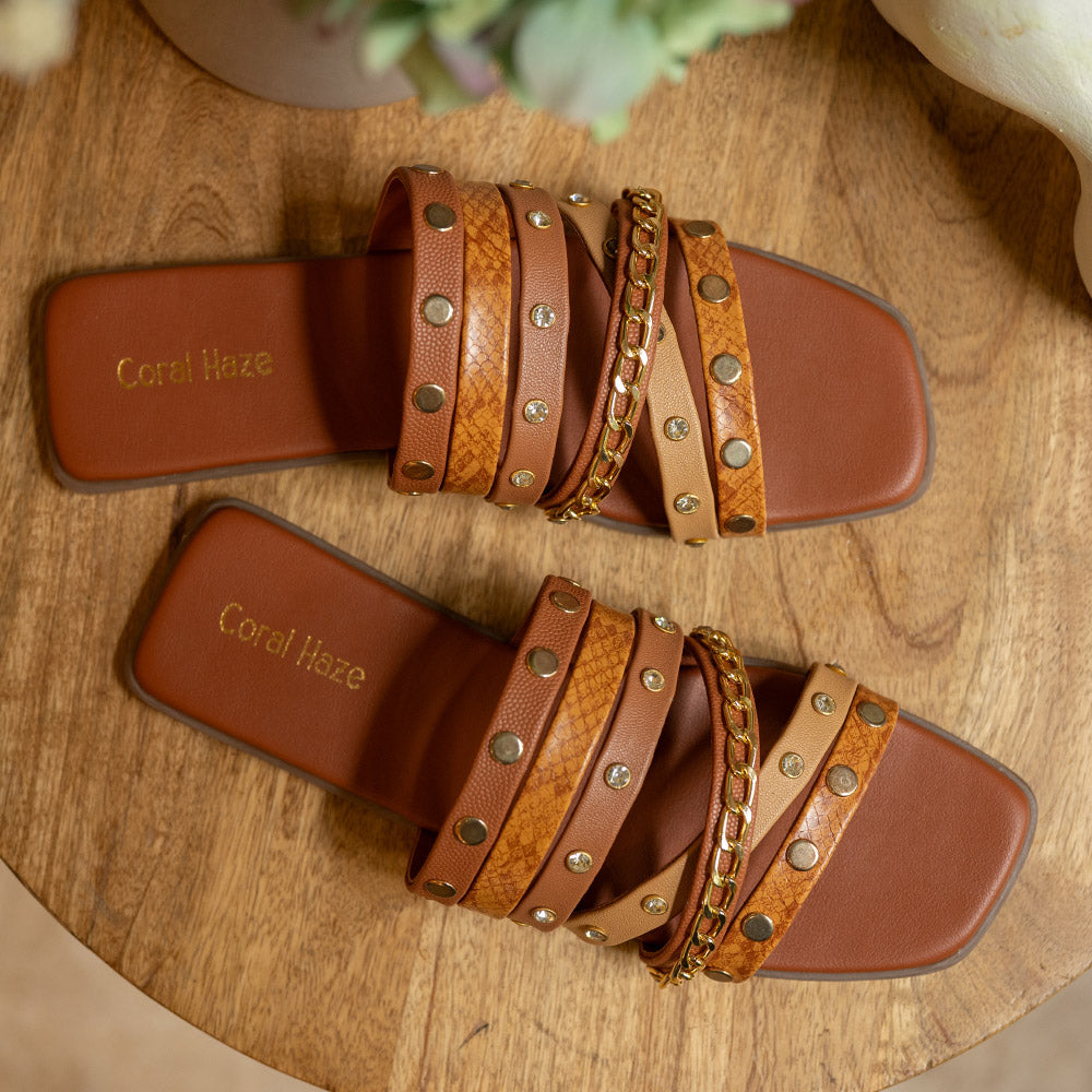 Tan and brown multiple strap sandals with gold stud embellishments, rivets and chain detailing
