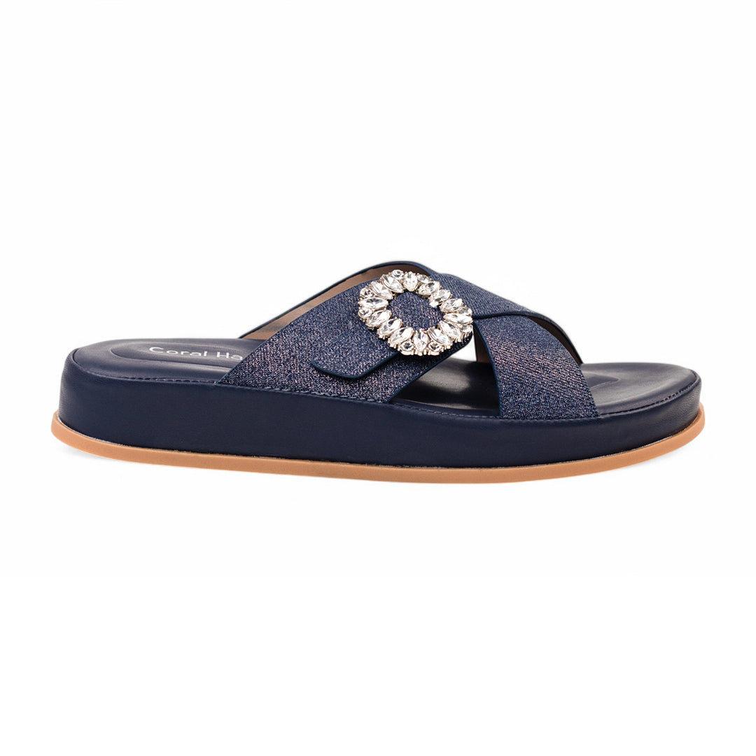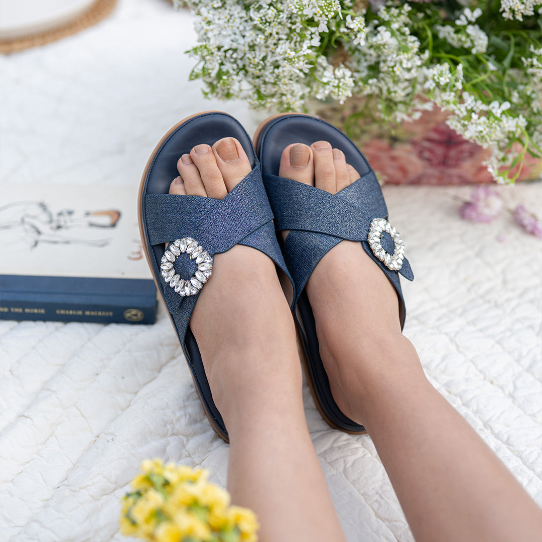 Dark denim glitter cushioned platform sandals with cross straps and chunky rhinestone buckle