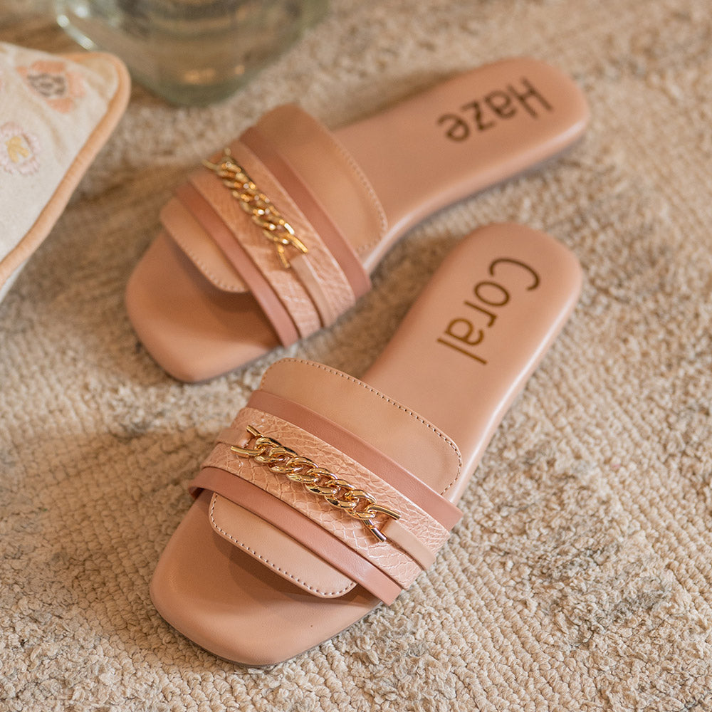 Nude Pink flat sandals with layered straps and chain detailing