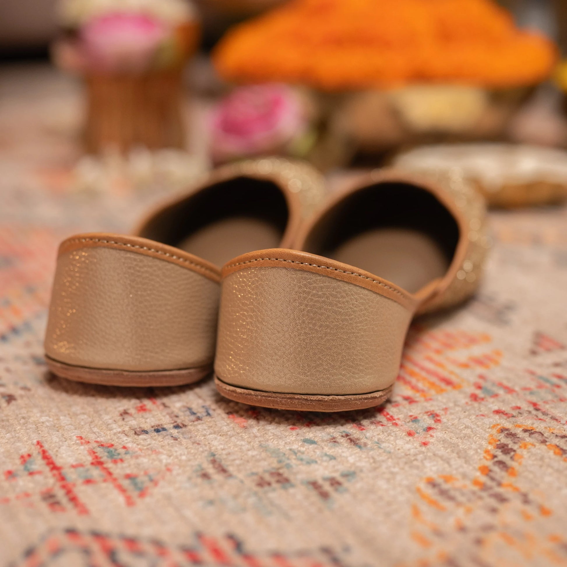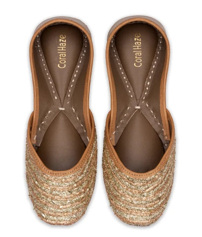 Shimmery gold lace juttis in dual shades of gold, set on a gold base and a gold leatherite back