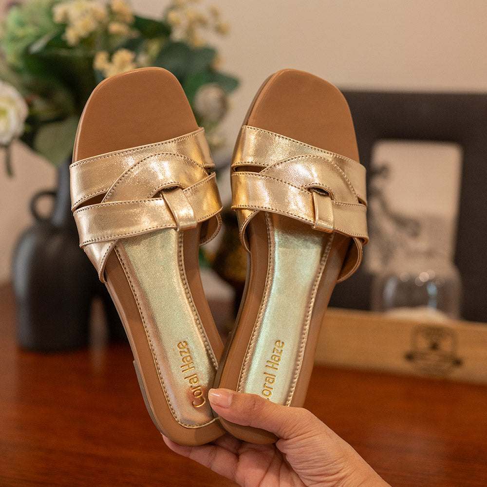 Gold leatherite multiple straps flat sandals with gold insole detailing