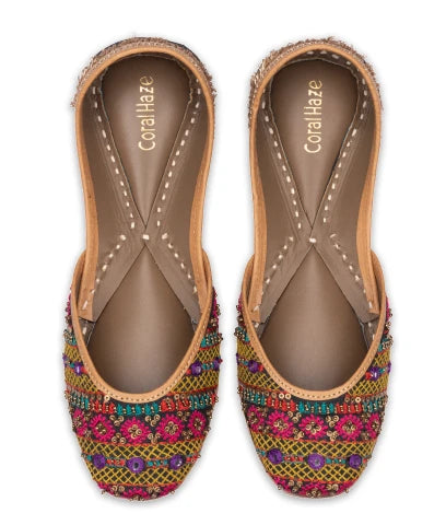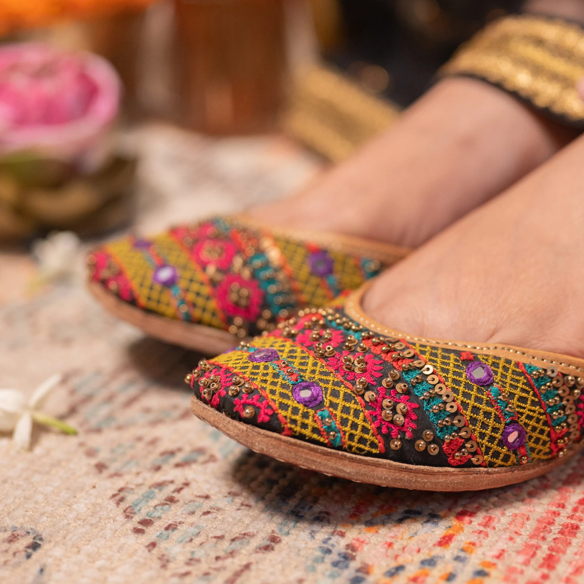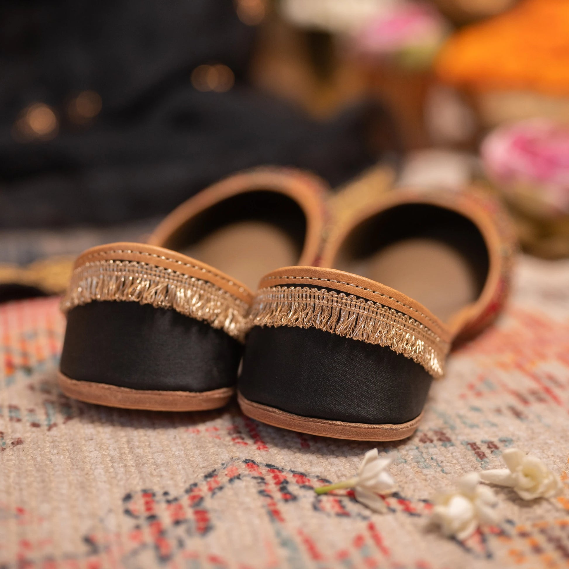 Black juttis with contrast multi colored threadwork, mirrors and sequins, highlighted with fringe lace detailing at the back