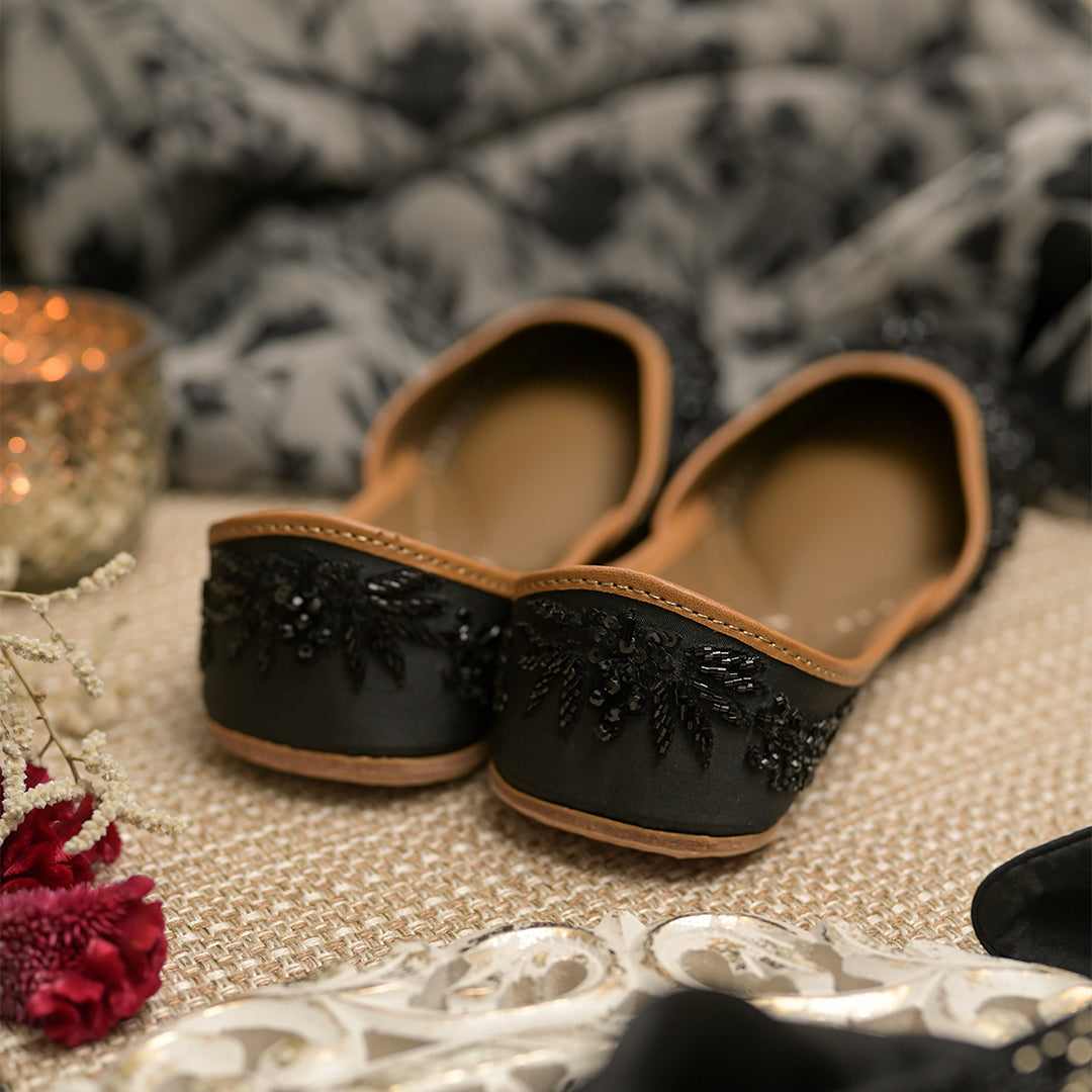 Black juttis with tonal black hand embroidery done with glass beads and crystals on the front and back