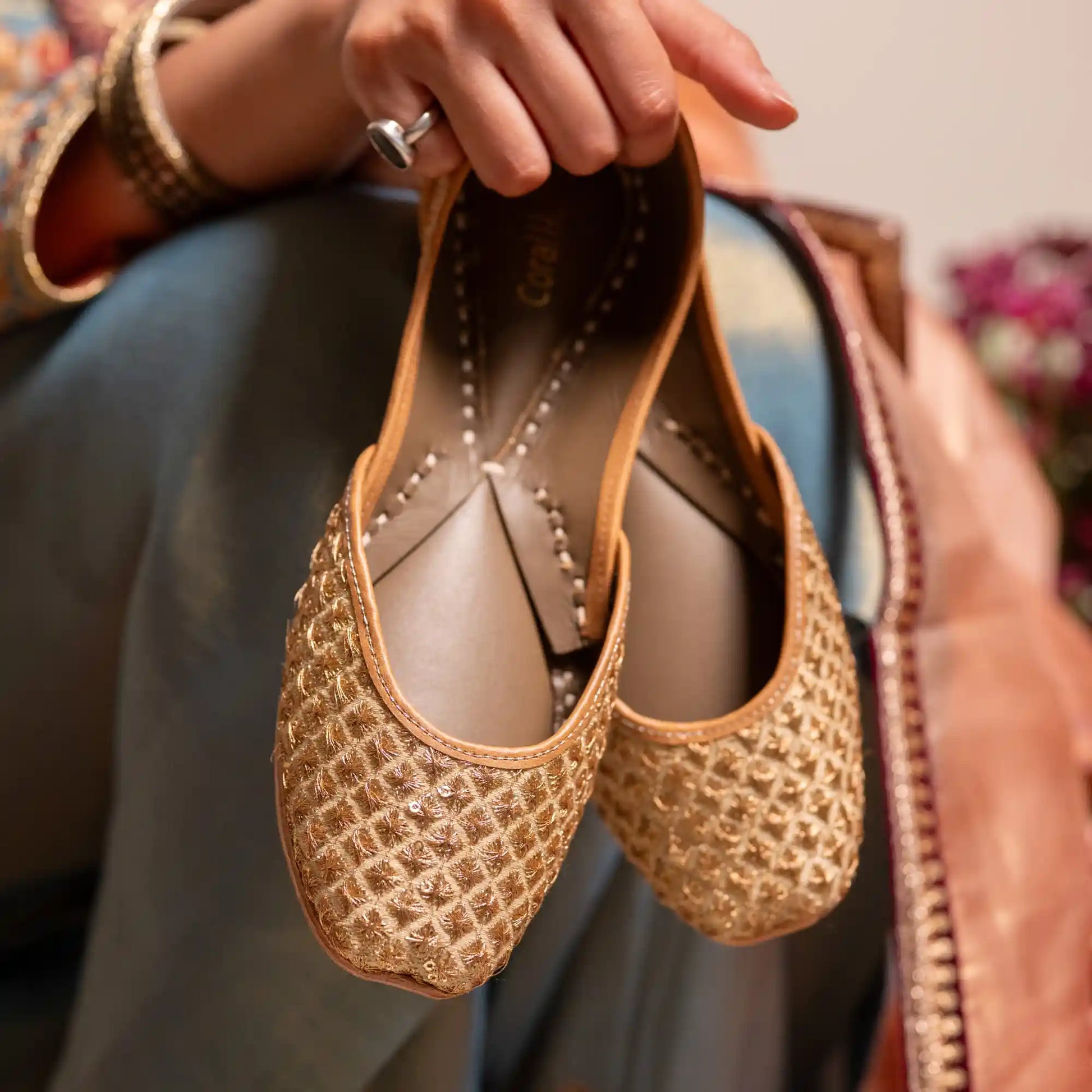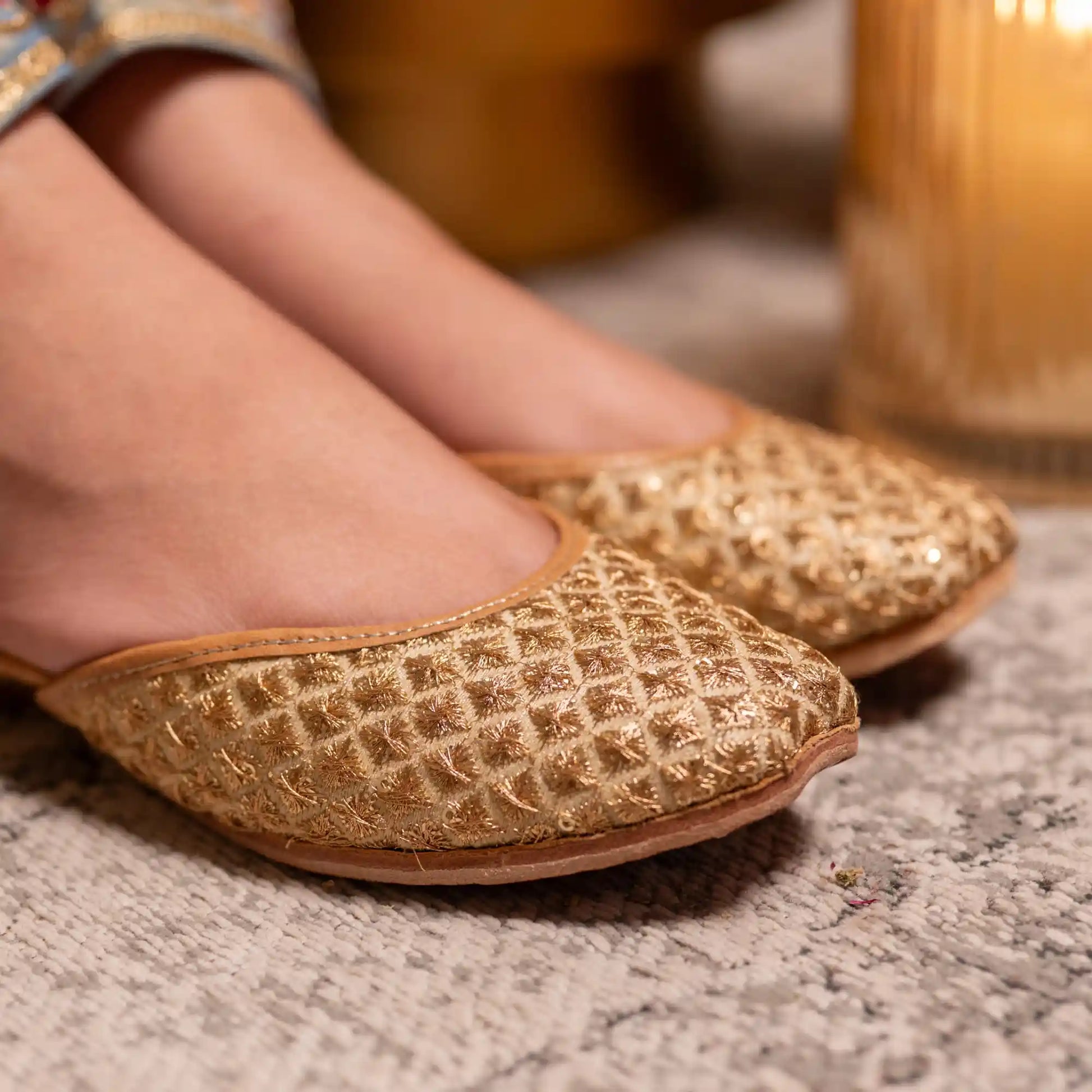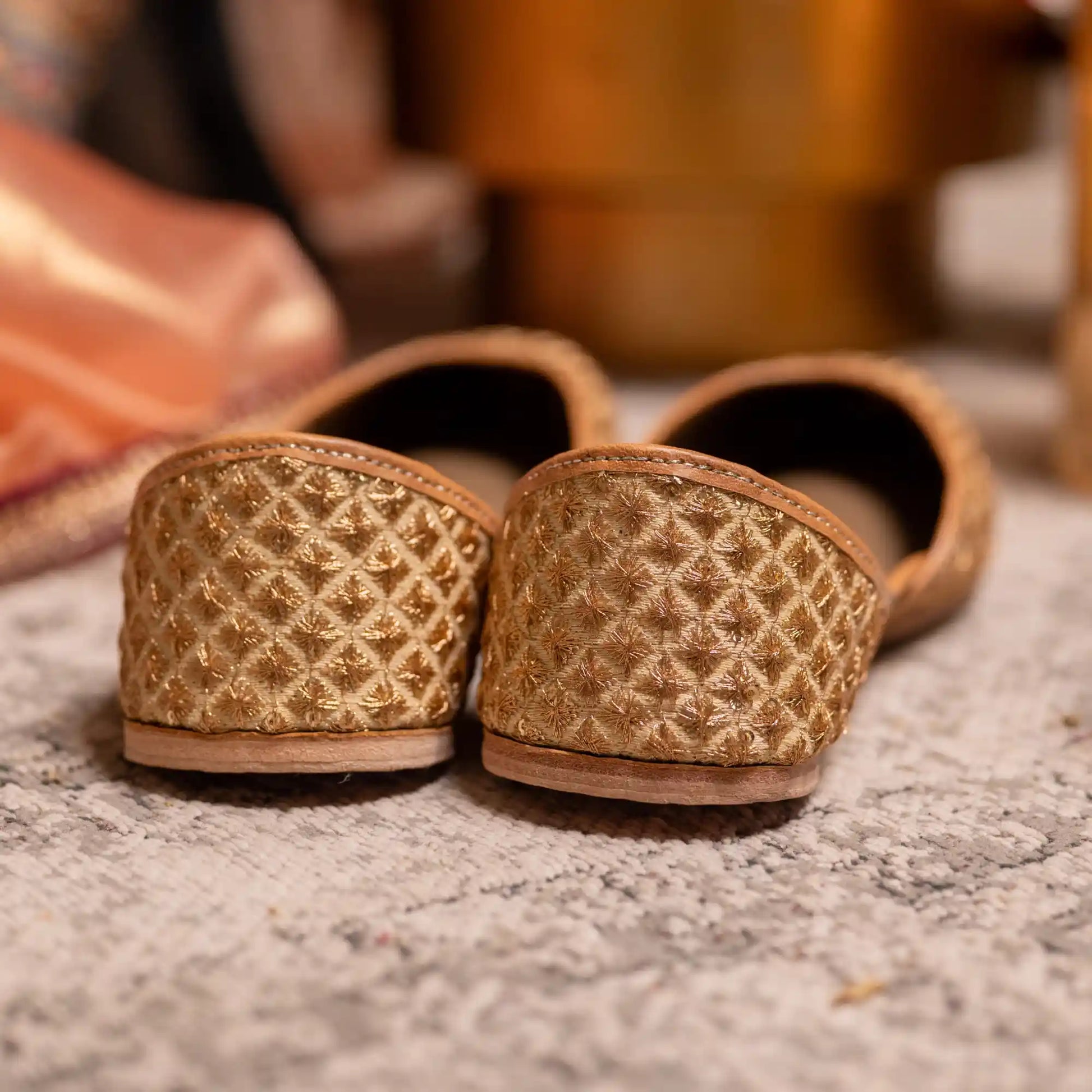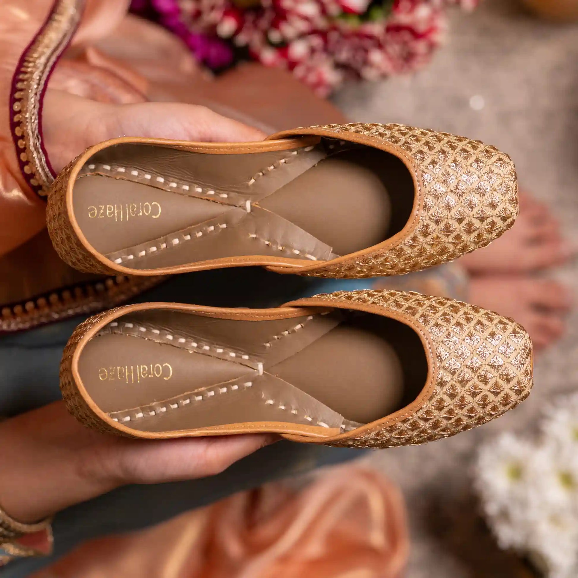 Refined with a touch of structure, the Fariya Juttis feature delicate gold zari motifs arranged in a striking geometric pattern across a luminous gold base. Elegant yet versatile, Fariya brings a polished finish to festive and wedding ensembles, making it a timeless addition to your celebration wardrobe.