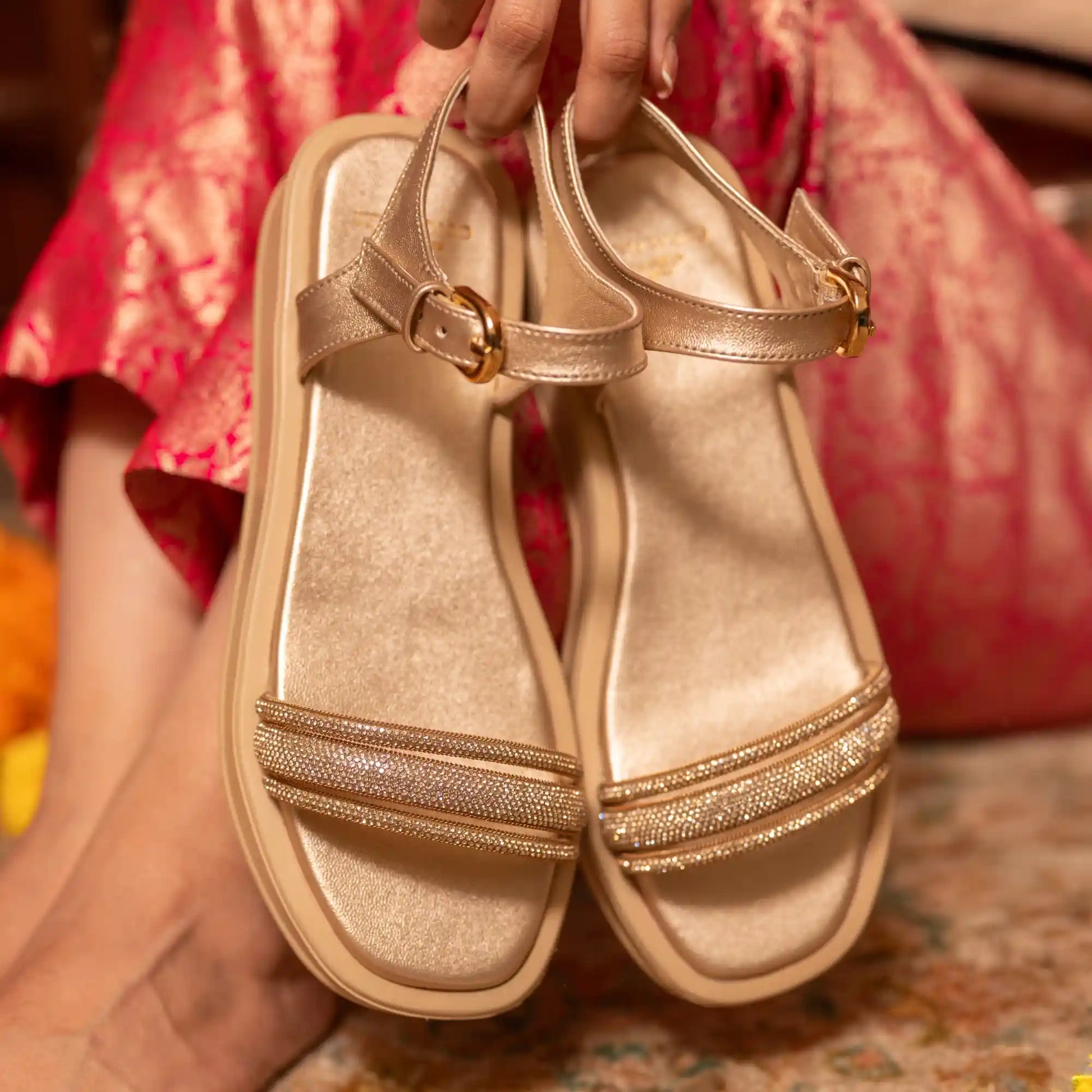 Light gold rhinestone sandals with multiple straps and buckle fastening