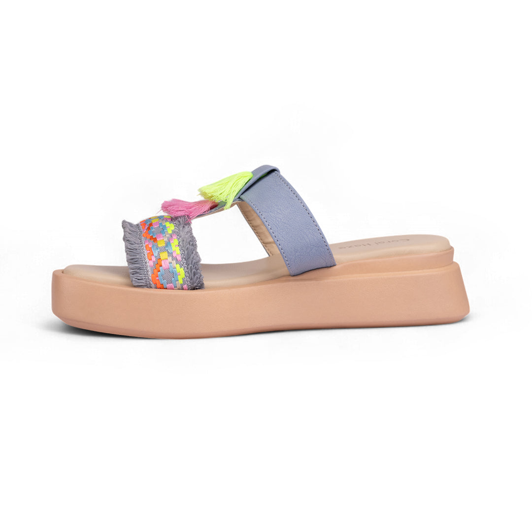 Denim blue platform sliders with thread tassels and neon woven lace strap