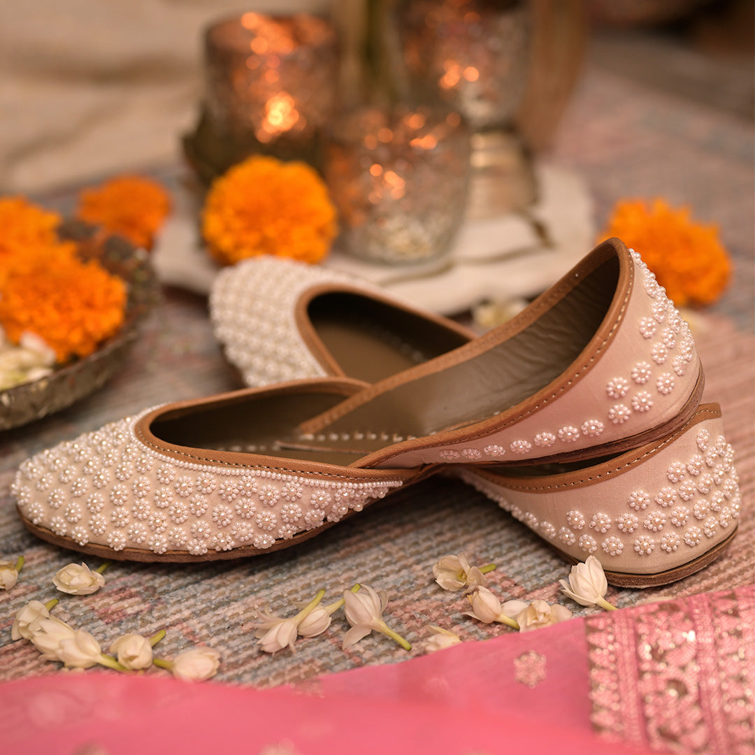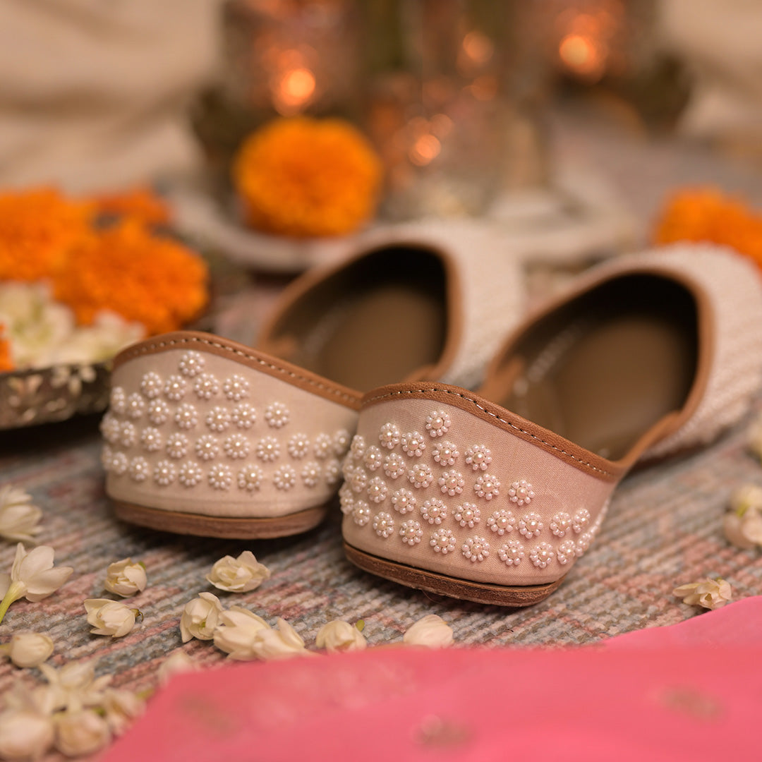 Ivory juttis with hand embroidered pearl work flowers scattered on the front and back