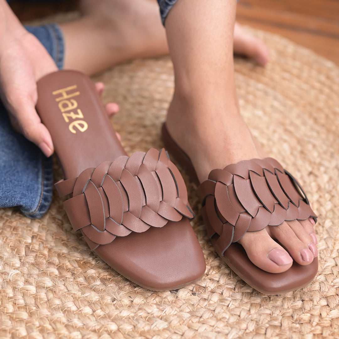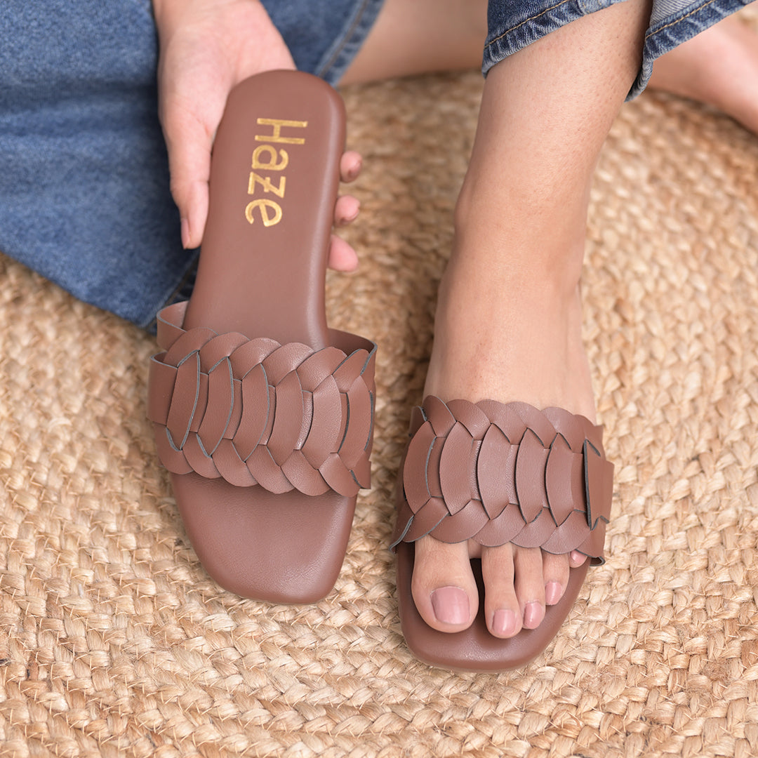 Brown flat sandals with multiple straps braids detailing and cushion comfort sole