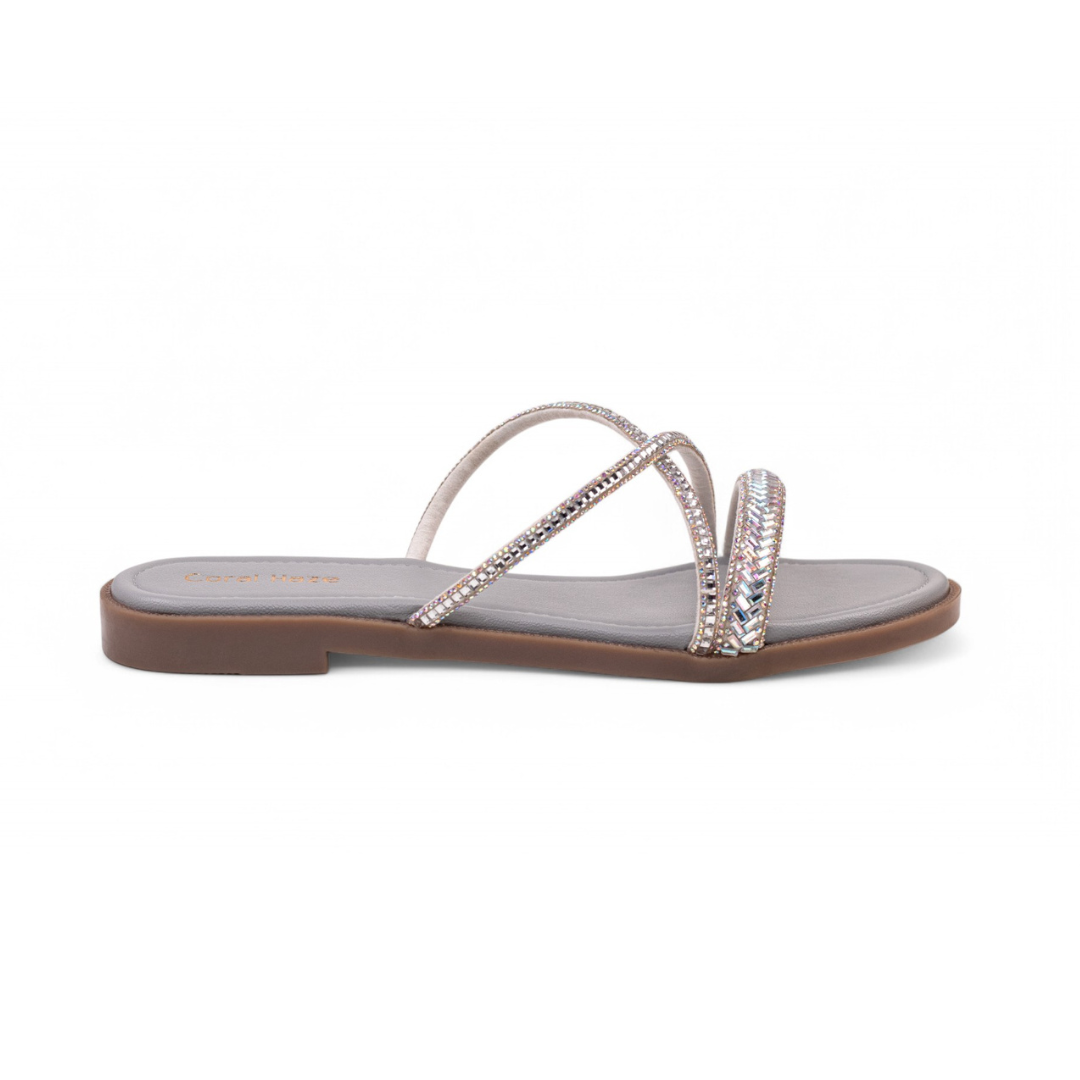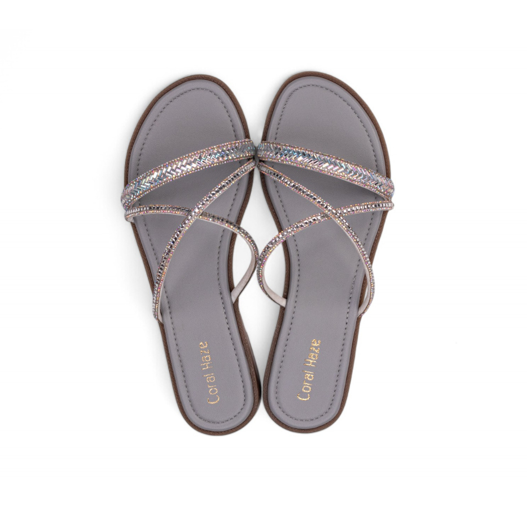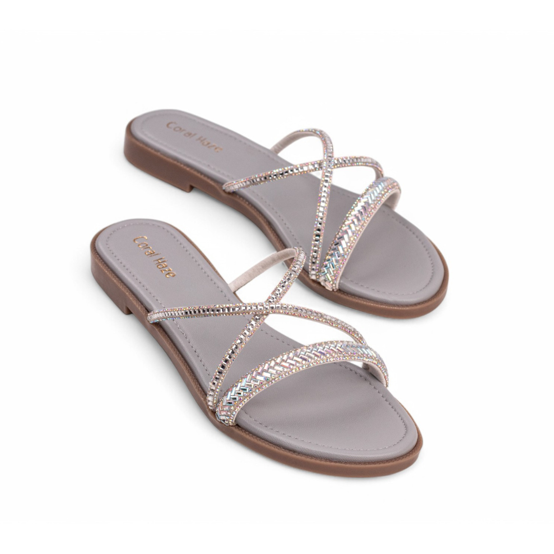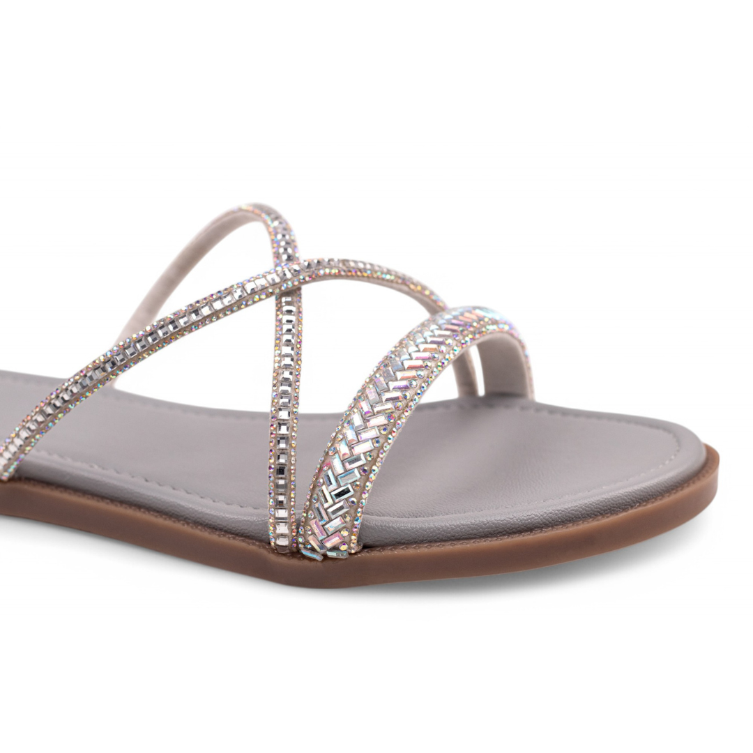 Silver rainbow rhinestone strap flat sandals with criss cross strap detailin