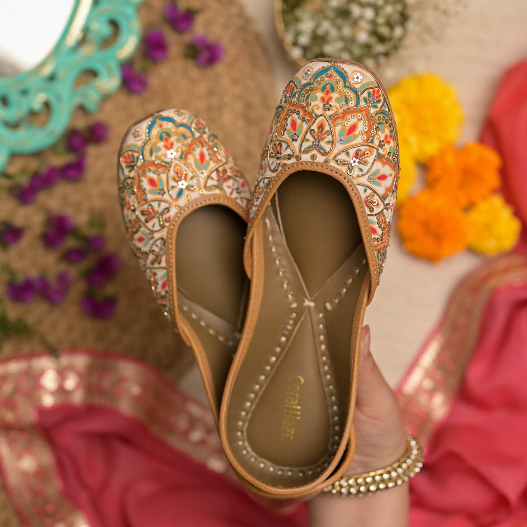 Ivory juttis with multi colored mandala print, highlighted with hand embroidered sequins and glass beads on the front, and a gold textured leatherite back