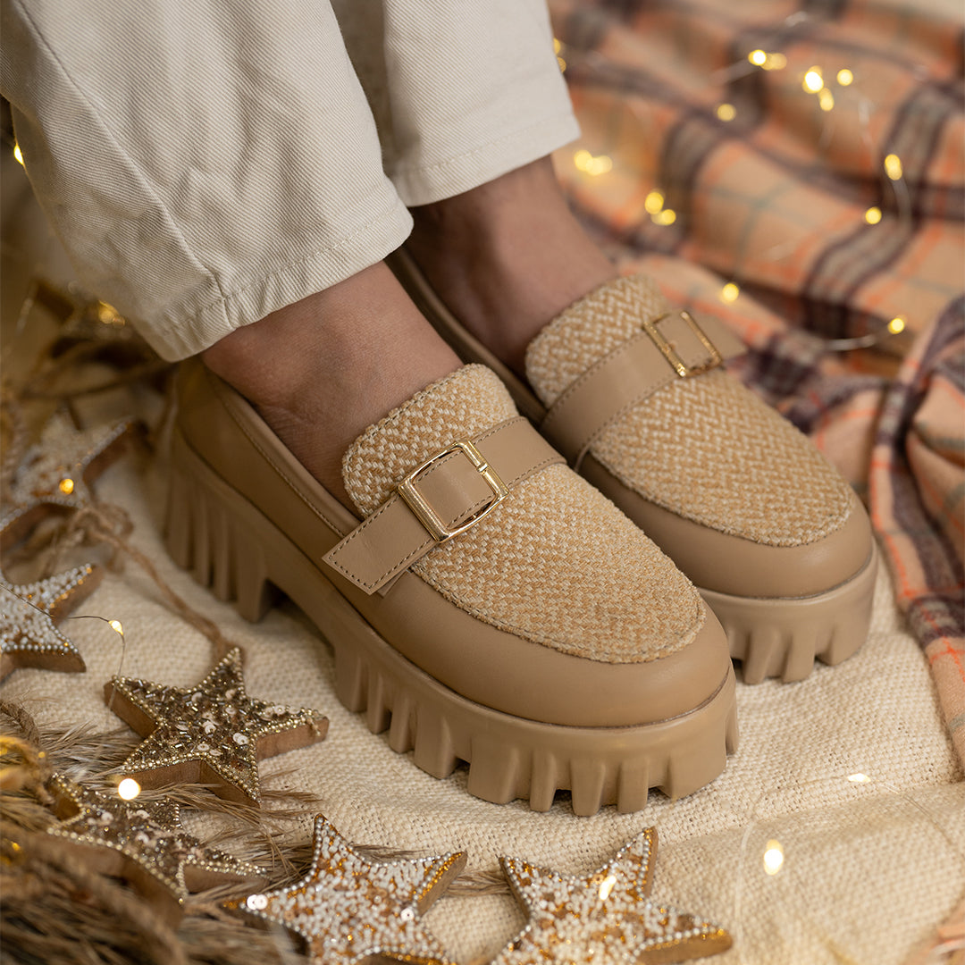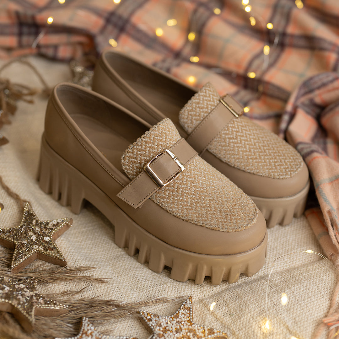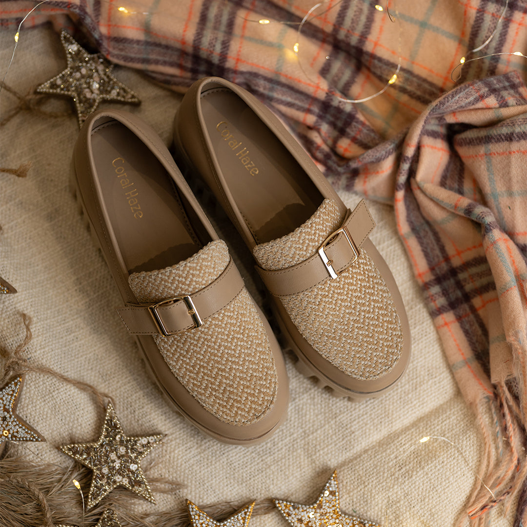 Made for the modern minimalist, this pair features a warm tan color with a monochromatic jacquard design that adds just the right amount of texture. The faux buckle brings a refined touch, making this shoe as stylish as it is versatile for any occasion