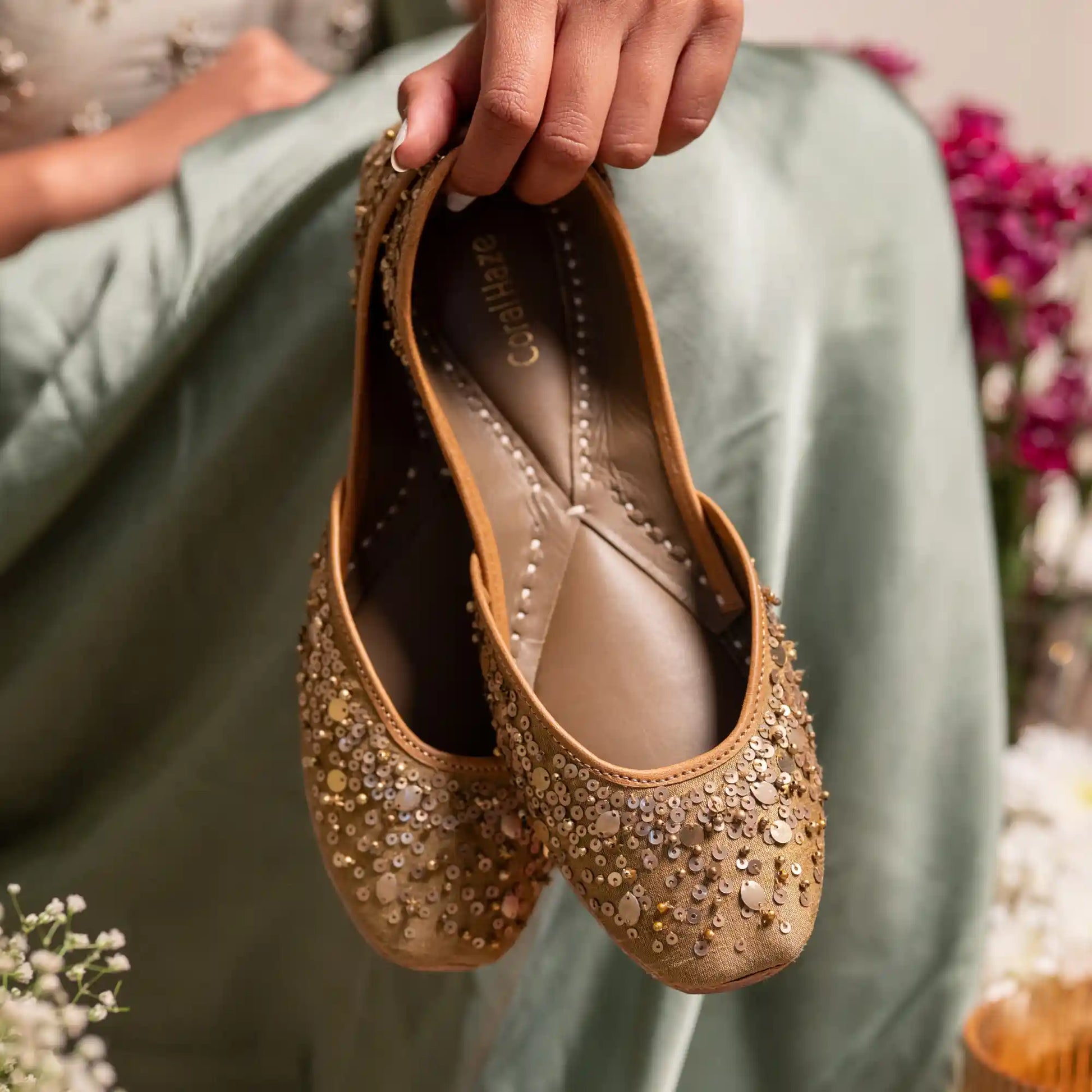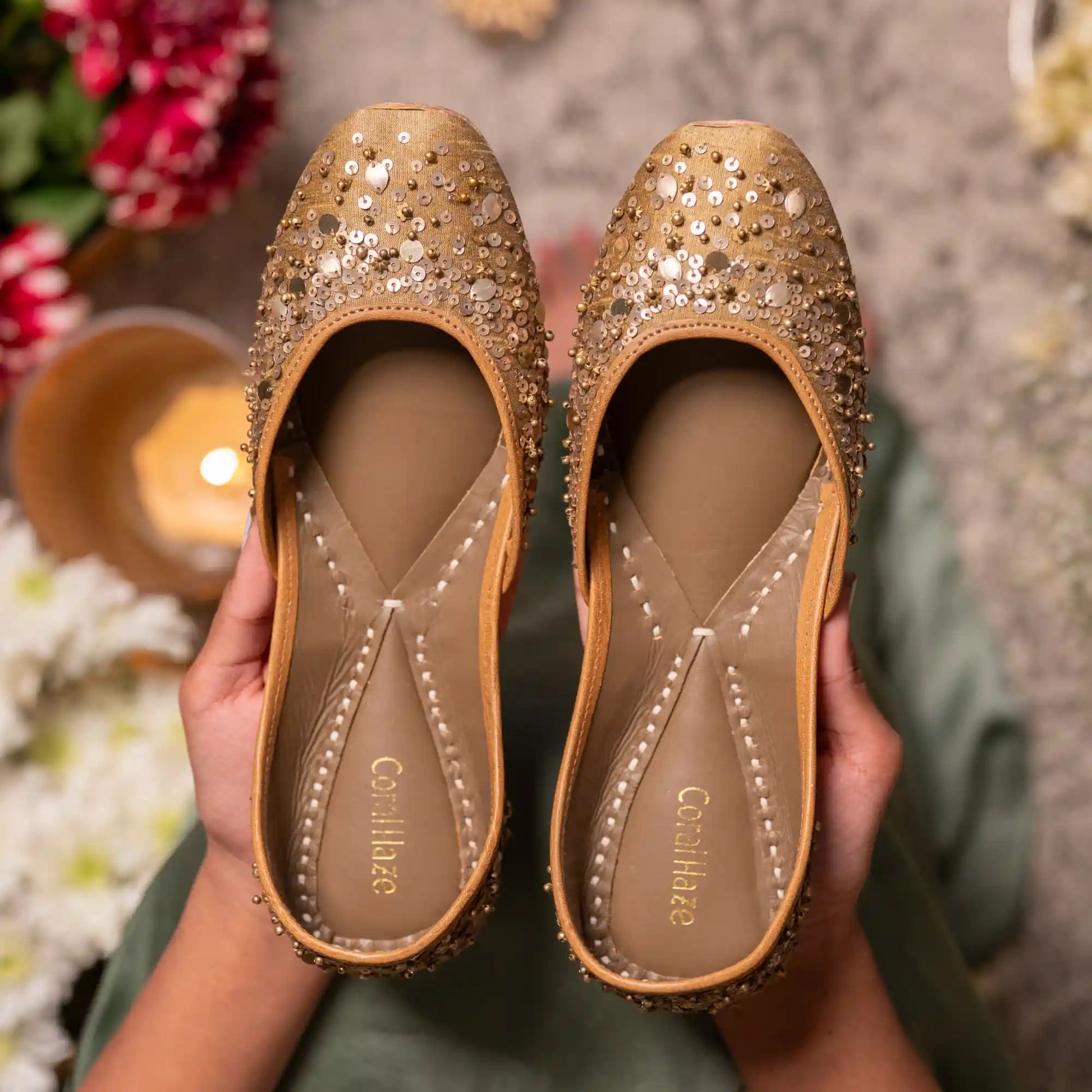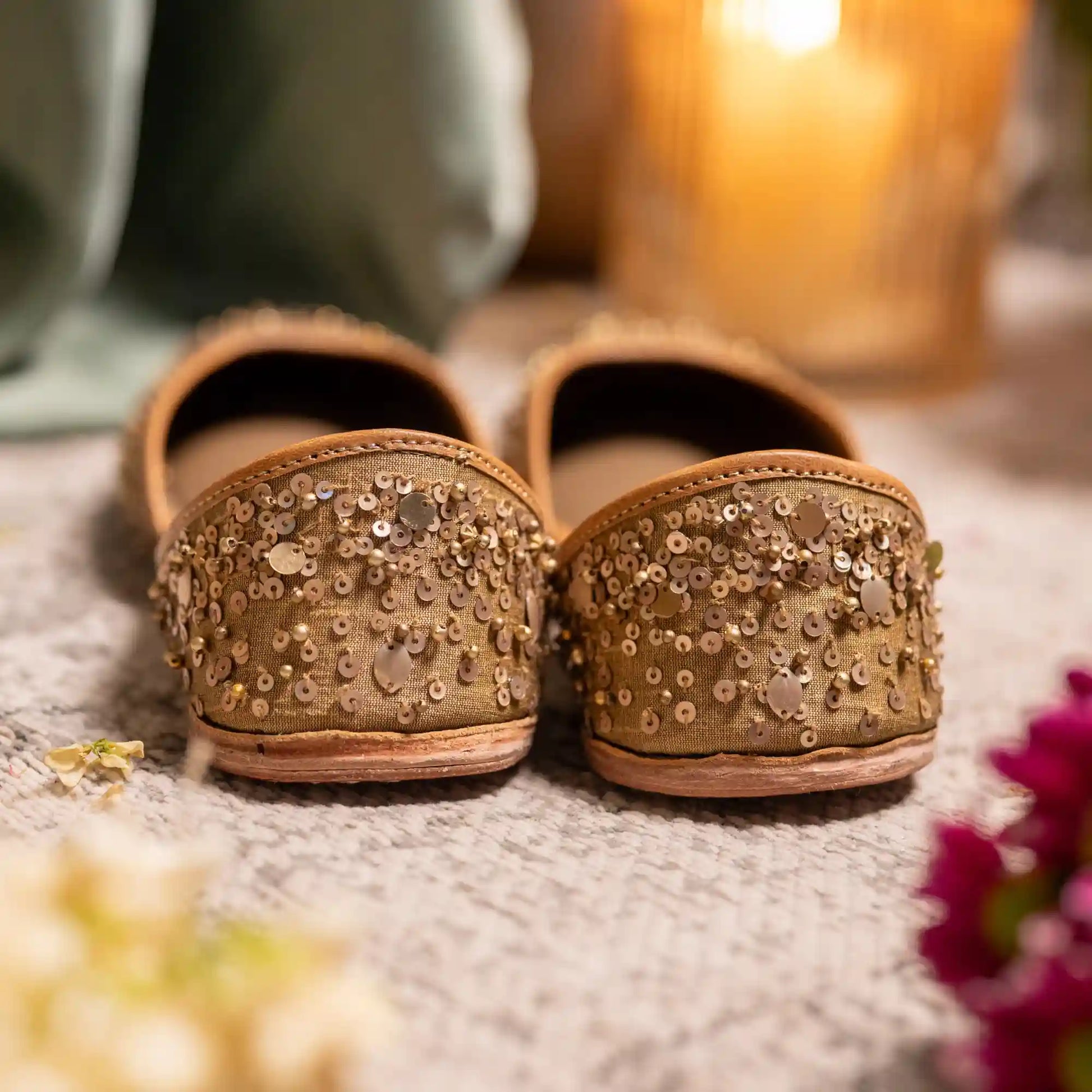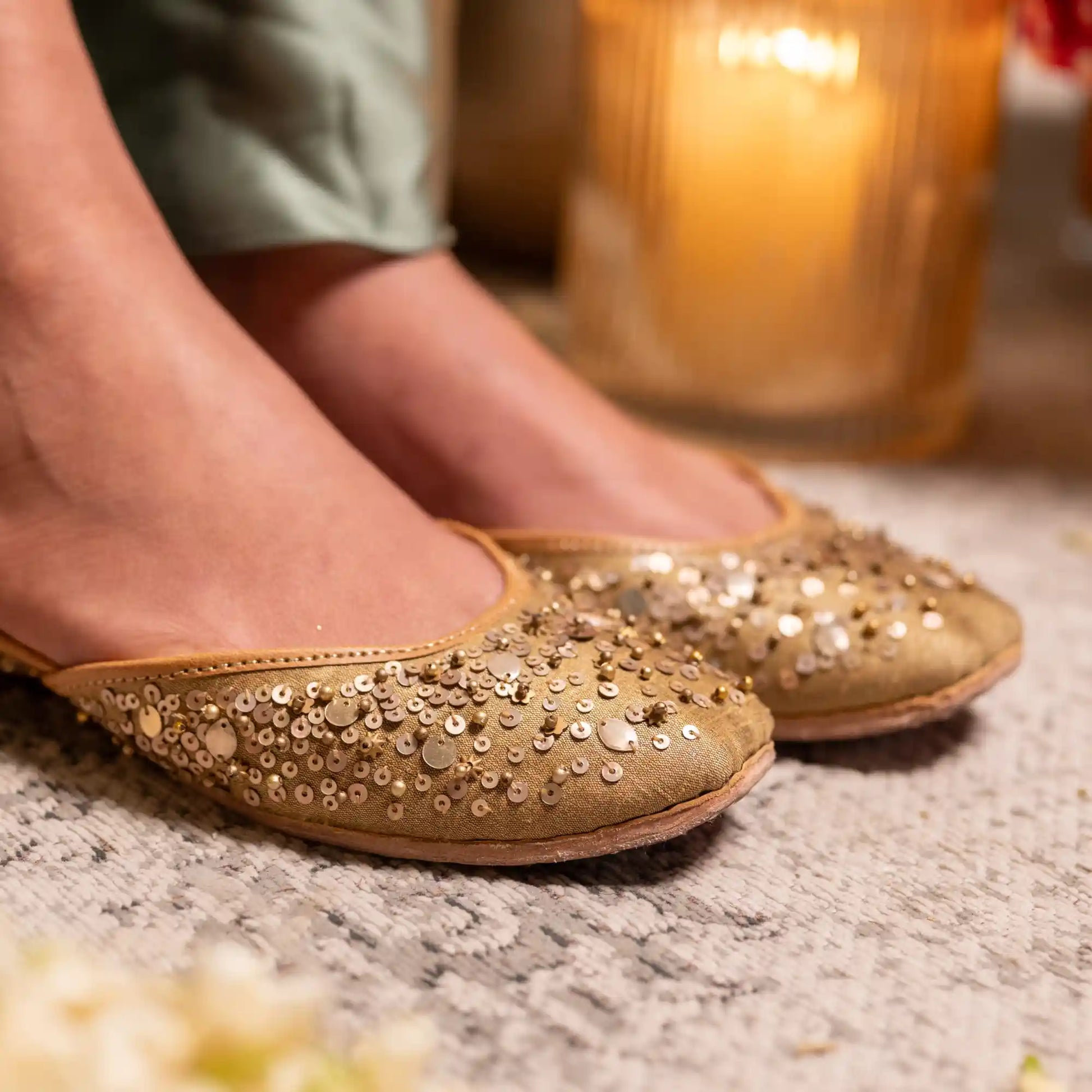 Delicate yet captivating, the Ishreen Juttis are crafted on a luminous antique gold base and adorned with hand embroidered scattered sequins that shimmer softly with every step. The airy placement of the embellishments creates a look that feels effortless and refined like a gentle sparkle woven into the fabric. Elegant without being overpowering, Ishreen is the perfect pair for celebrations where comfort meets understated glamour.