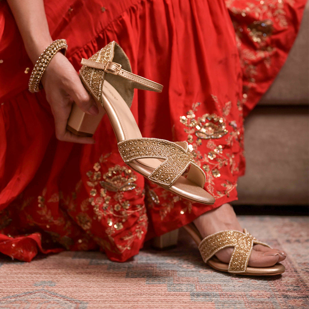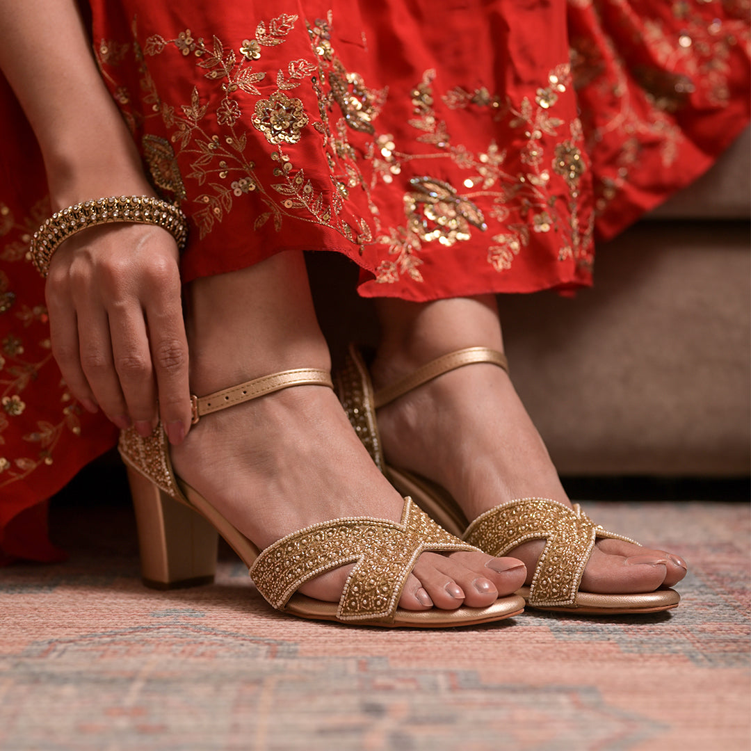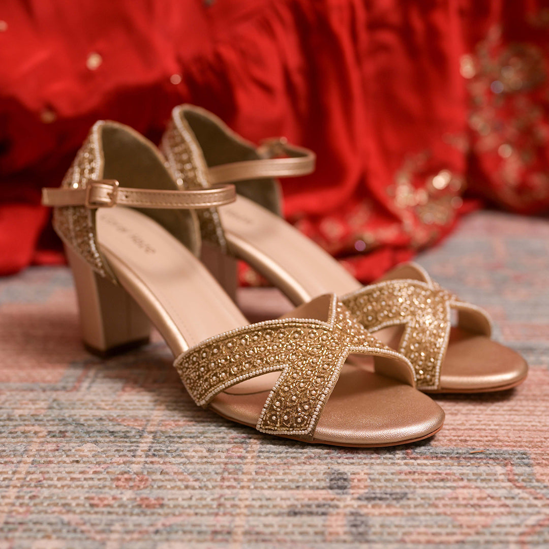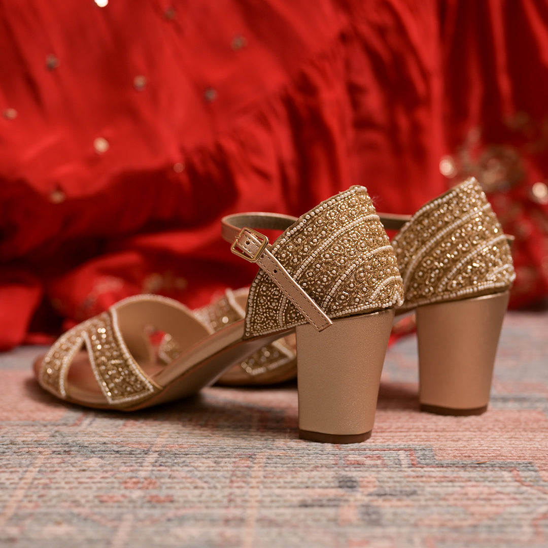 Bridal cross-strap heels with intricate hand embroidery, featuring crystal and pearl detailing on the front and back, set on a gold base. Finished with a buckled strap closure for added elegance and security.