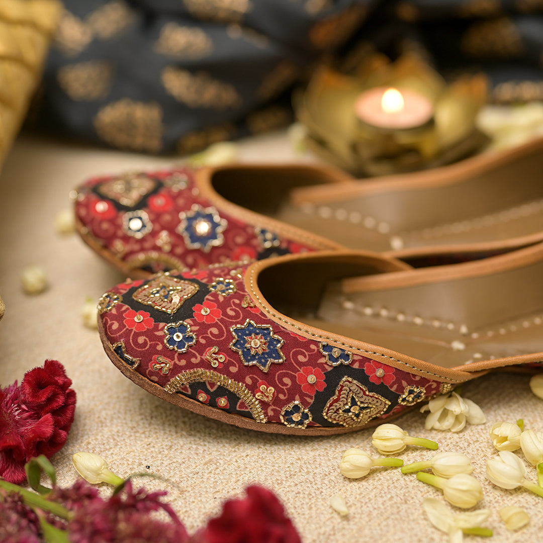 Maroon Ajrakh print juttis with hand embroidered sequins and glass beads