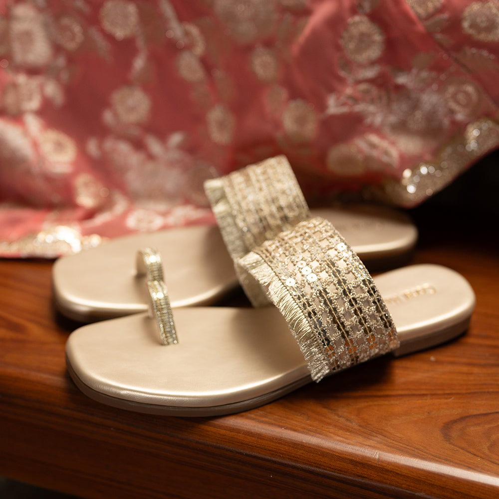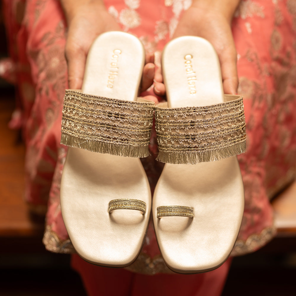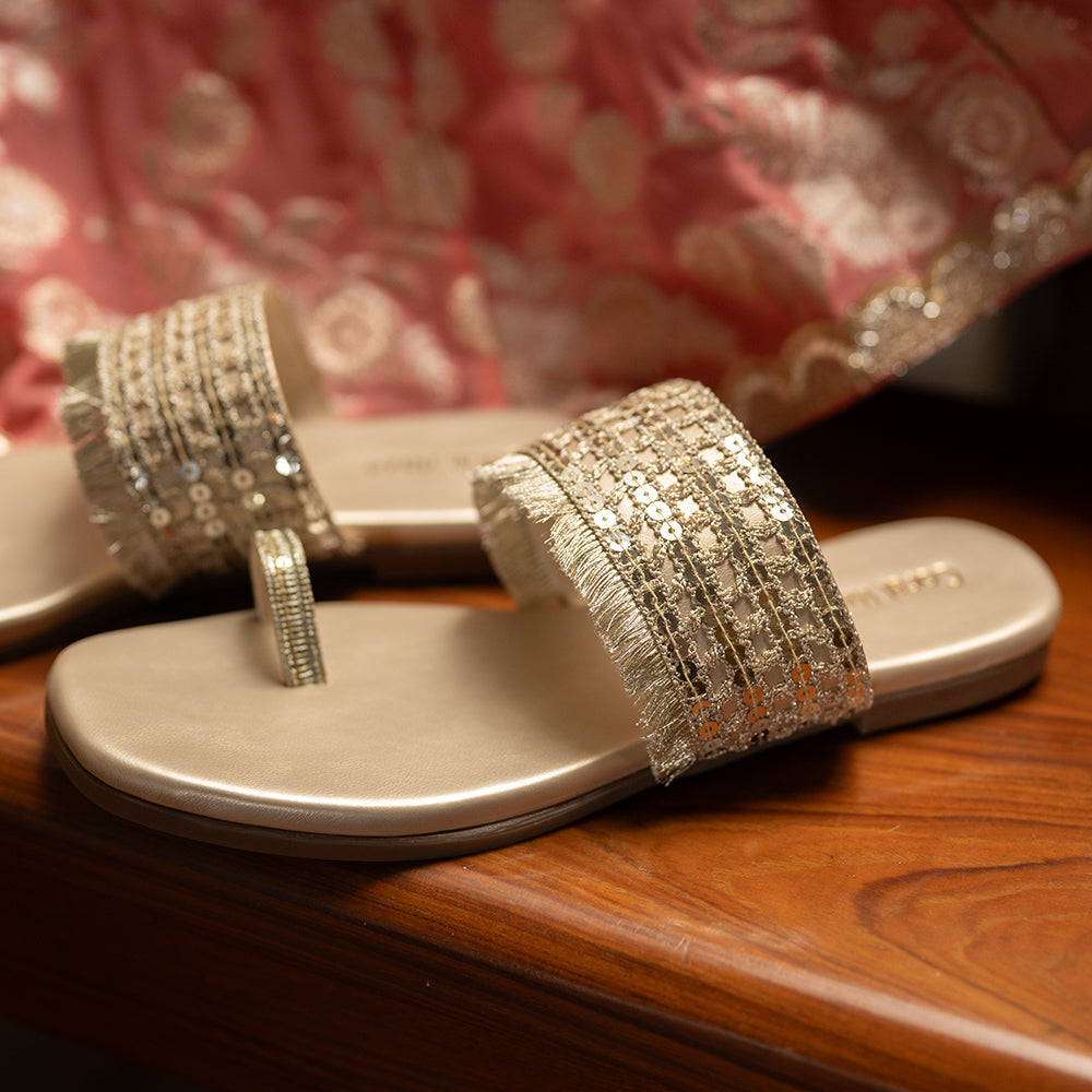 Light gold kolhapuri sandals with sequin work and fringe detailing