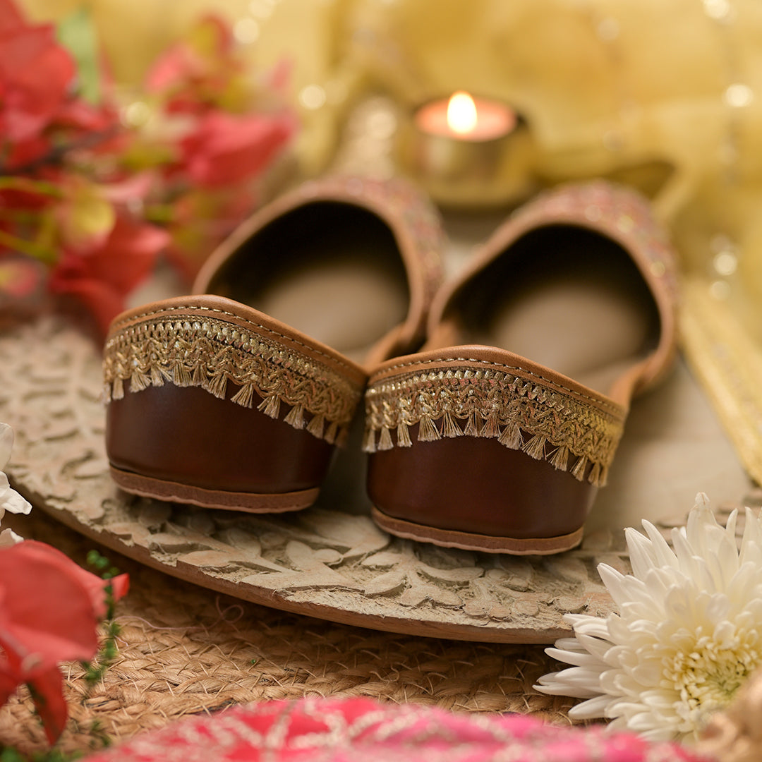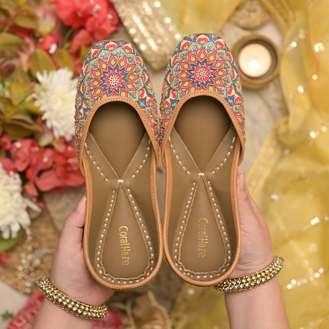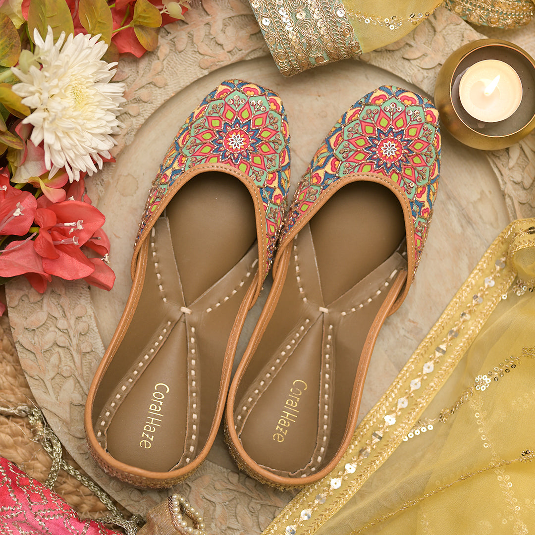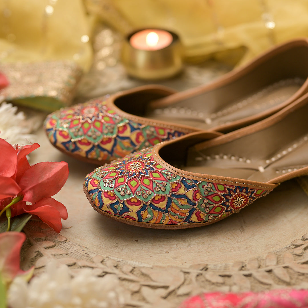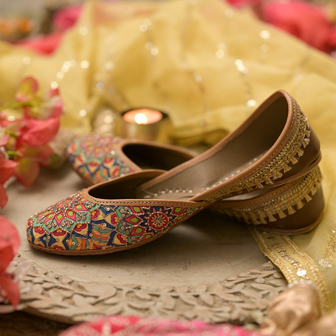 Multi colored mandala print juttis highlighted with hand embroidered sequins and glass beads on the front, and a brown leatherite back with fringe lace detailing