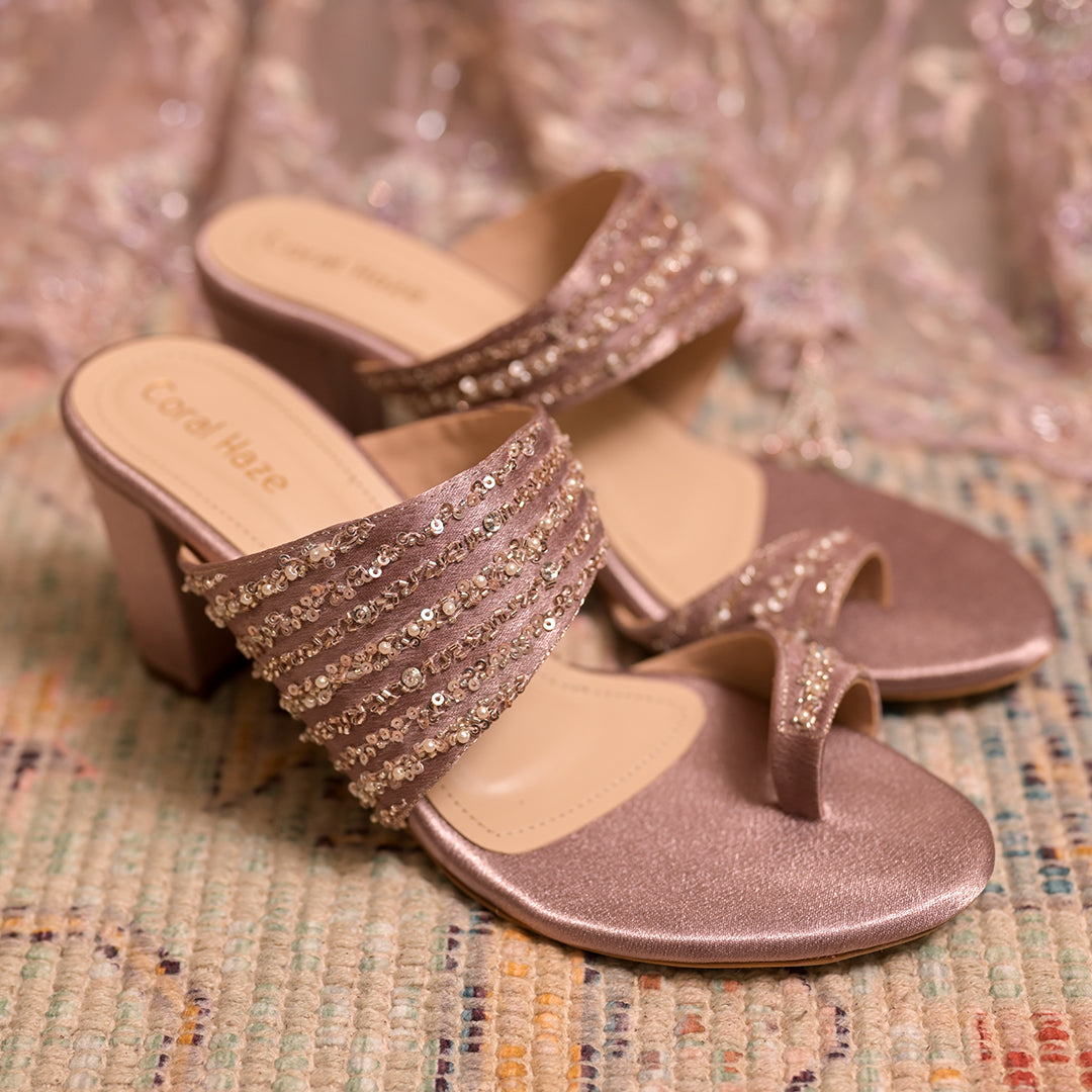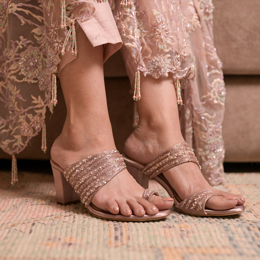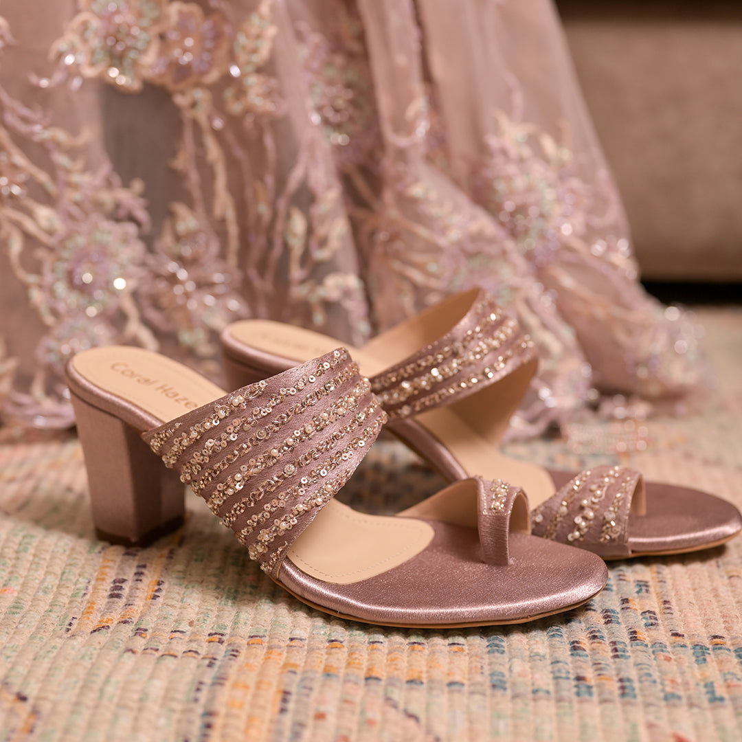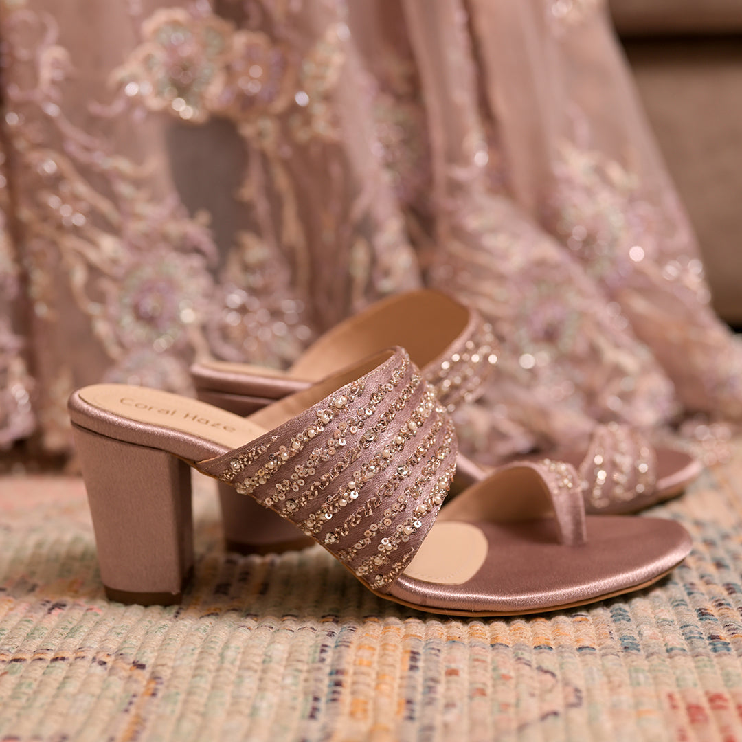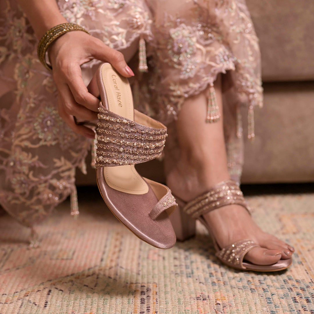 Bridal heels showcasing exquisite hand-embroidered beadwork on a dusty pink base, featuring an asymmetrical strap and an embroidered thumb strap for a refined, stylish look.
