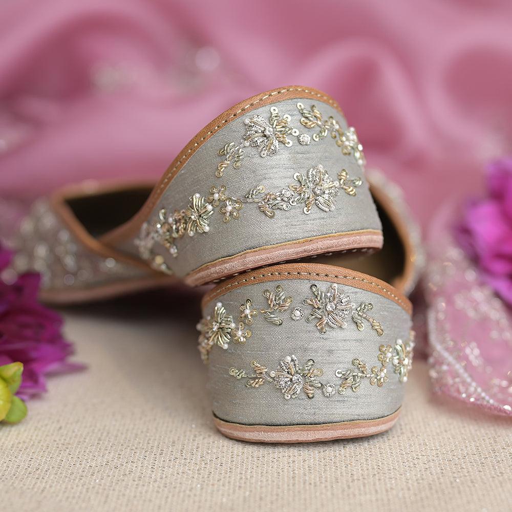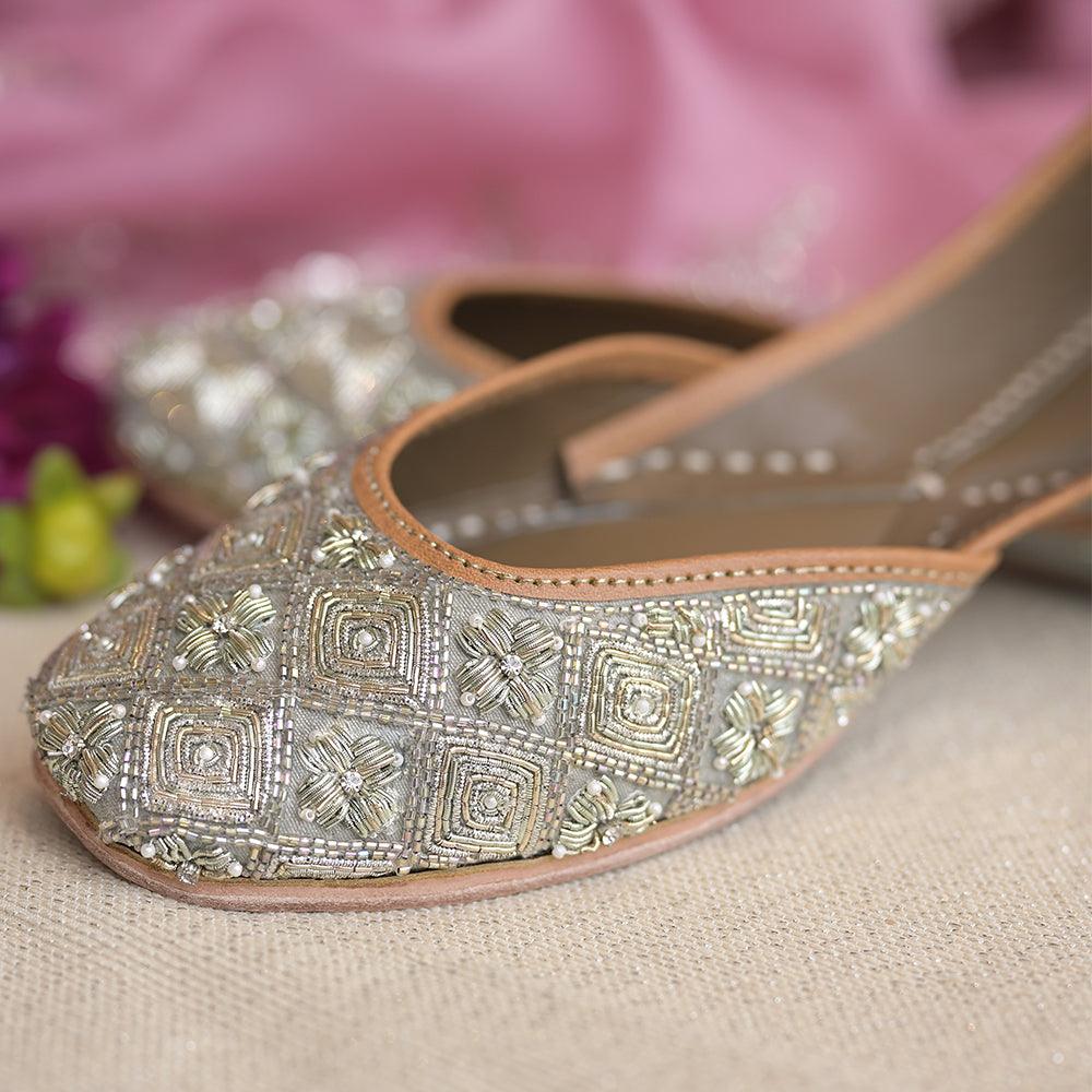 Hand embroidered zardozi work set in a checkered pattern in shades of silver on a greyish silver base with a floral vine pattern at the back