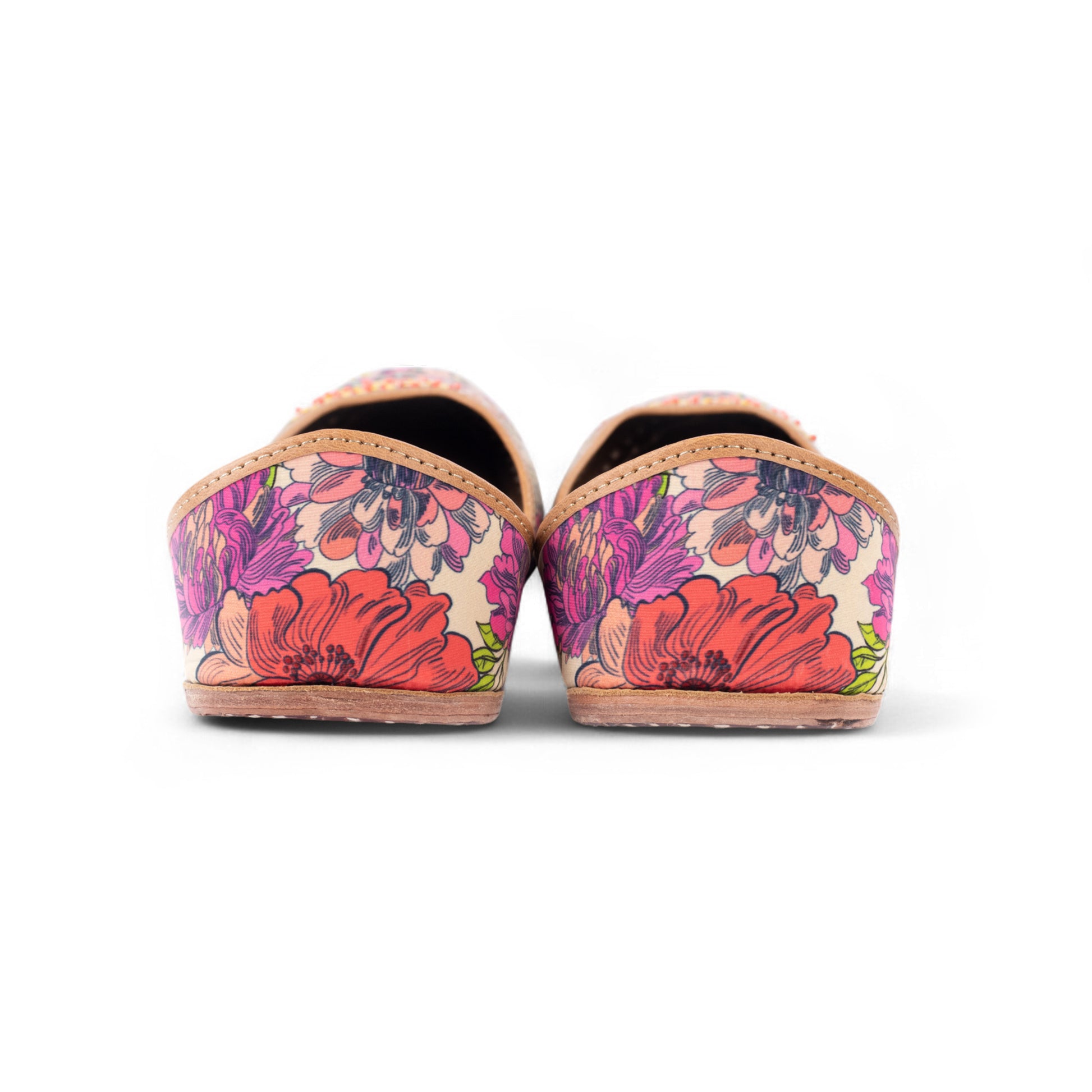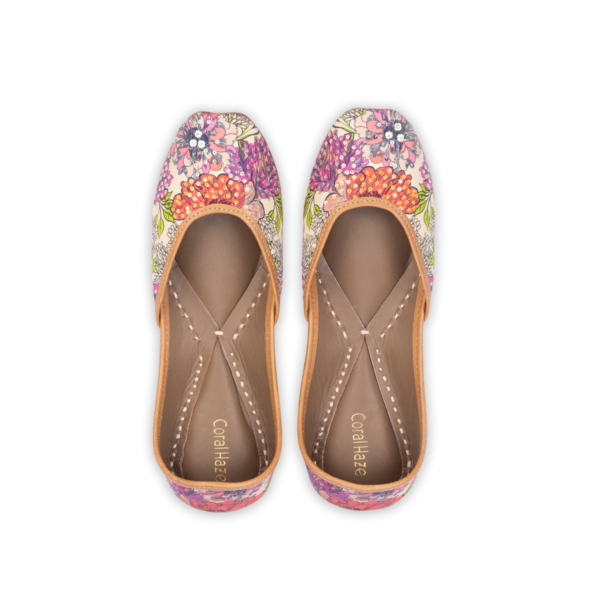 Mulitcolored floral print juttis with hand embroidered sequins and beadwork