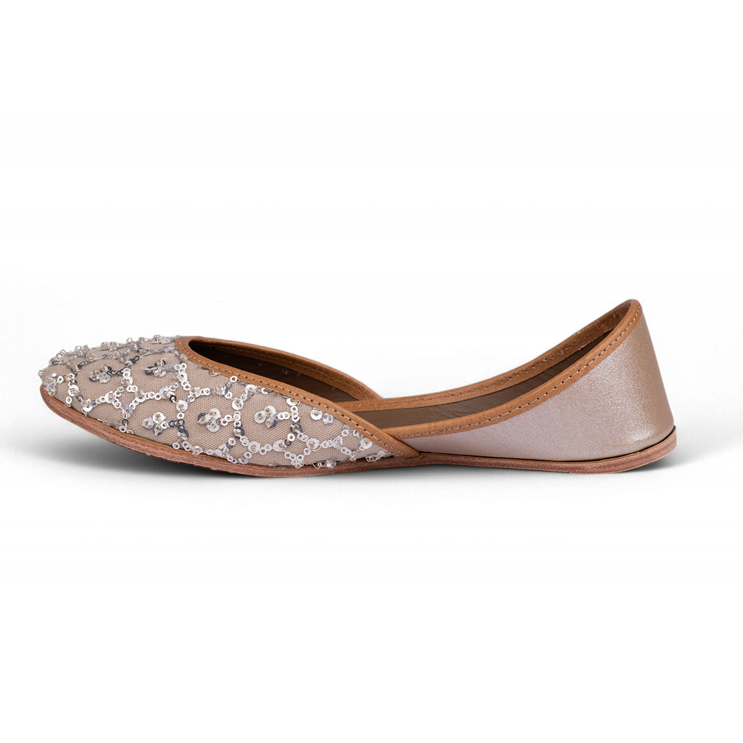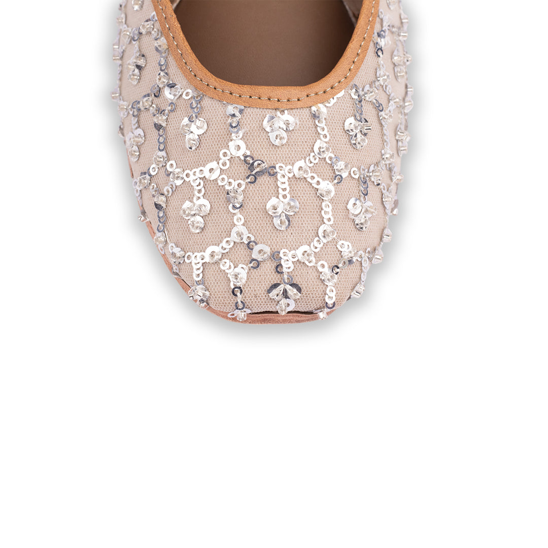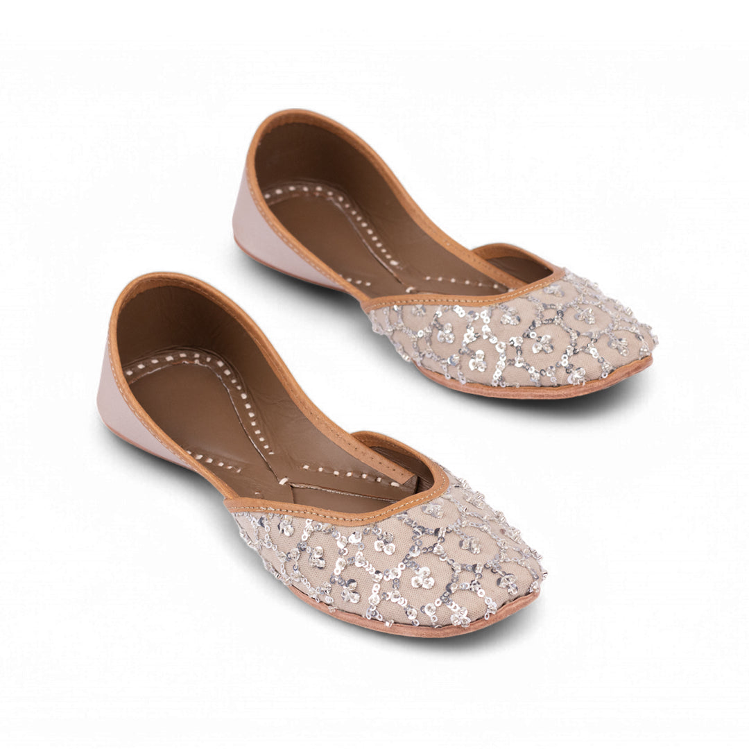 Light taupe grey juttis with silver sequin and beadwork jaal and a metallic silver back