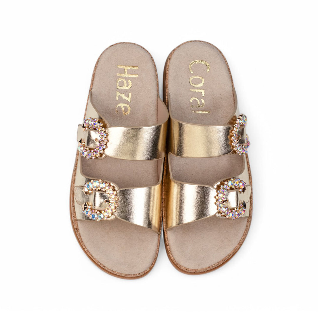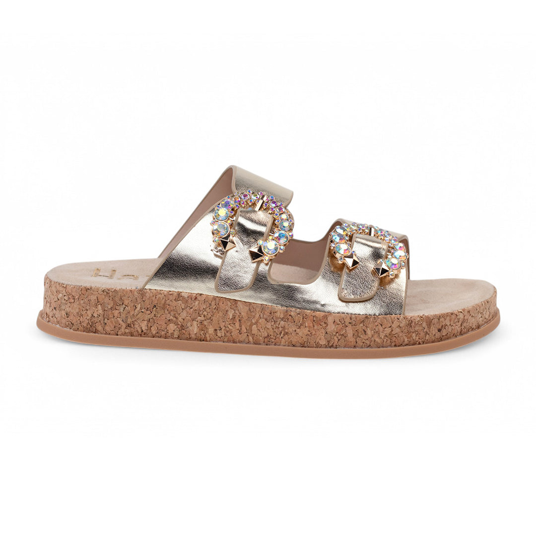Metallic gold cushioned platform sandals with dual straps and chunky rhinestone buckles
