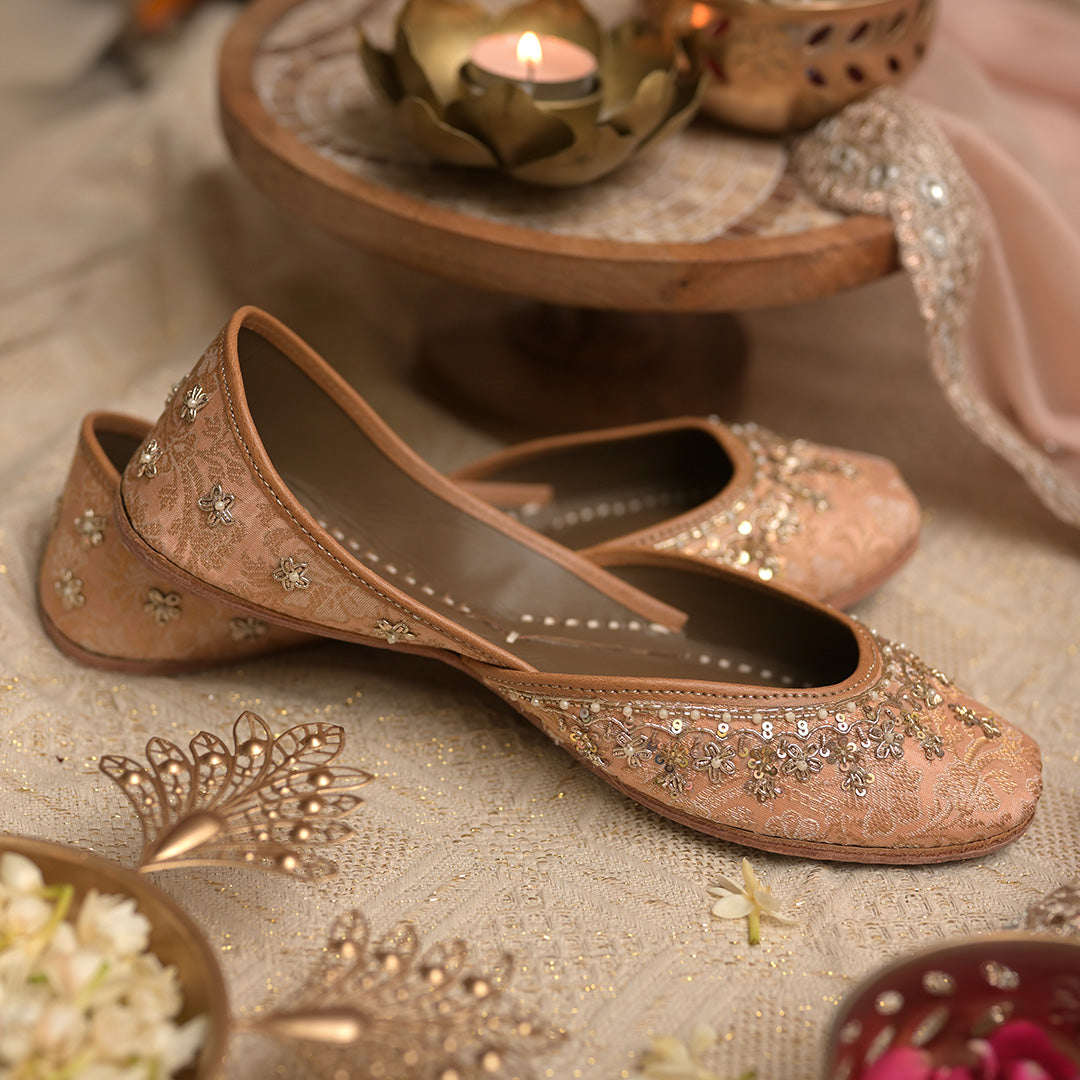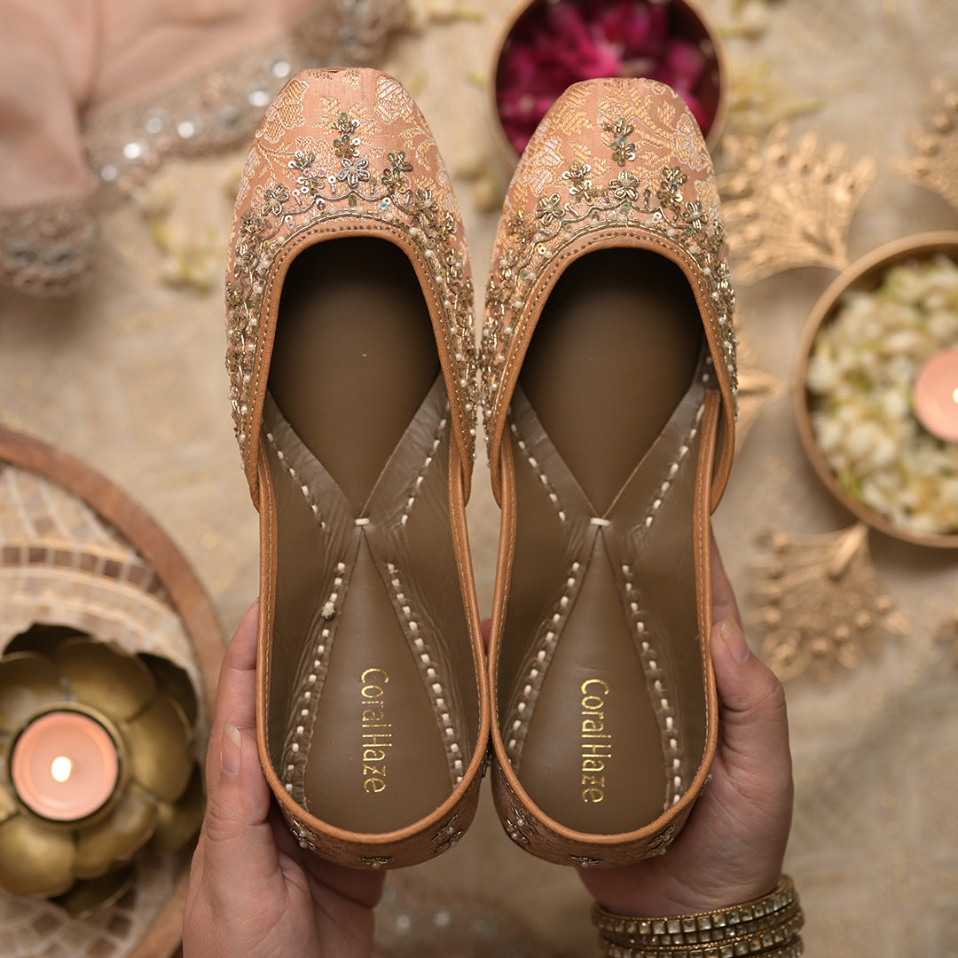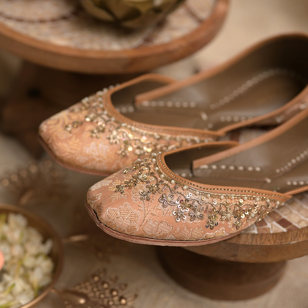Peach and gold brocade juttis with hand embroidered zardozi work on the front and scattered motifs at the back