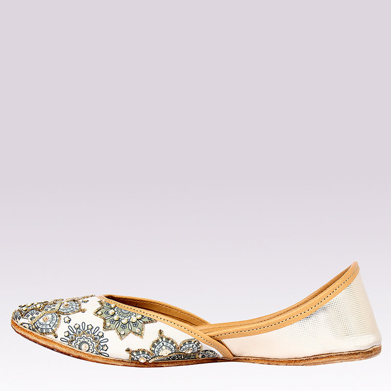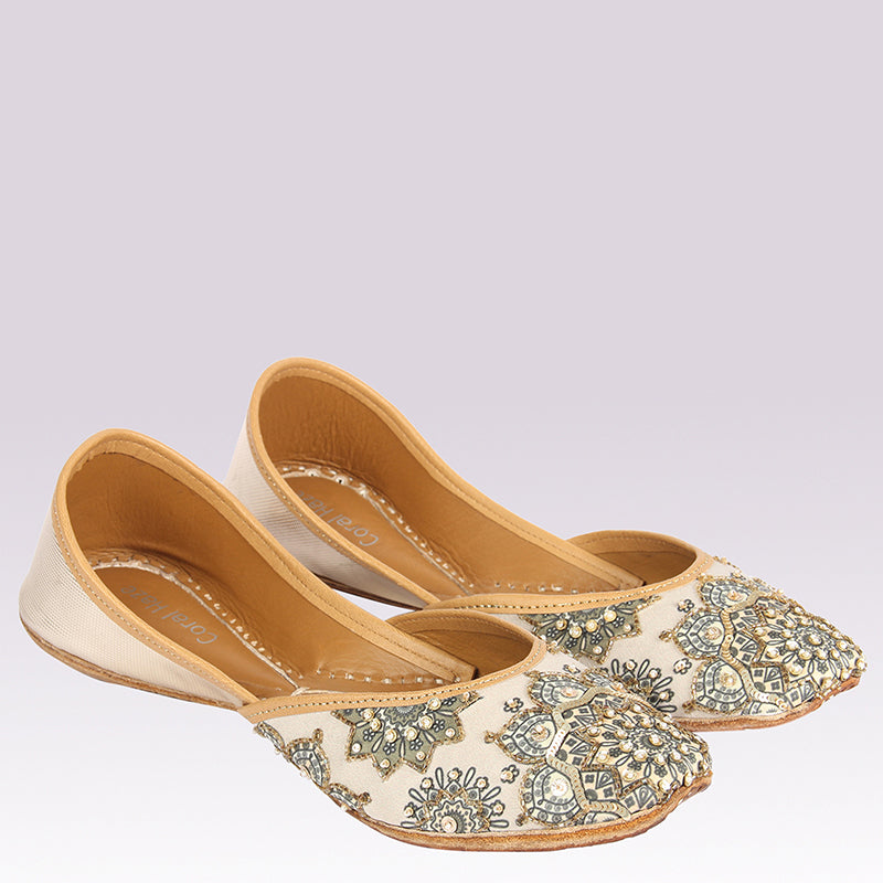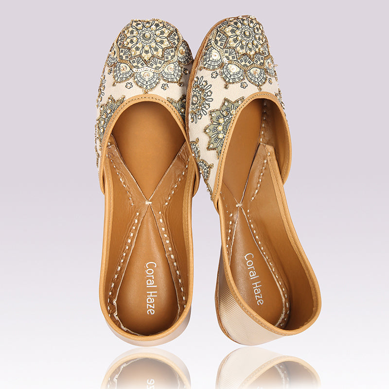 A delicate pair of eggshell white, silk juttis, accented with gold & white embellishments. The base fabric has a sinuous rendition of a mandala design printed in sage and black on the upper. The print is further highlighted, using circular gold sequins in various sizes, gold glass beads, and faux pearls. This particular style has a stunning champagne gold back.