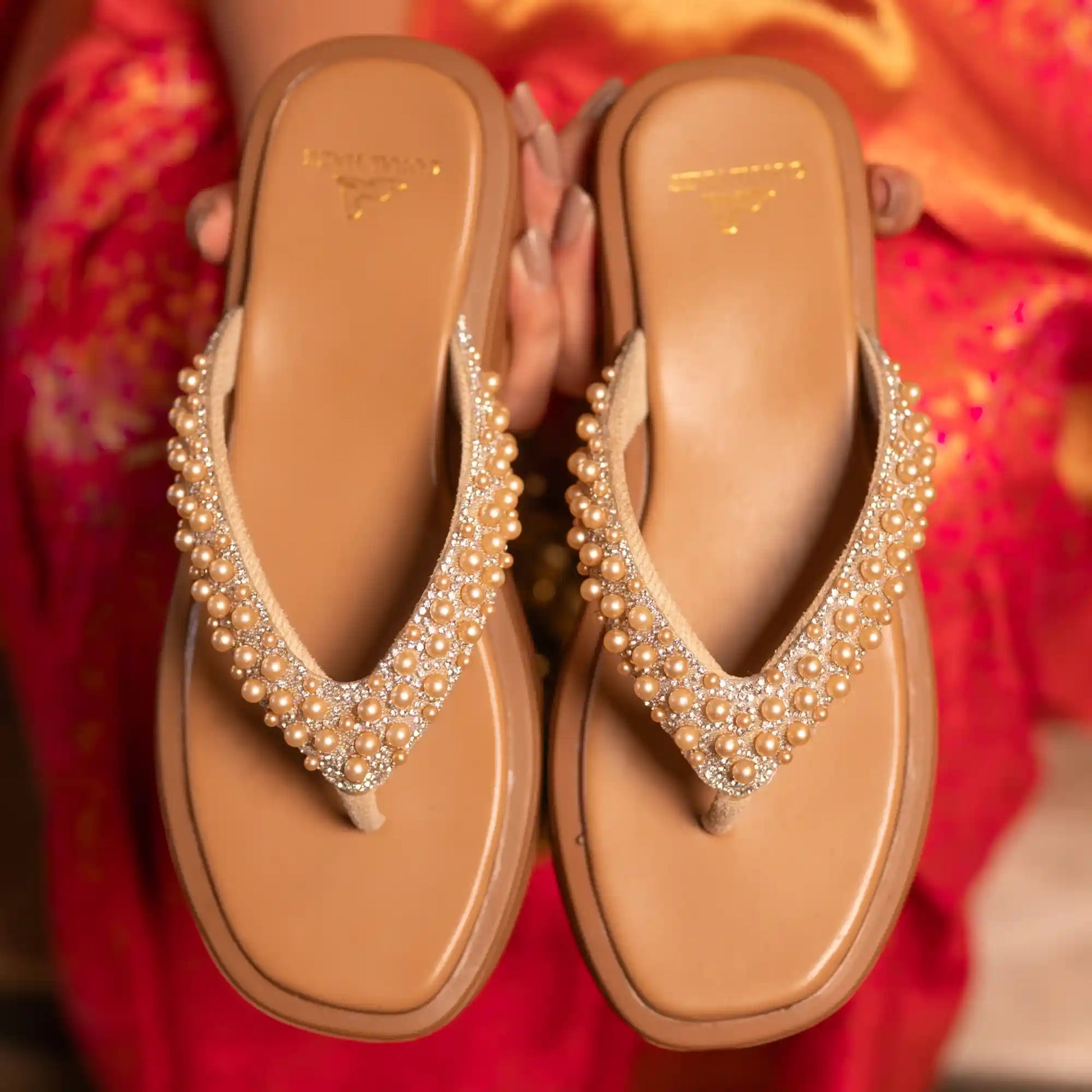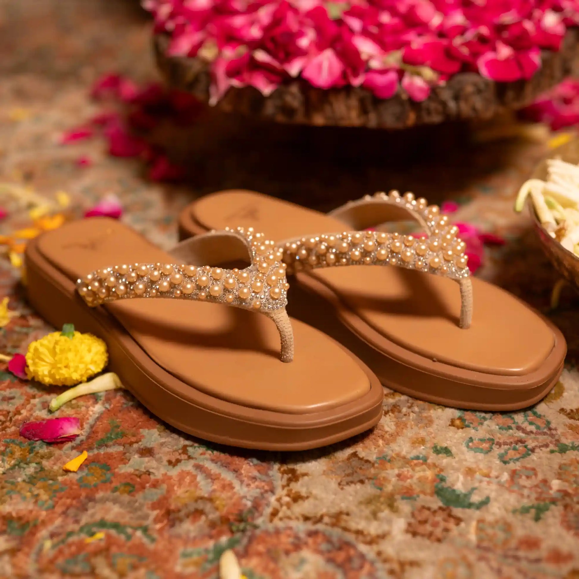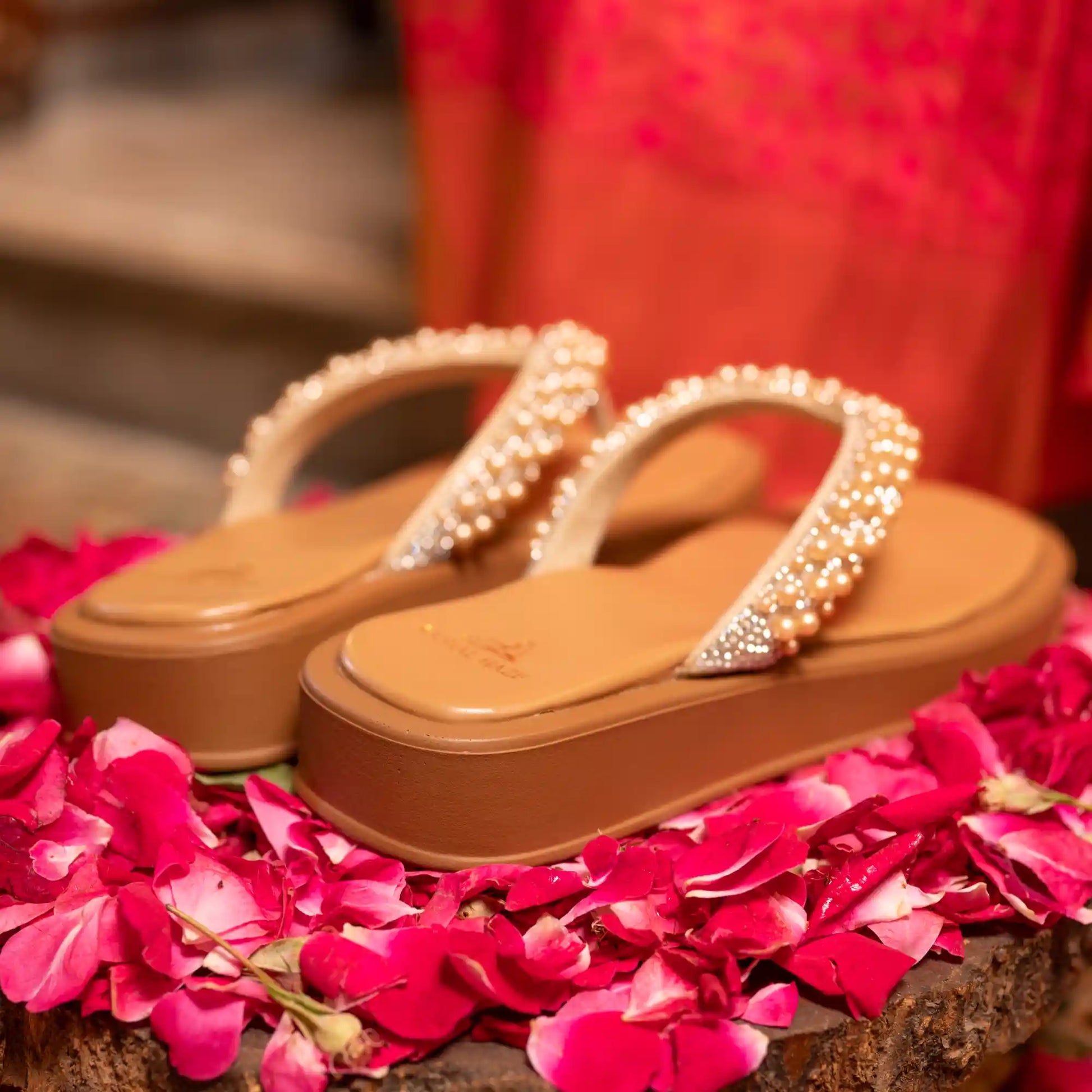 Beige gold v-strap platform sliders with rhinestones and pearls