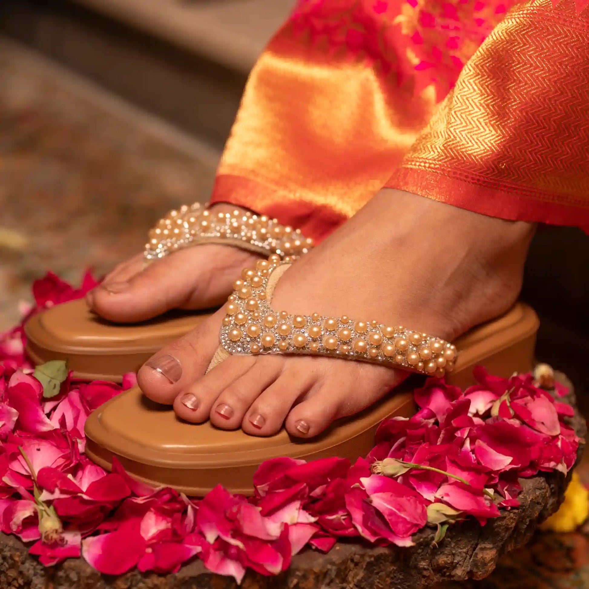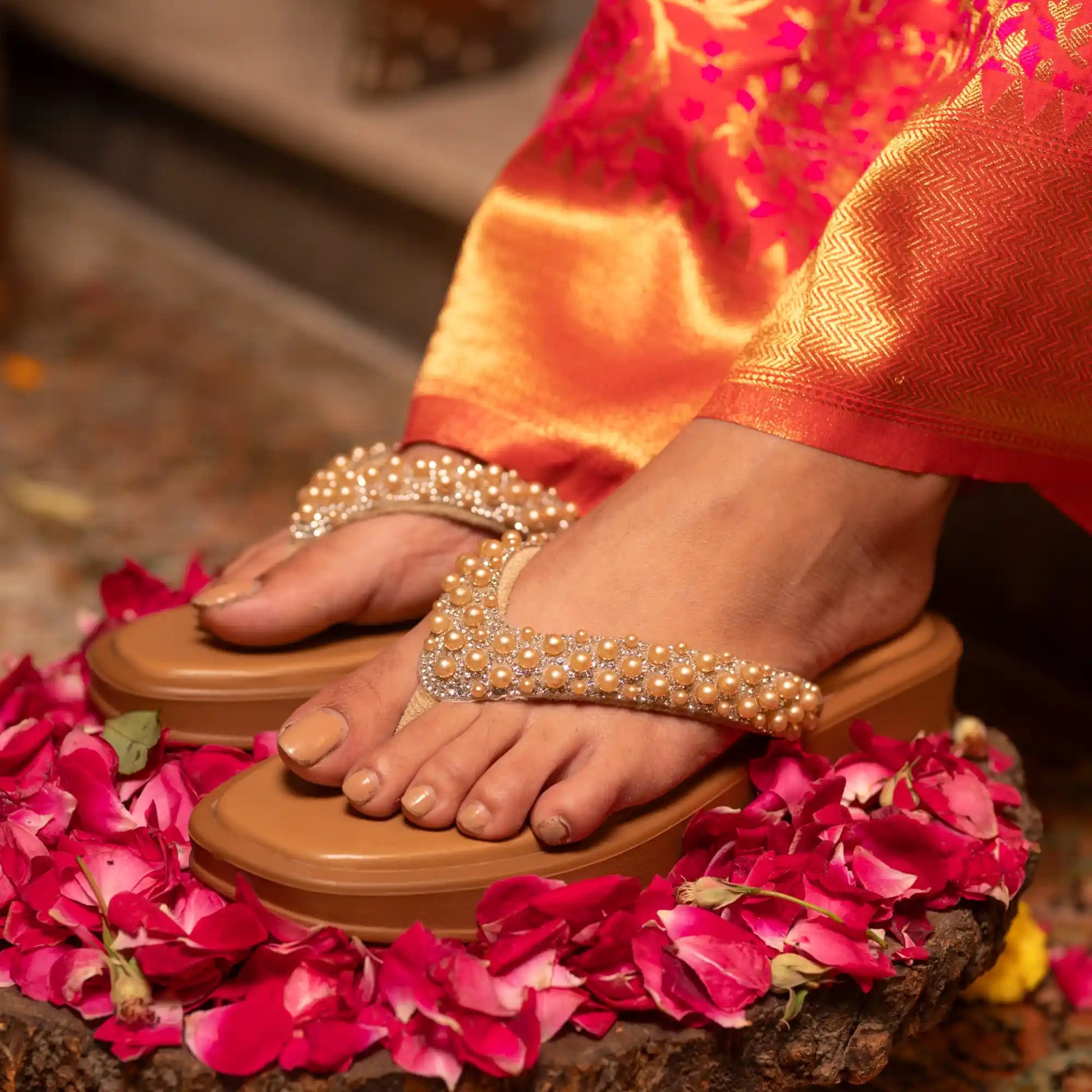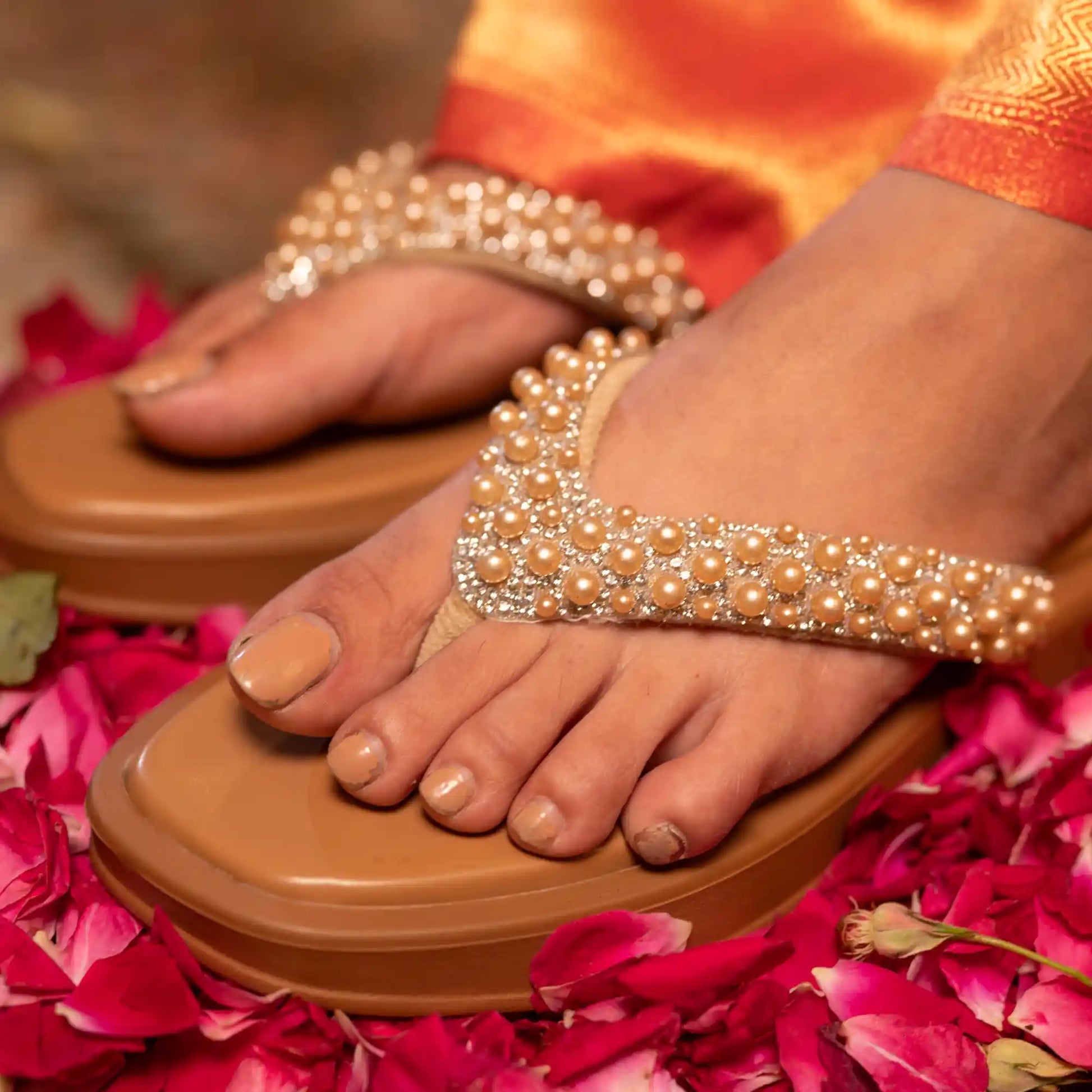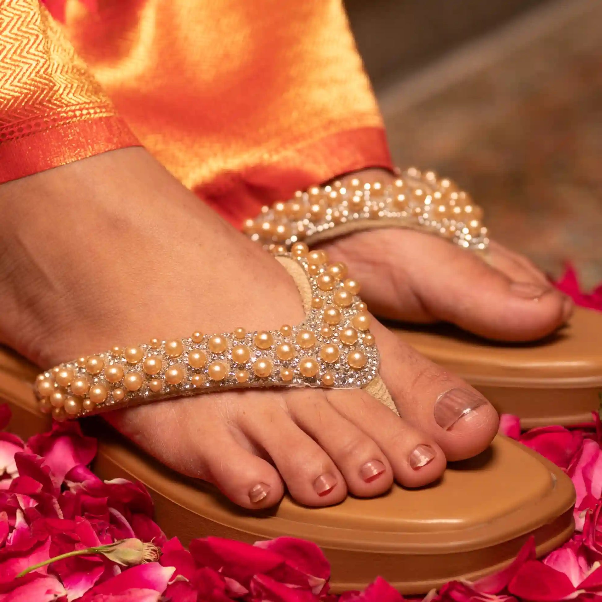 Beige gold v-strap platform sliders with rhinestones and pearls