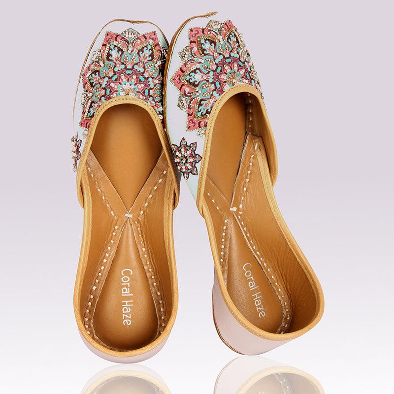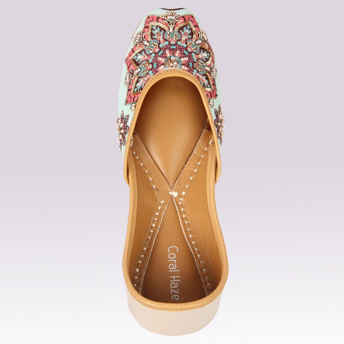 A calming pair of multi-colored silk juttis accented with gold & white embellishments. The ice blue base fabric has a sinuous mandala design printed on the upper. The print has pops of pinks, blues, and black in it that are further highlighted, using circular gold sequins in various sizes and gold glass beads and mini faux pearls. This particular style has a champagne gold back.