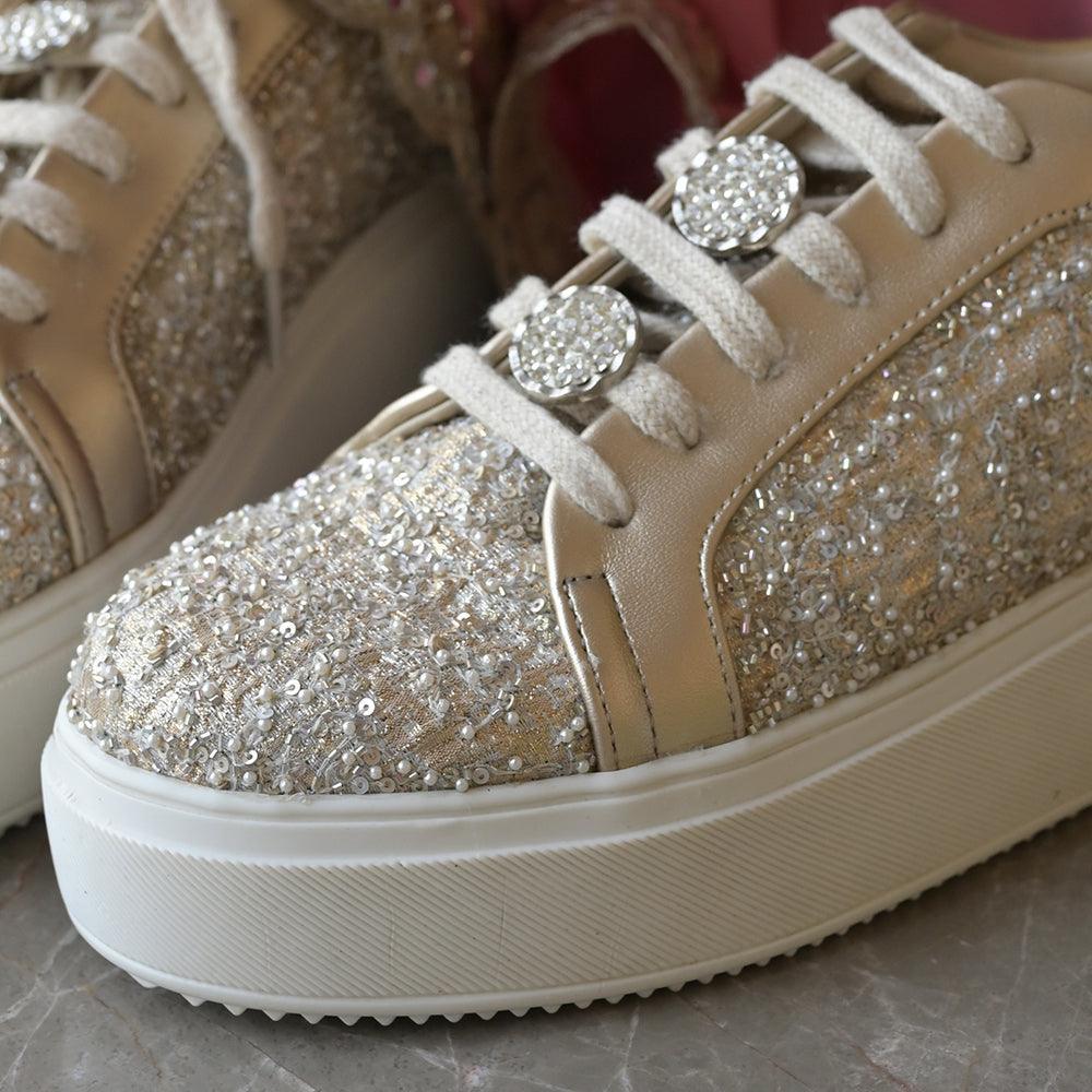 Light gold Jacquard sneakers with heeled soles, hand embroidered with gold glass beads, sequins and pearls, finished with gold leatherite trims and accessorized by rhinestone embellishments on the laces