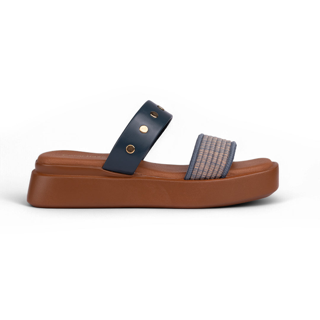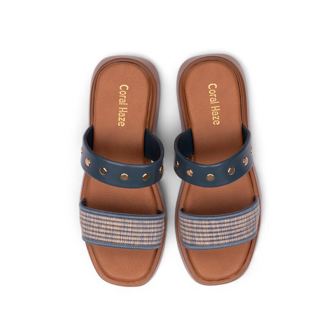 Denim blue dual strap platform sliders with gold rivets and woven thick lace
