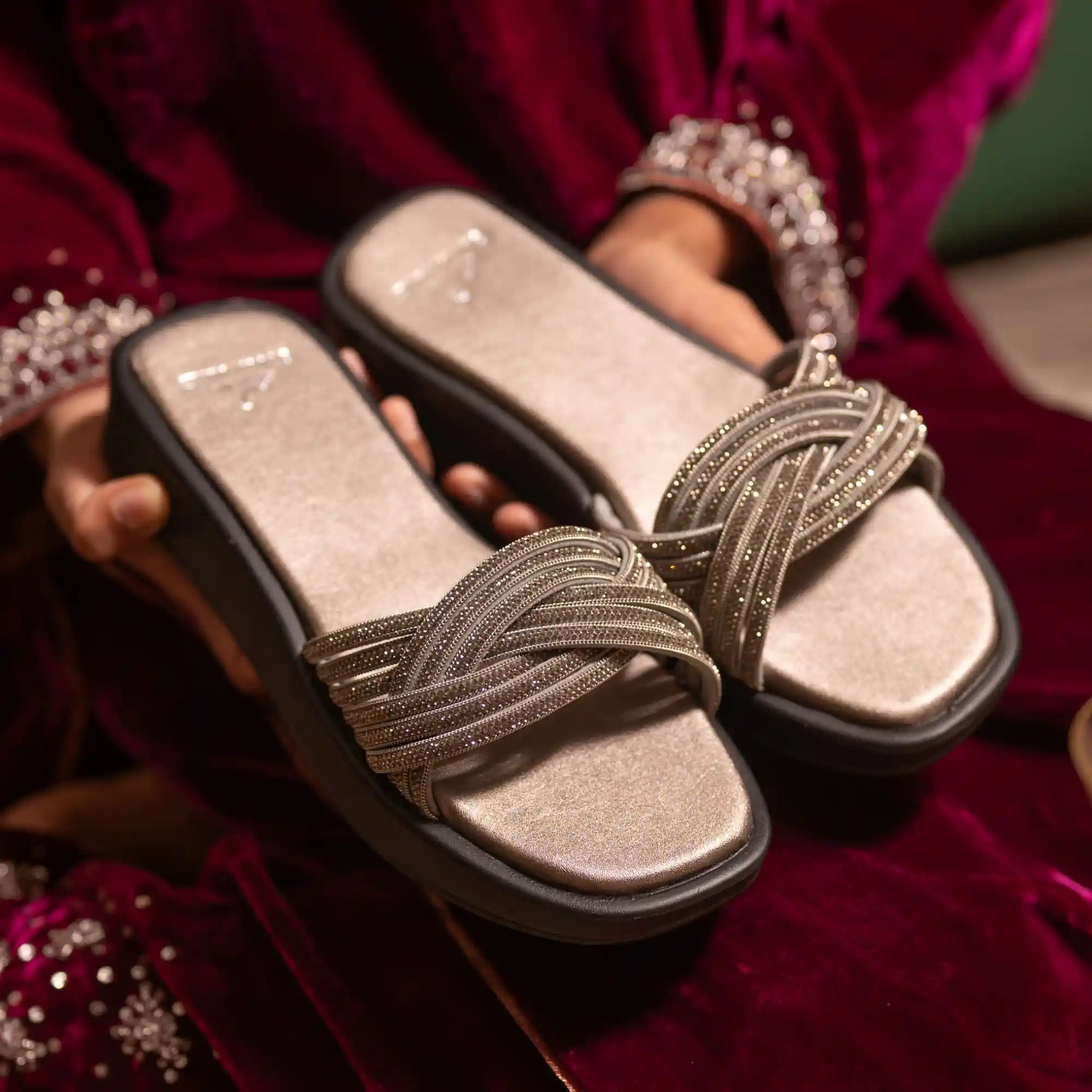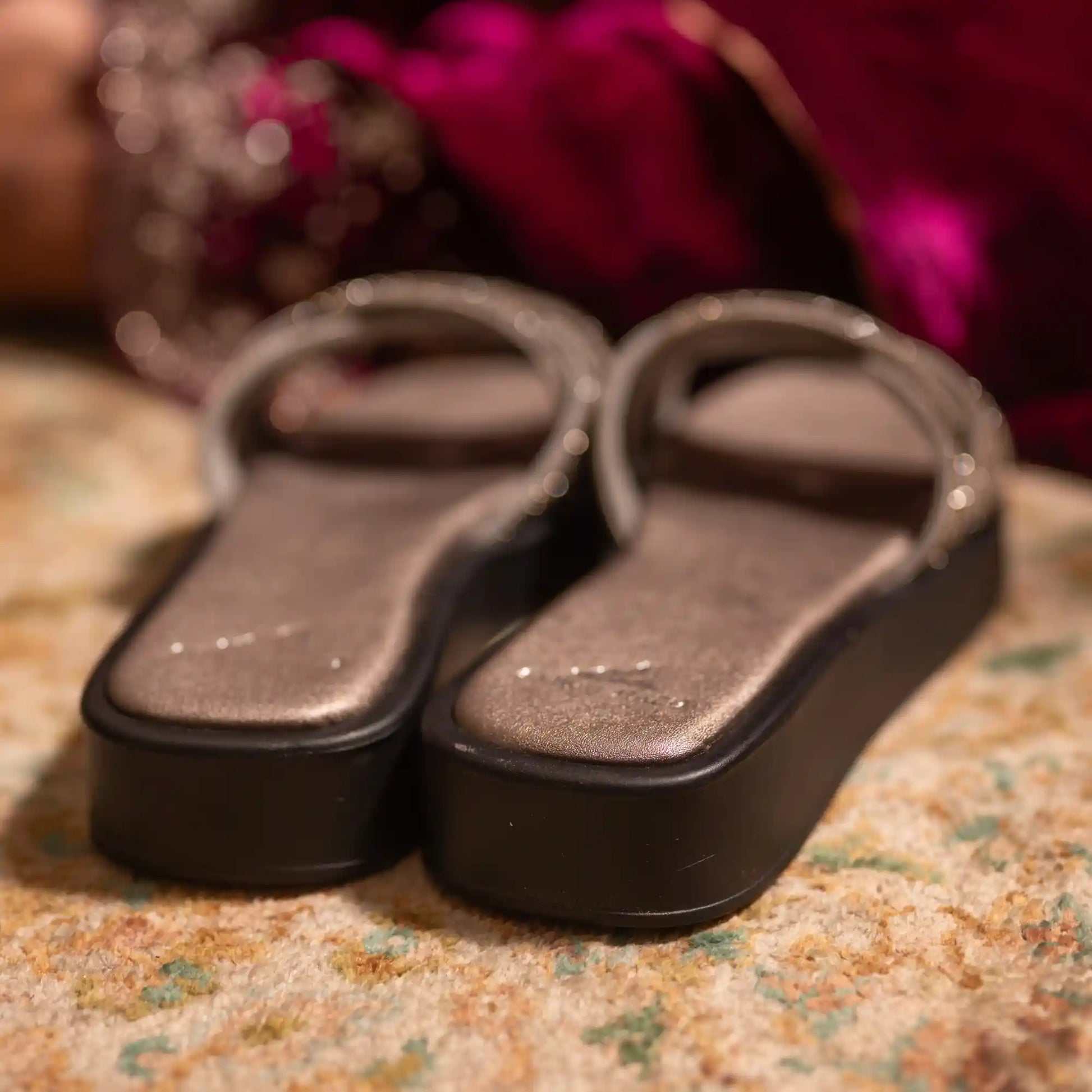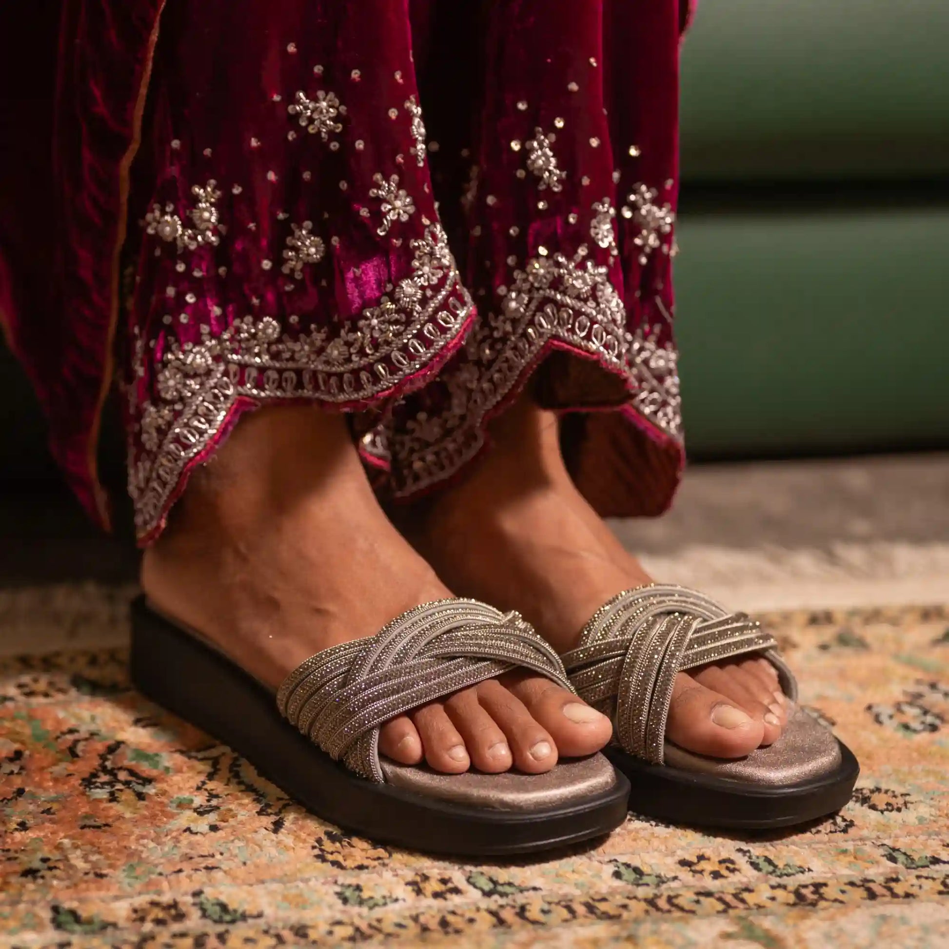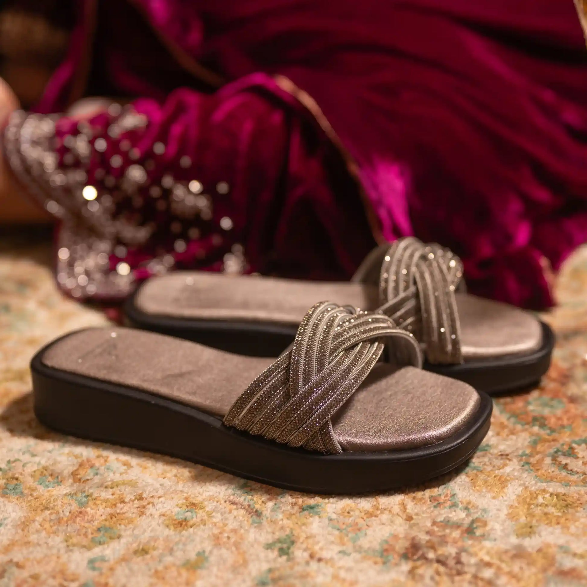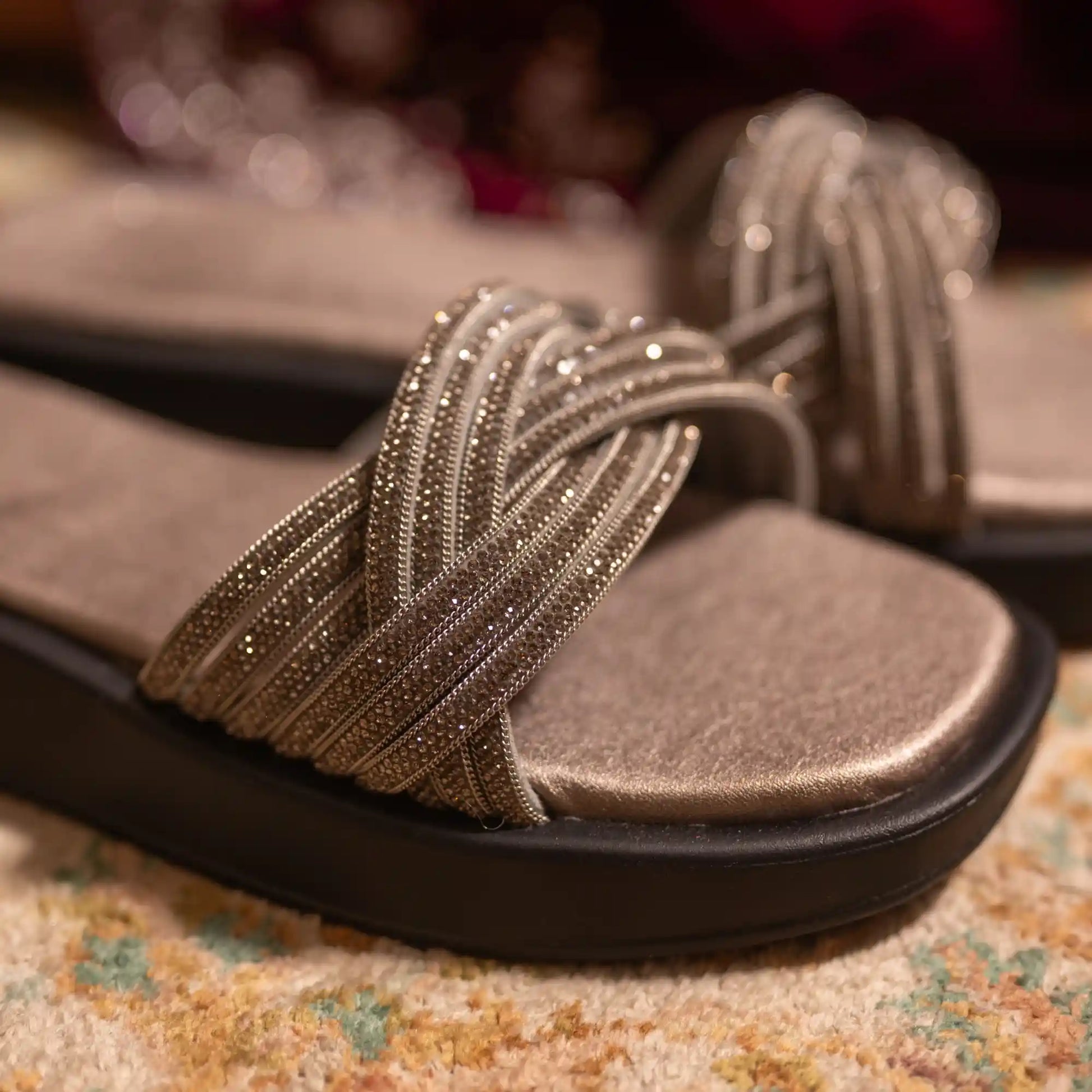 Gunmetal sliders with multiple rhinestone straps set in an overlap criss cross style