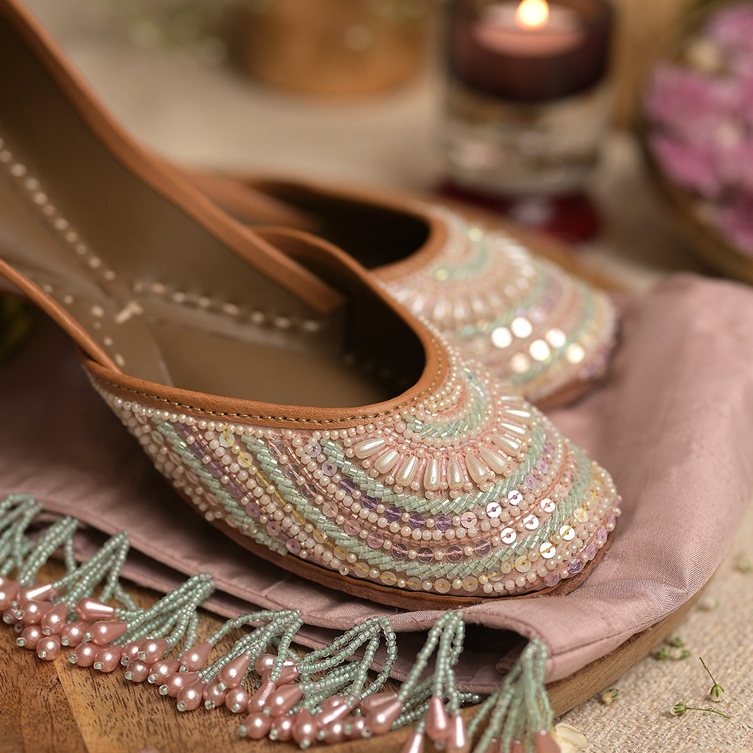 Pastel multi colored juttis with hand embroidered glass beads, pearls and sequins set in a circular pattern on front and back