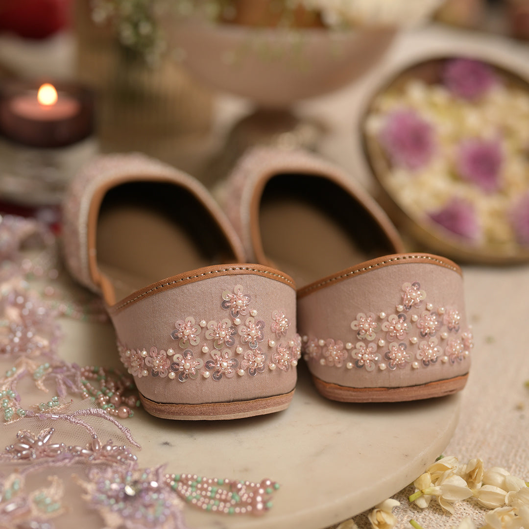 Blush pink colored juttis with tonal sequins work scattered on the front and back