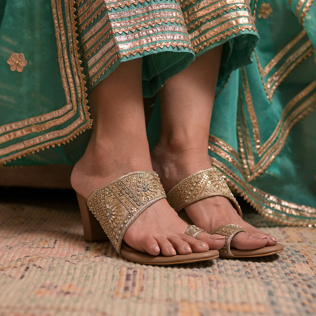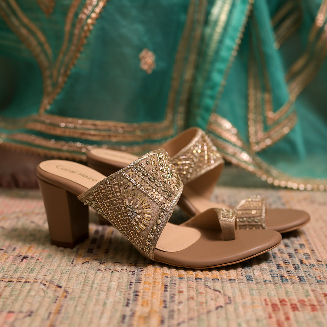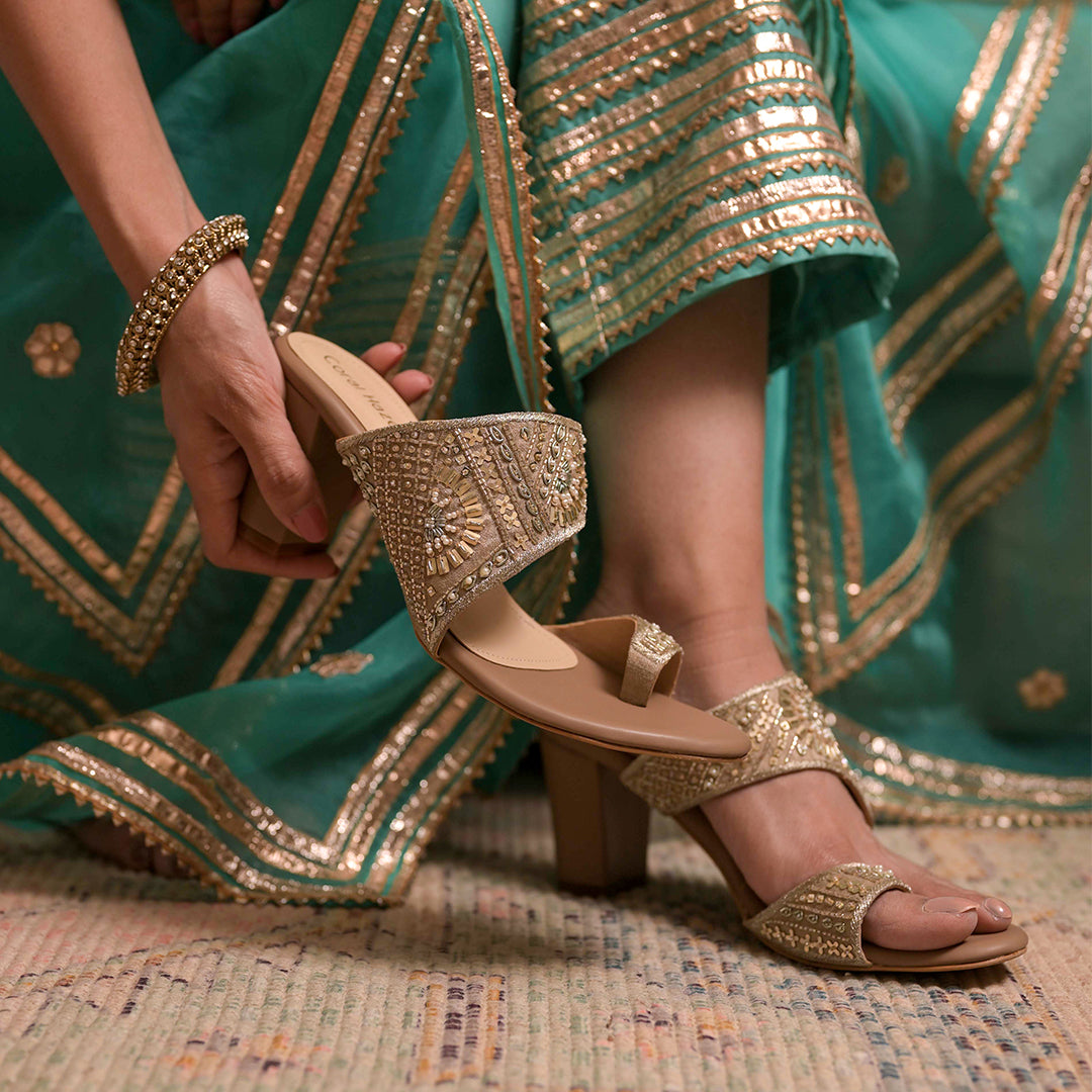 Bridal heels featuring intricate hand-embroidered zardozi work on a taupe base, designed with an asymmetrical strap and an embroidered thumb strap for a unique and stylish touch.