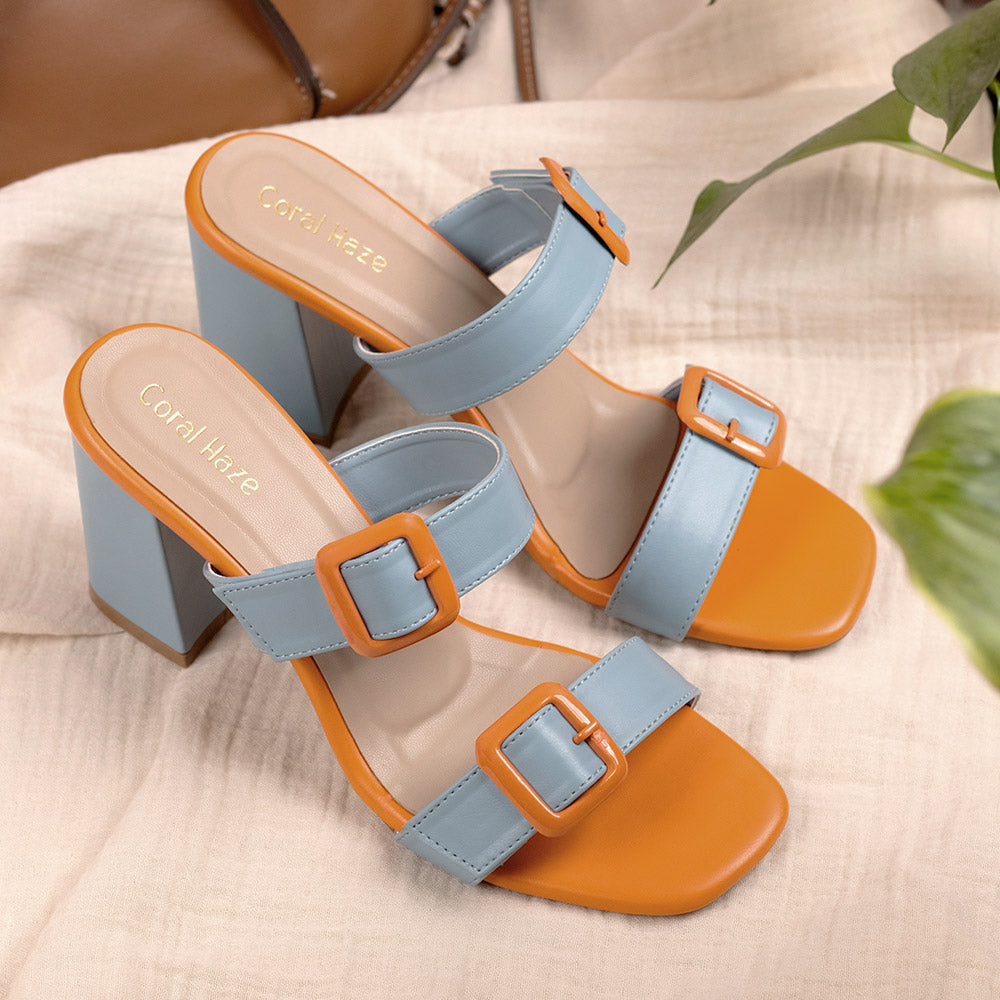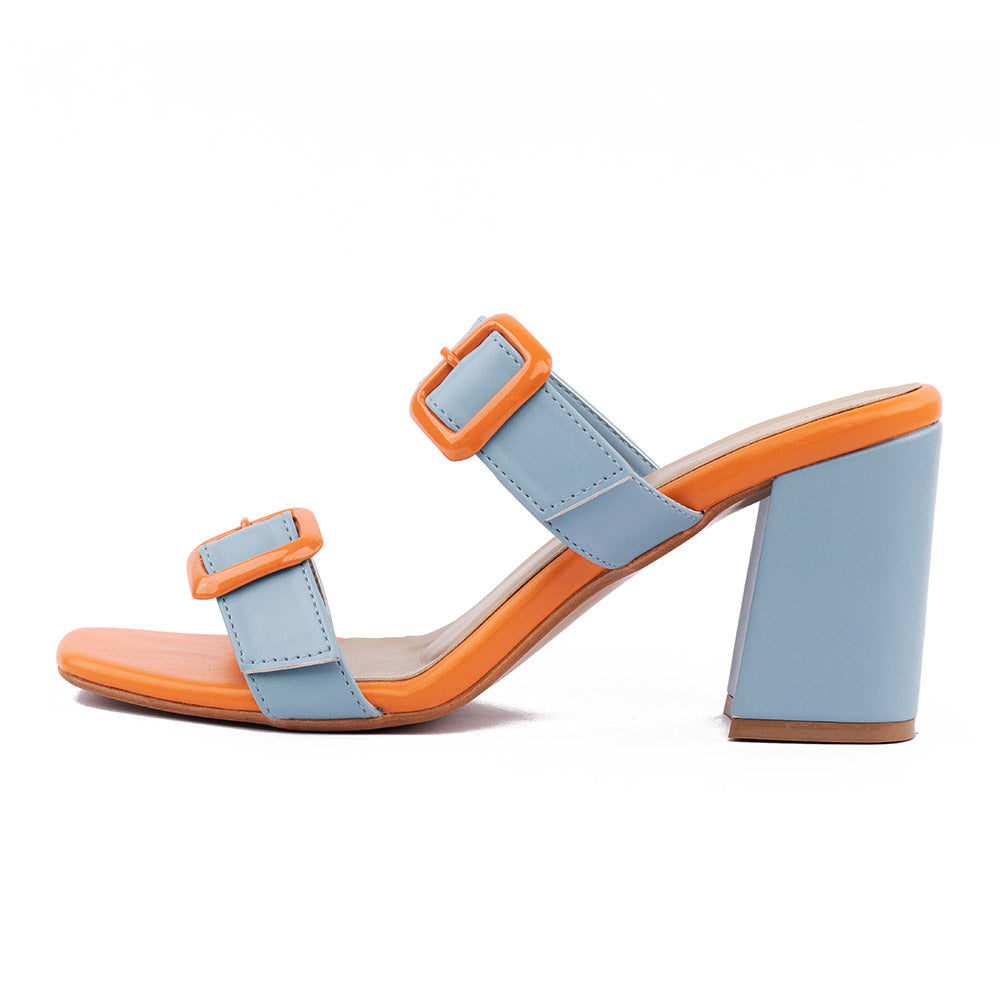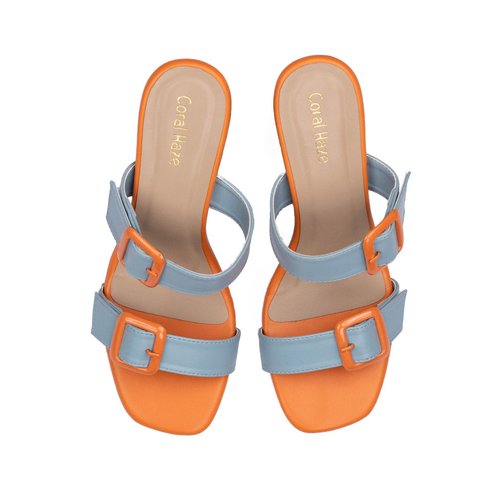 Orange and pale blue color block heels with contrast orange buckle detailing