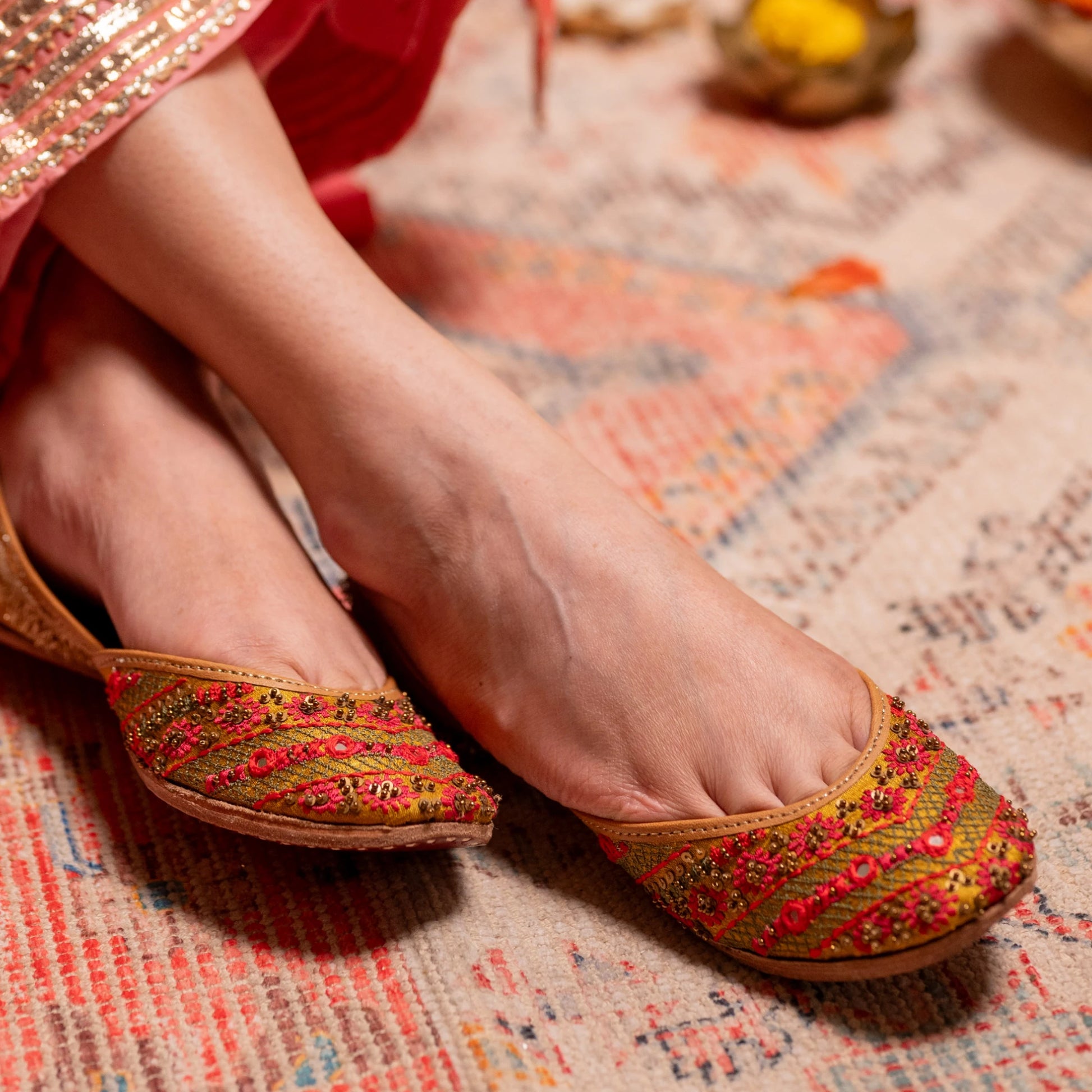 Mustard yellow juttis with contrast threadwork, mirrors and sequins, highlighted with fringe lace detailing at the back