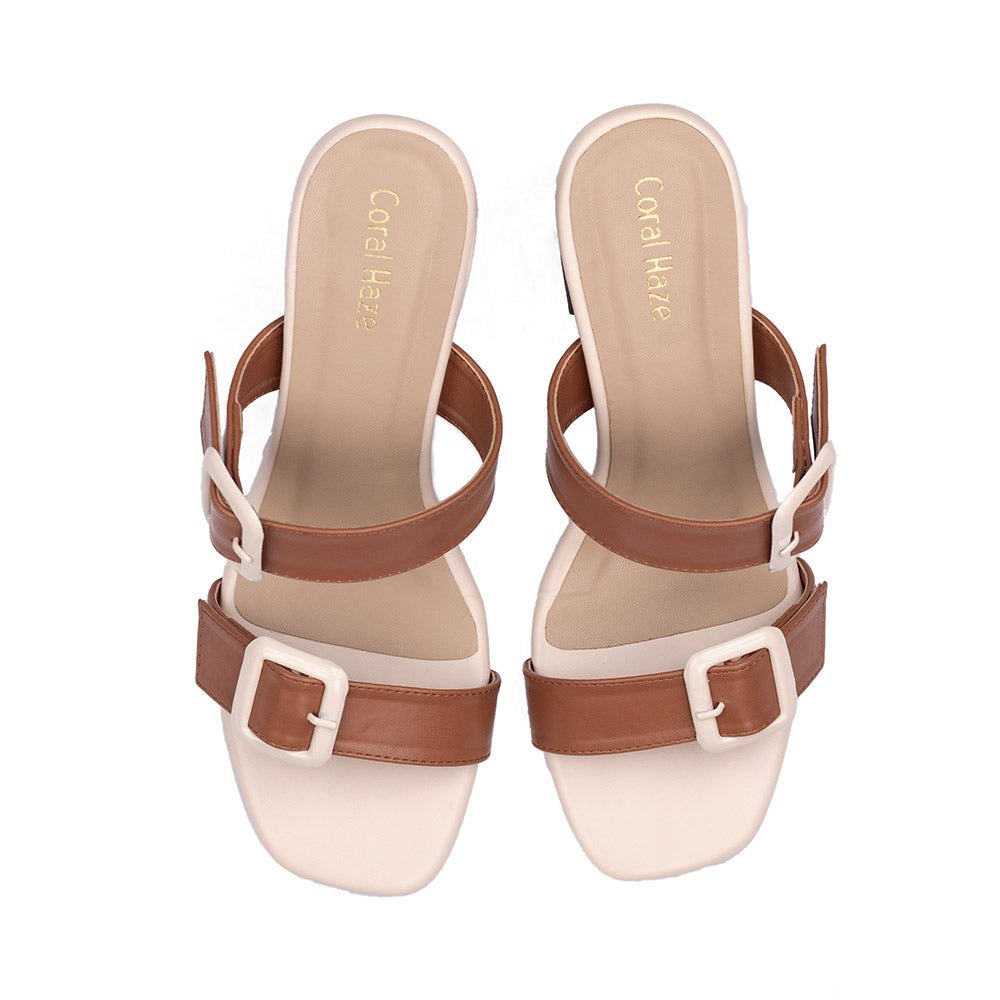 Ivory and tan color block heels with contrast ivory buckle detailing