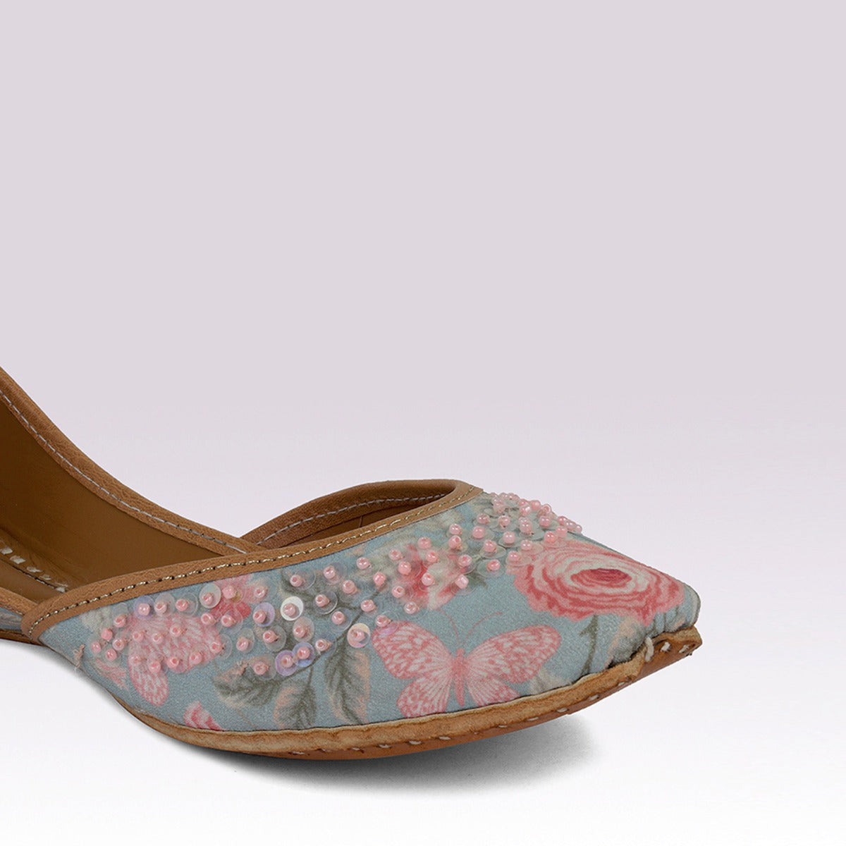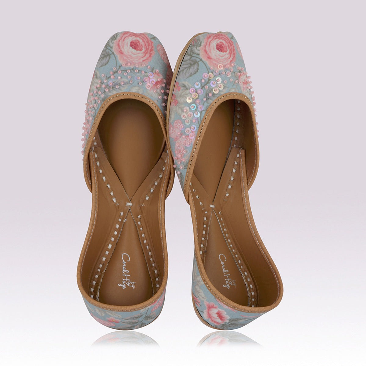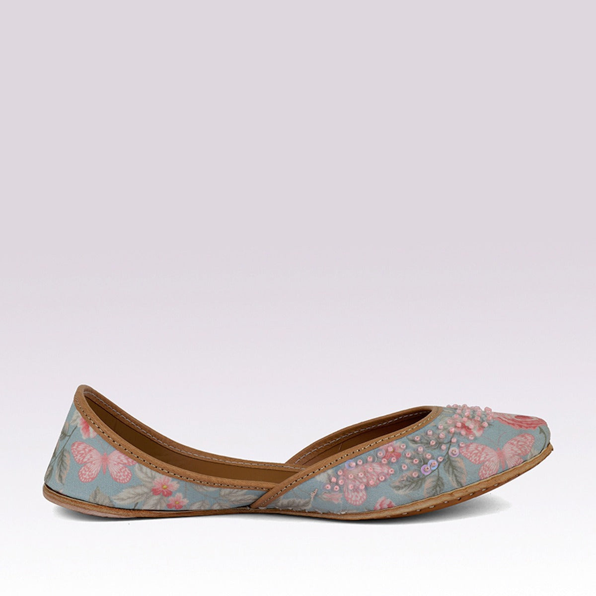 Pale mint blue floral print with translucent sequence and pink beads on the border