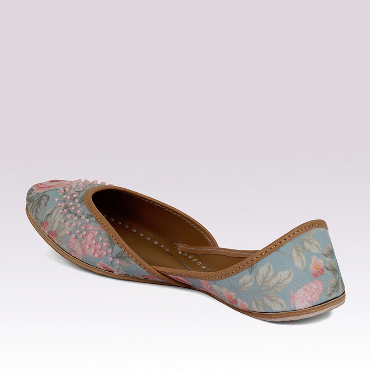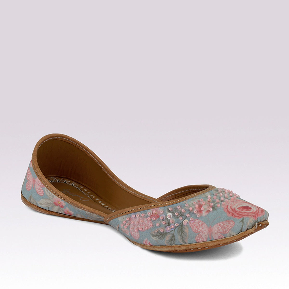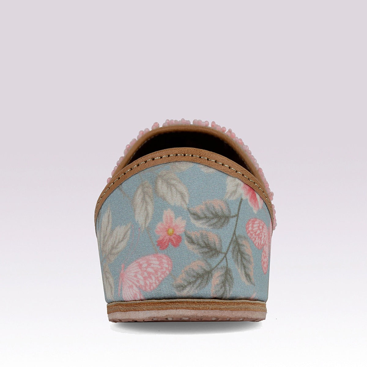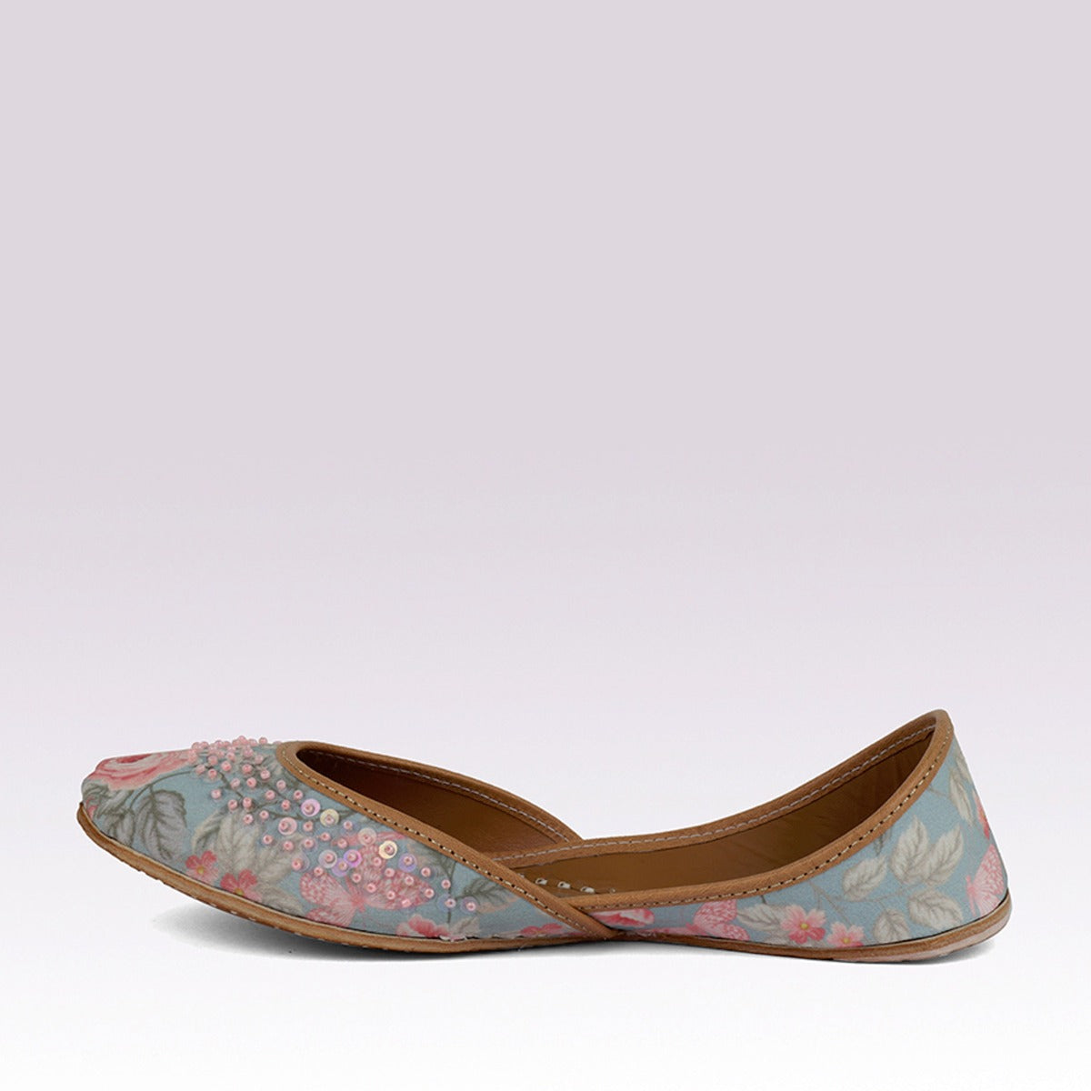 Pale mint blue floral print with translucent sequence and pink beads on the border
